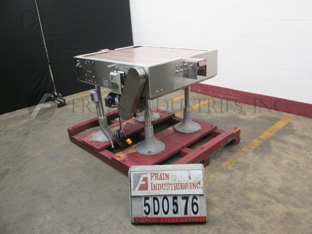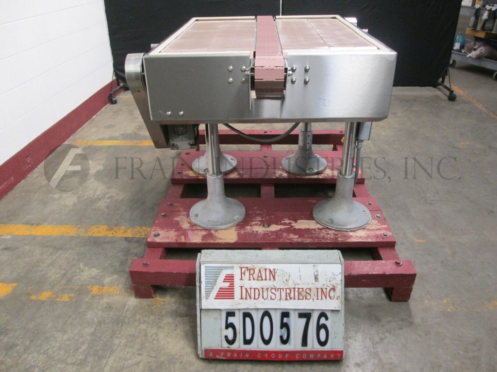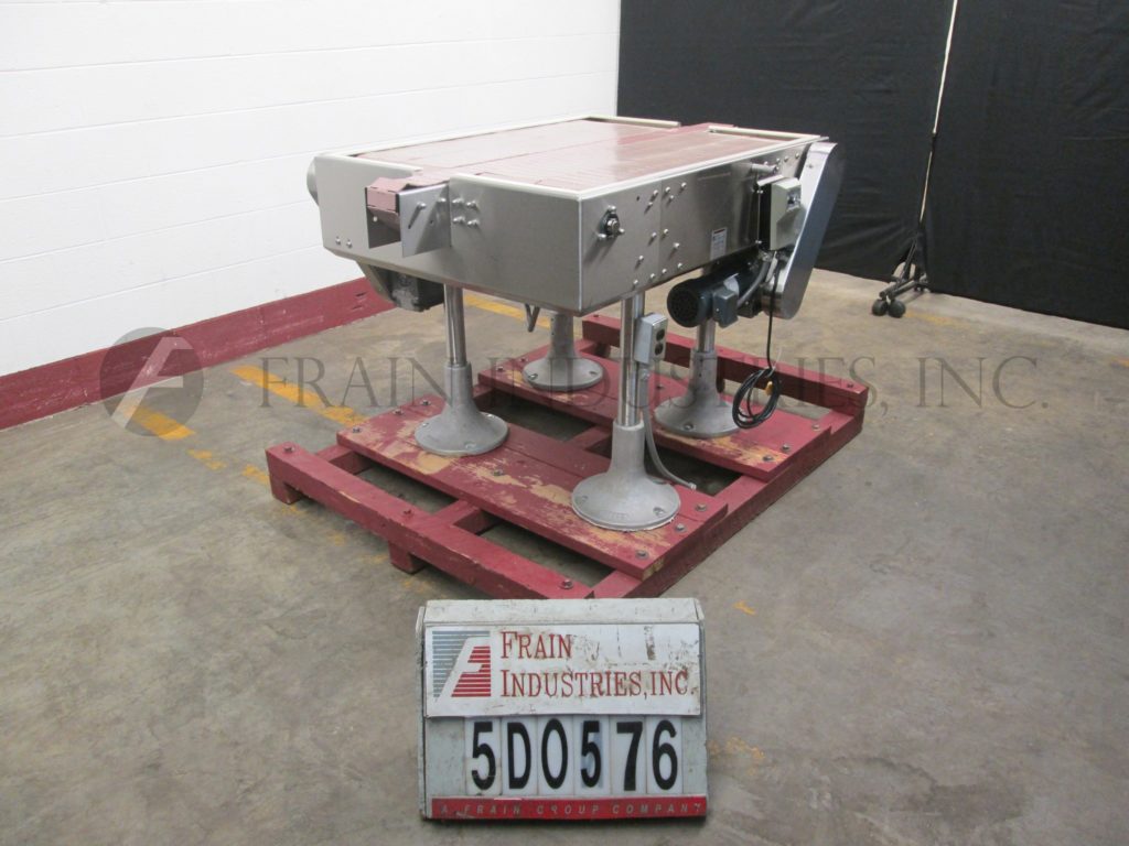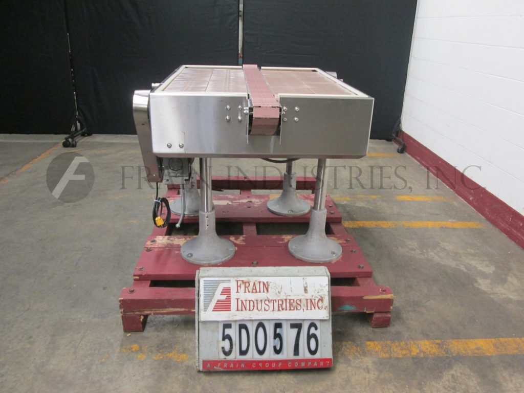 Garvey, 3 ' L x 28"W蓄能器(2)28"L x 12"W侧输送机和(1)2 ' L x 3 1/4"W中央输送机。可调高度的腿。外径:46"长x 40"宽x 46"高