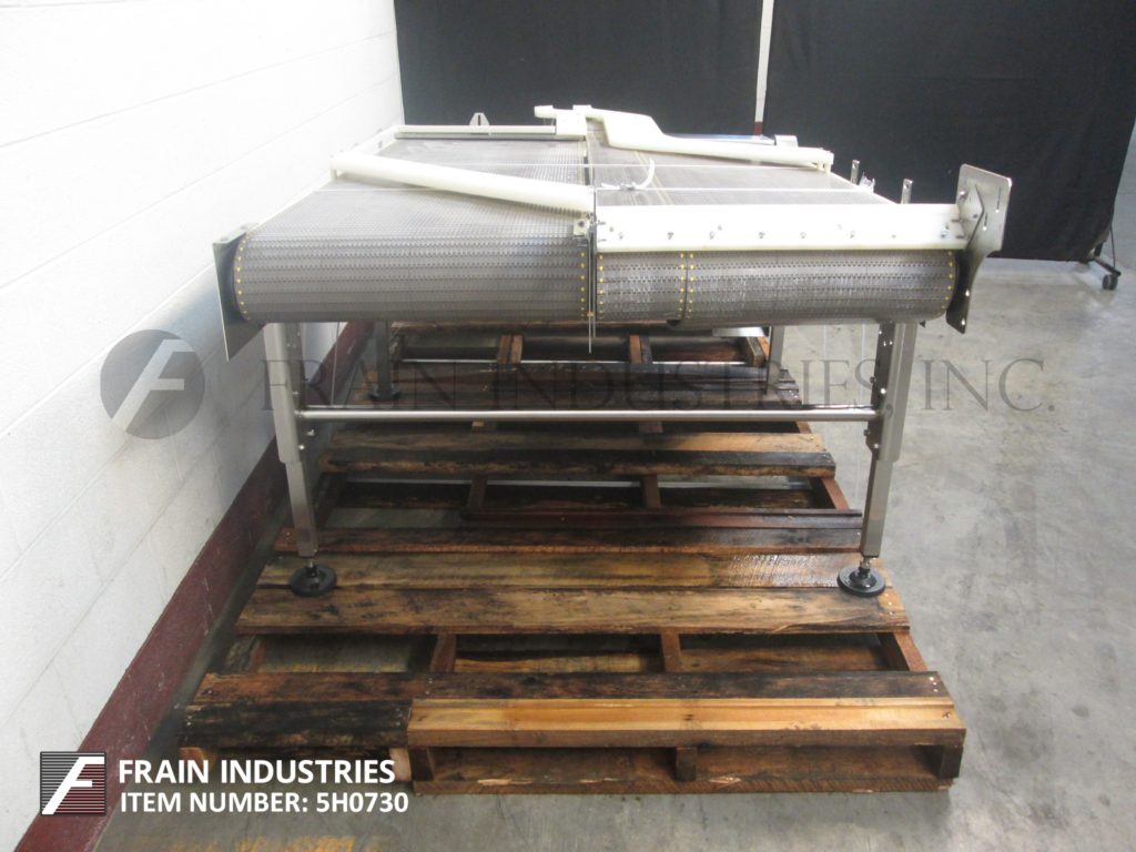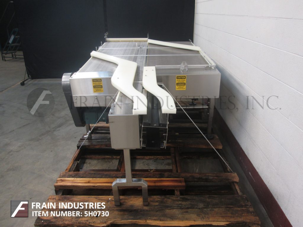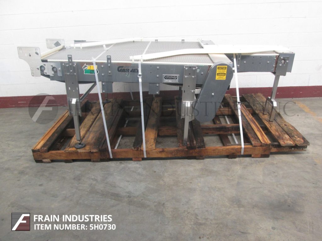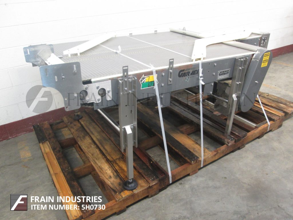 返回所有设备Garvey, 4700型,不锈钢,台式皮带堆积输送机。配备6"宽x 92"长平顶Intralox产品饲料输送机,(1)18"宽x 63"长和(1)24"宽x 63"长双向积累带饲料到产品输送机。安装在不锈钢底座上,支架高度可调。