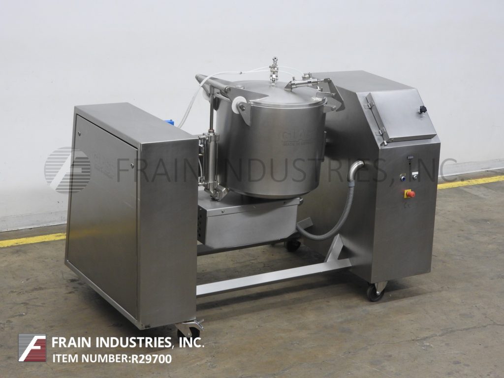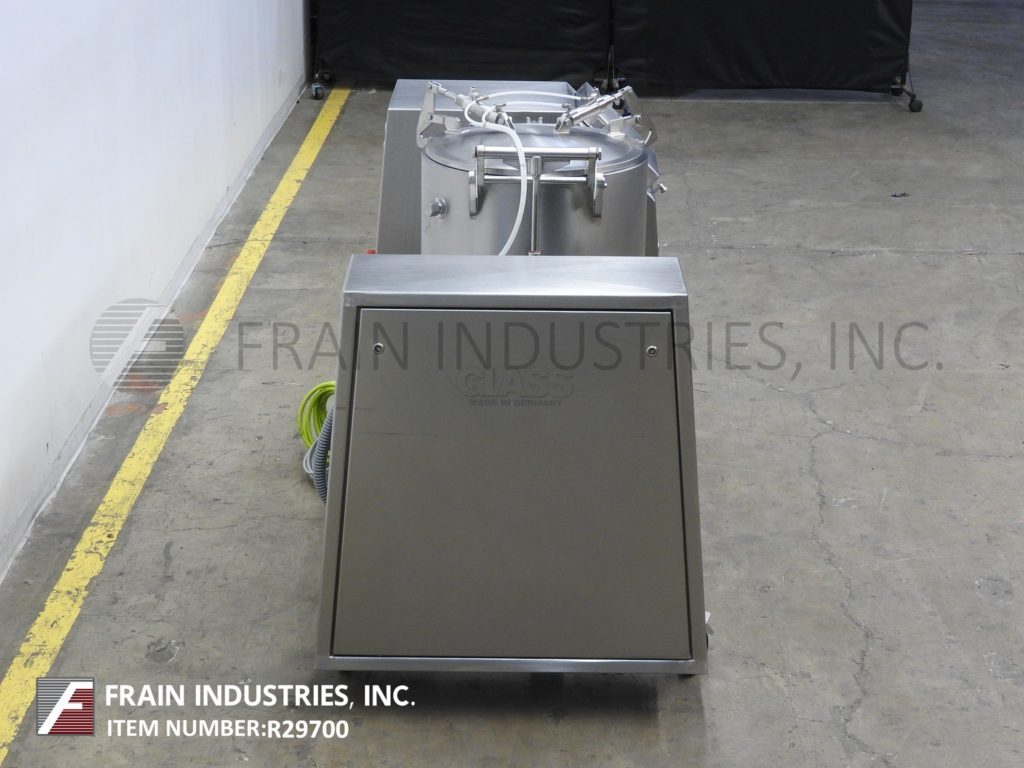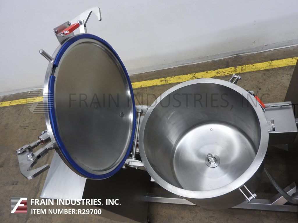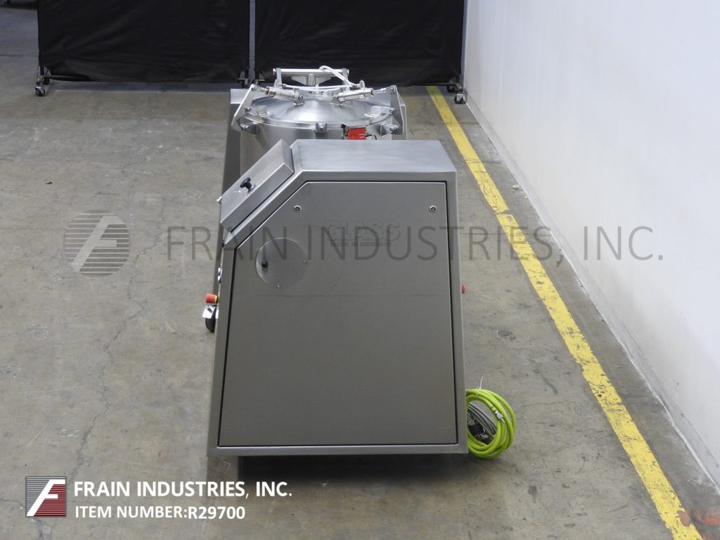 返回所有设备玻璃型号VSM / F 150,150升,不锈钢,垂直,低压夹套真空搅拌机,蒸汽注射。每小时磅产品 - 取决于材料,应用,机器配置和操作员灵活性。配备__“ID X __”深不锈钢混合碗,90°Pnuematic倾斜,自动打开和闭合螺栓盖,搅拌臂和侧壁刮板,卫生密封件,5个HP电机驱动和集成真空泵。控制面板具有触摸面板控制器,具有工艺数据记录并运行左/右混合挡板,电机快速,带有真空开/关开关缓慢,停止按钮控制。安装在不锈钢基架上,带脚轮和平整腿。