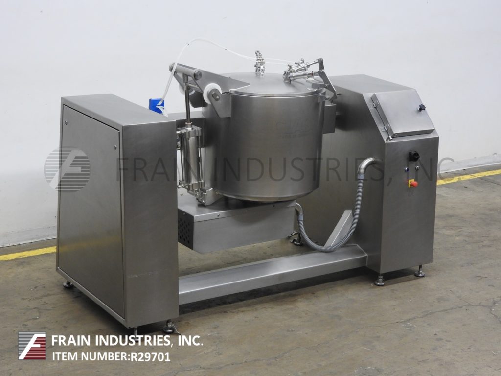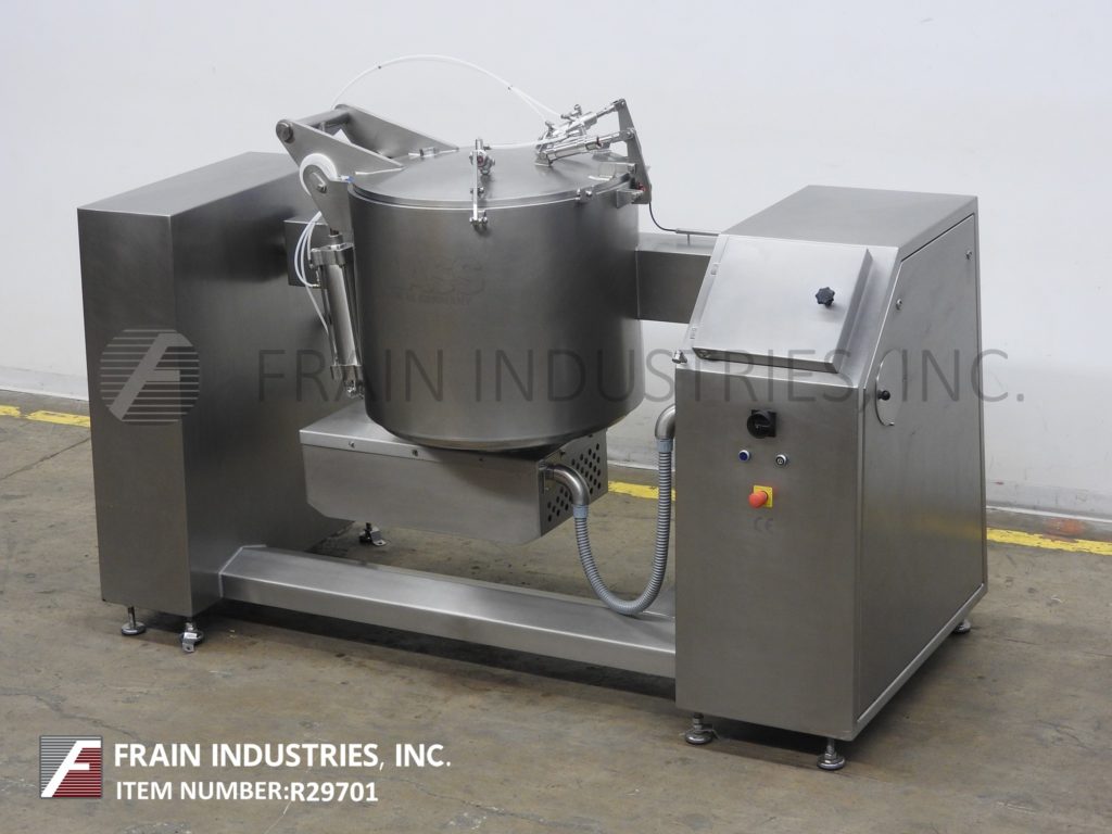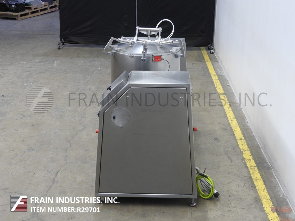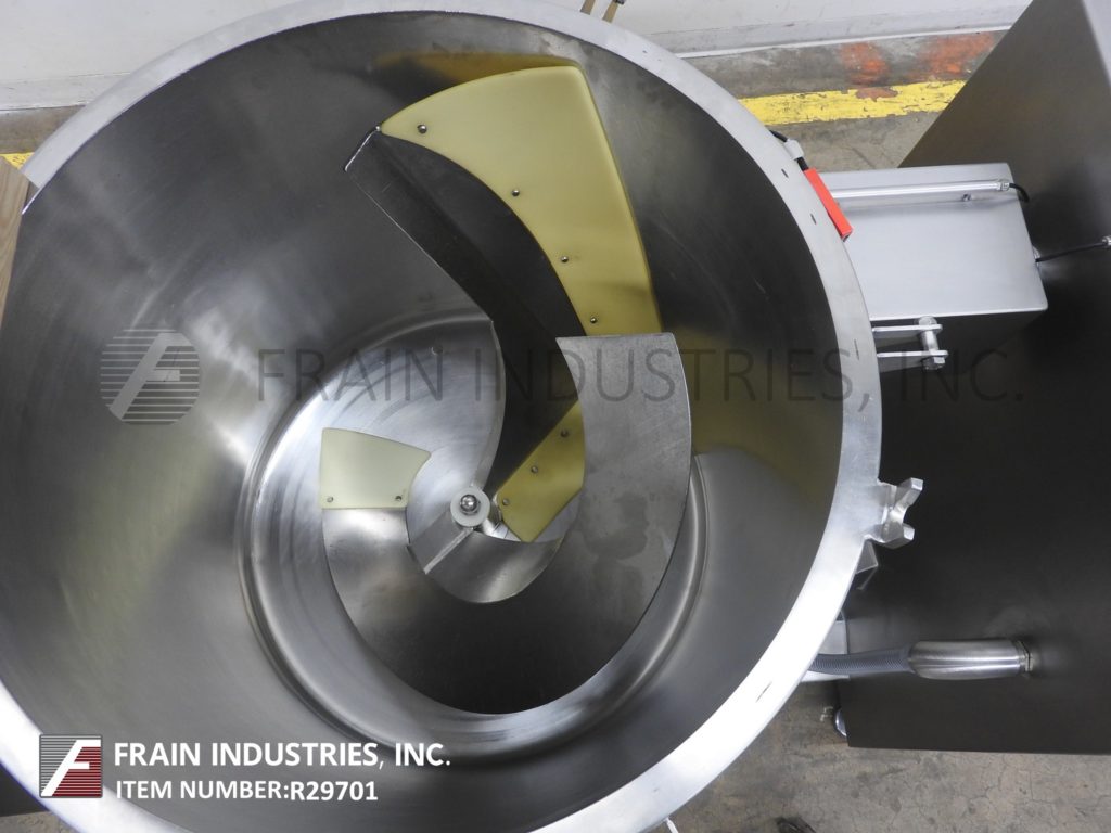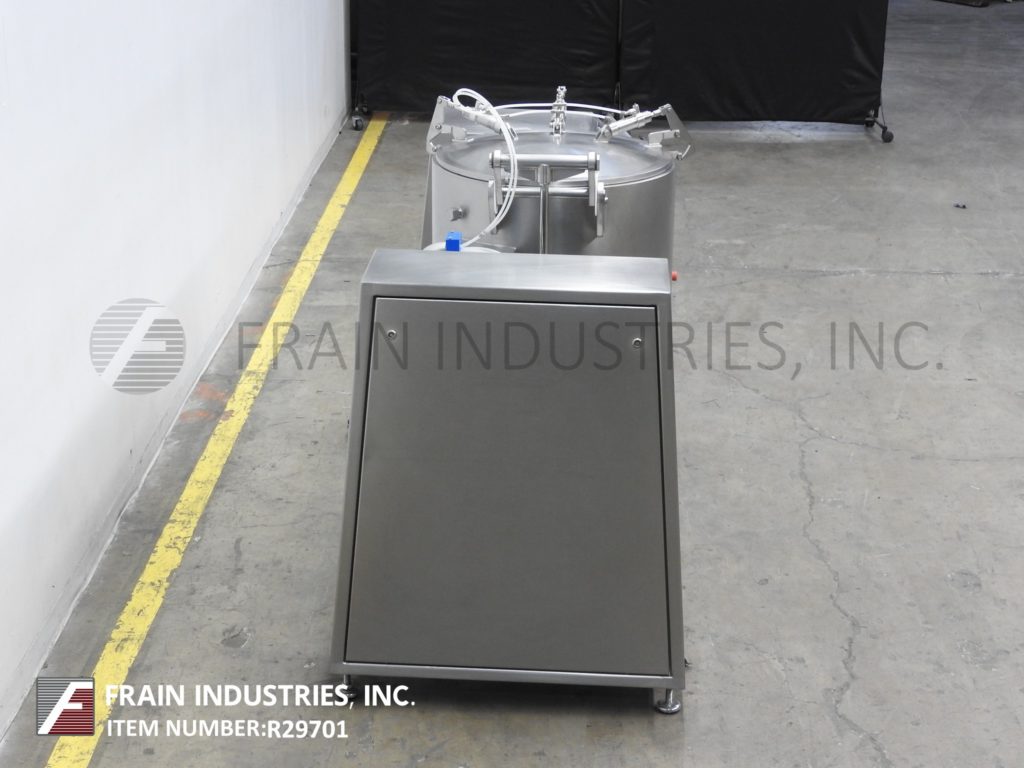 返回所有设备玻璃型号VSM/F 300, 300升,不锈钢,垂直,低压夹套真空蒸汽喷射混合器。每小时产品的重量-取决于材料,应用,机器配置和操作熟练程度。配备29" ID x 29"深不锈钢搅拌碗,90°气动倾斜,自动开启和关闭螺栓下盖,搅拌臂,卫生密封侧壁刮板,5马力电机驱动和集成真空泵。控制面板有触摸屏控制器,具有工艺数据记录和运行左/右混合挡板,电机快,慢,真空开/关开关和停止按钮控制。安装在不锈钢底座框架与脚轮和调平腿。