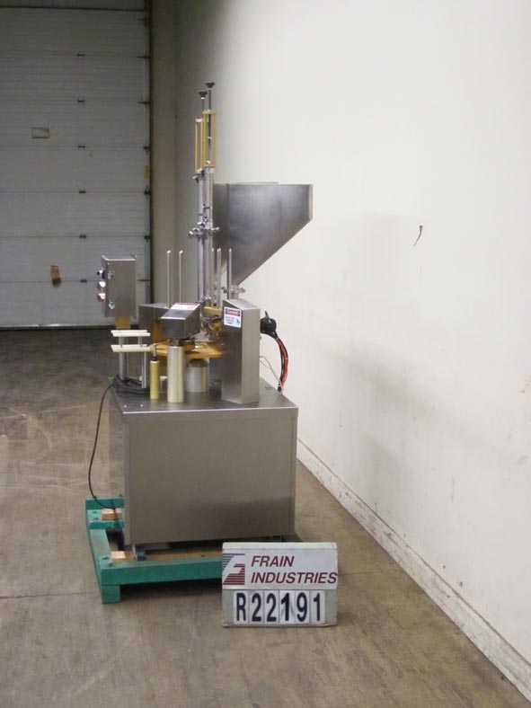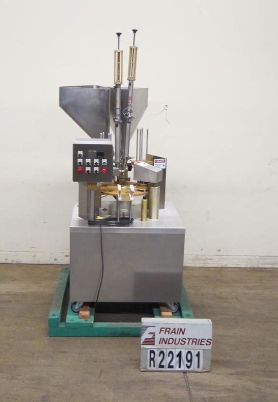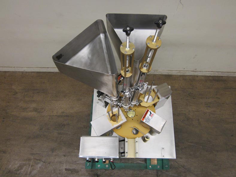 自动,不锈钢,旋转杯填料额定高达30 cpm -取决于材料和应用。配有旋转工作台、杯脱粉器、产品料斗、活塞式加料站、模切箔防篡改热封站和扫臂卸料站。