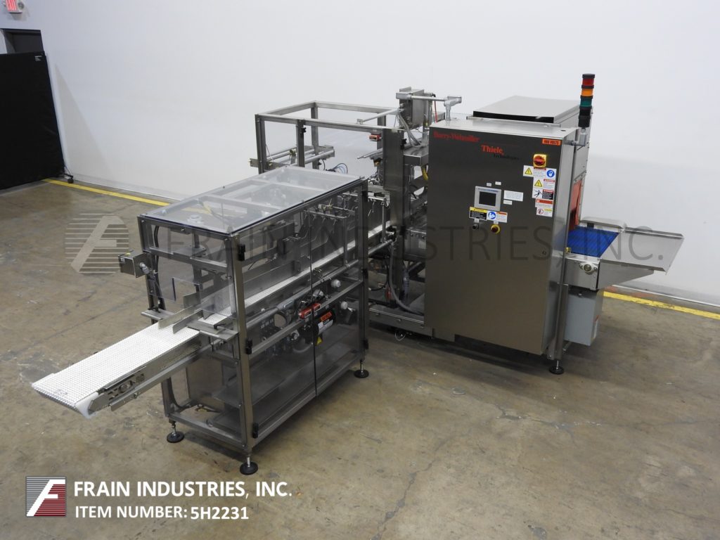 Back to All EquipmentBarry Wehmiller, Model ZB20A, right angle shrink bundling system with lane in feed. Rated from 5 to 30 bundles per minute – depending on materials, application and machine configuration. Maximum product height: 12"; maximum film width: 20". Equipped with 12" wide x 126" long Intralox in feed conveyor with 1 to 4 lane overhead servo diverter, single product pusher plate, 20" wide hot knife seal bar with 12" vertical travel, tamp bundle hold down, stainless steel shrink tunnel with 24" wide x 16" high aperture and 27" long chamber with 24" wide x 50" long thru belt conveyor. Control panel with an AB controller with AB PanelView Plus 600 touch screen display. All stainless steel frame and enclosure with lexan doors and machine leveling screws and pads.