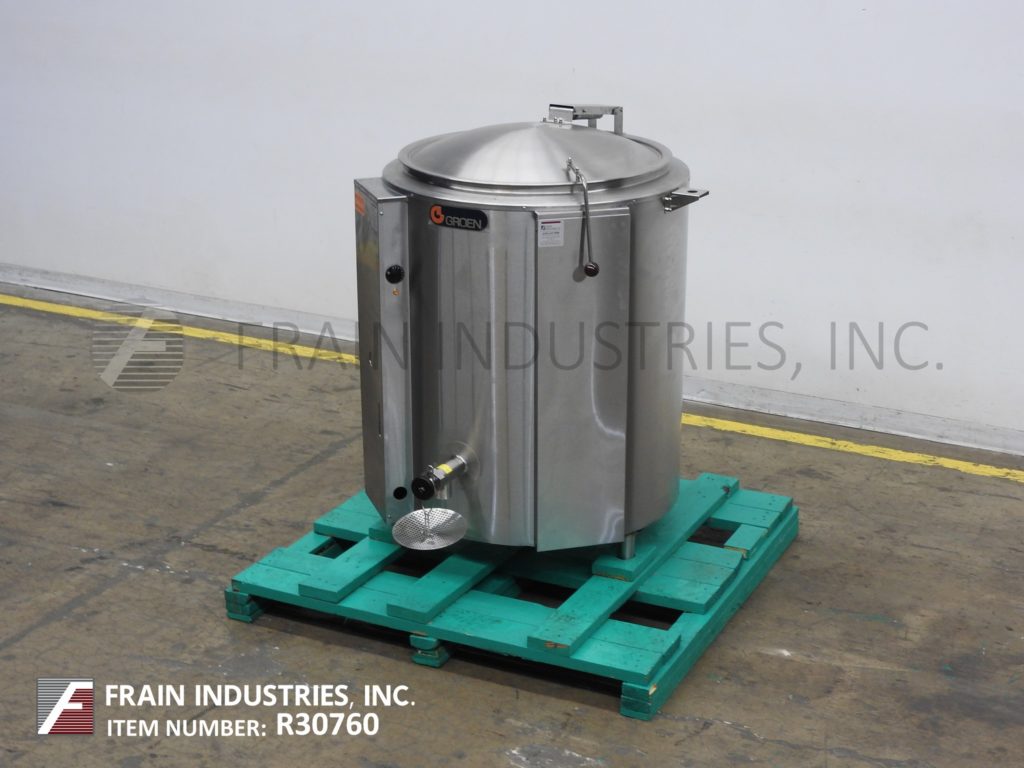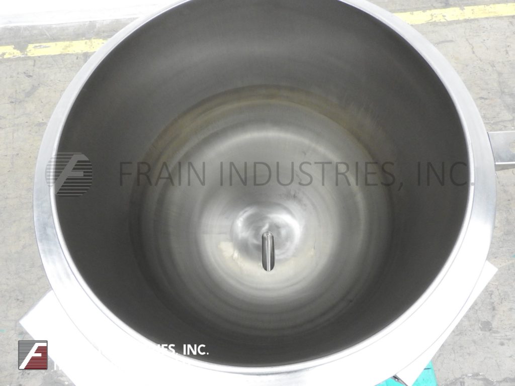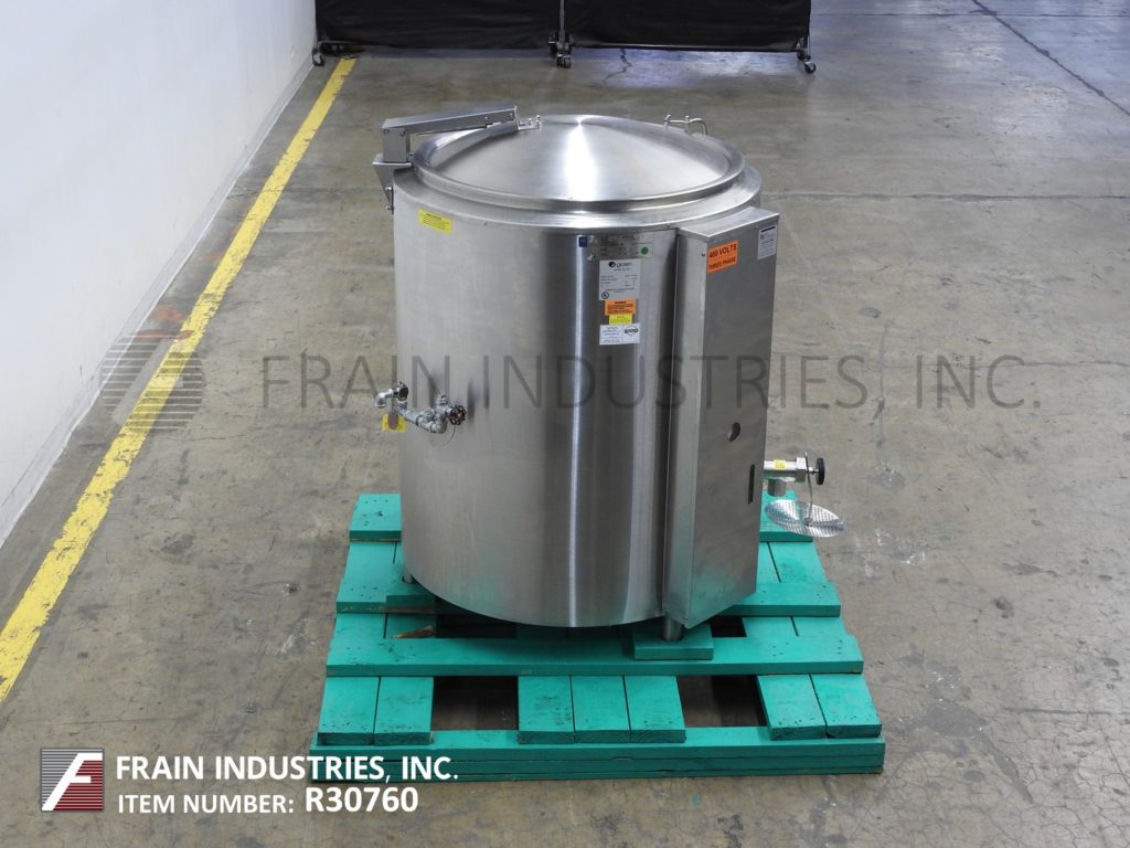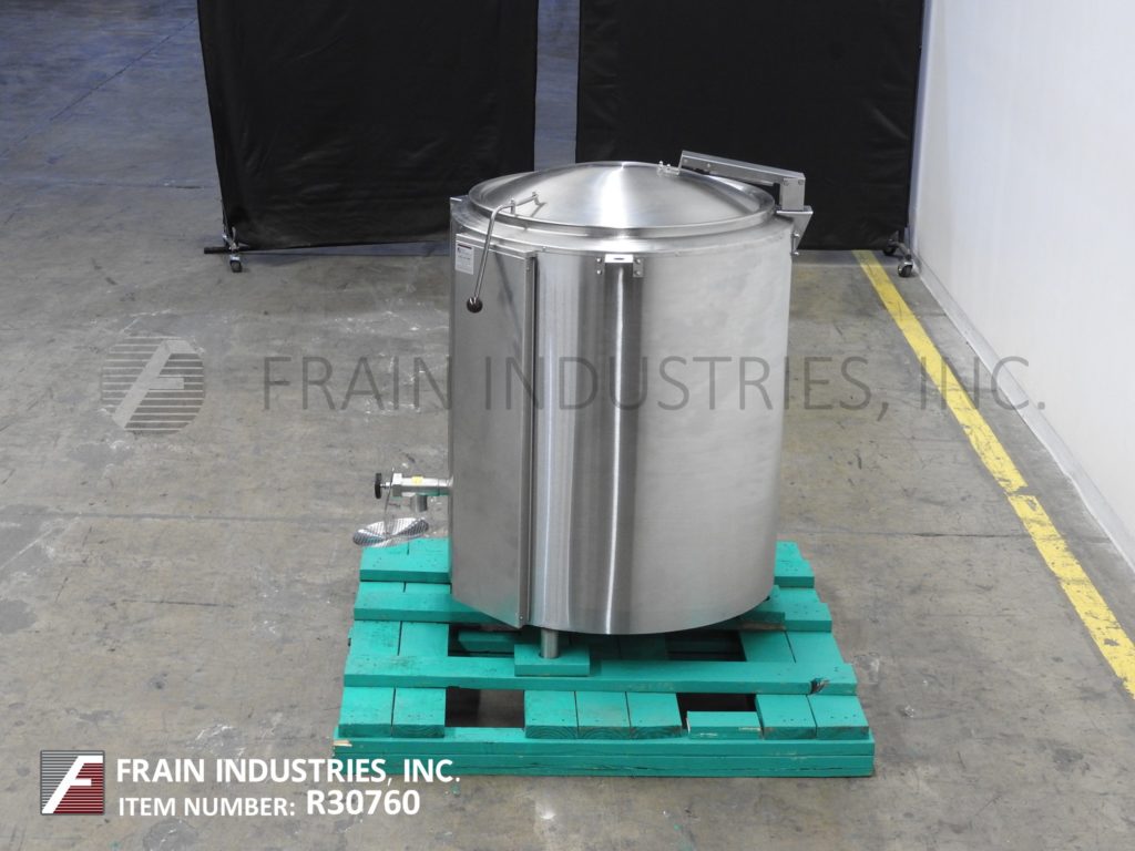 Back to All EquipmentGroen, Model EE-100, 304 stainless steel, 100 gallon self contained electric, steam jacketed kettle. with gallons of product per hour – depending on materials and application. Equipped with one piece hinged flip top cover, full steam jacket MAWP rated to 30 psi @ 300 Deg F. and MDMT rated to -20 Deg F @ 30 psi, (2) 1" OD threaded jacket in / outlets with pressure relief valve. Interior slant bottom with 2"OD / 1½"ID NPT to Tri-Clamp side bottom discharge with 17" floor clearence Control panel has thermostat heat controller and pressure gauge. Mounted (3) height adjustable legs.