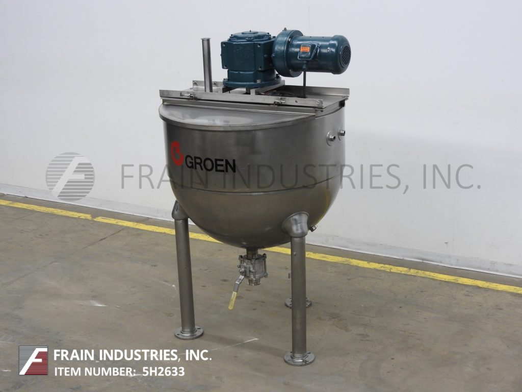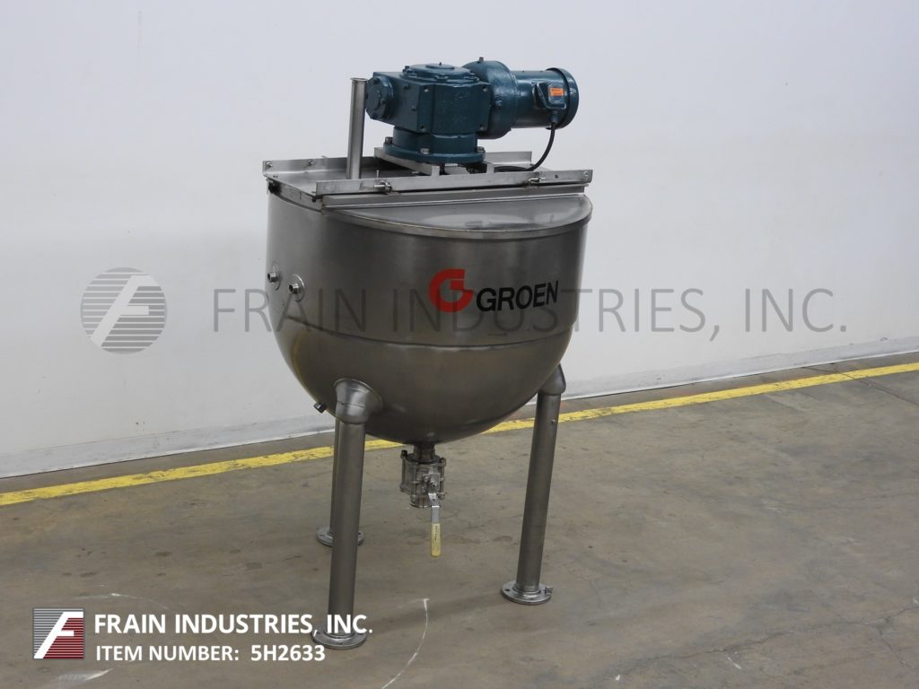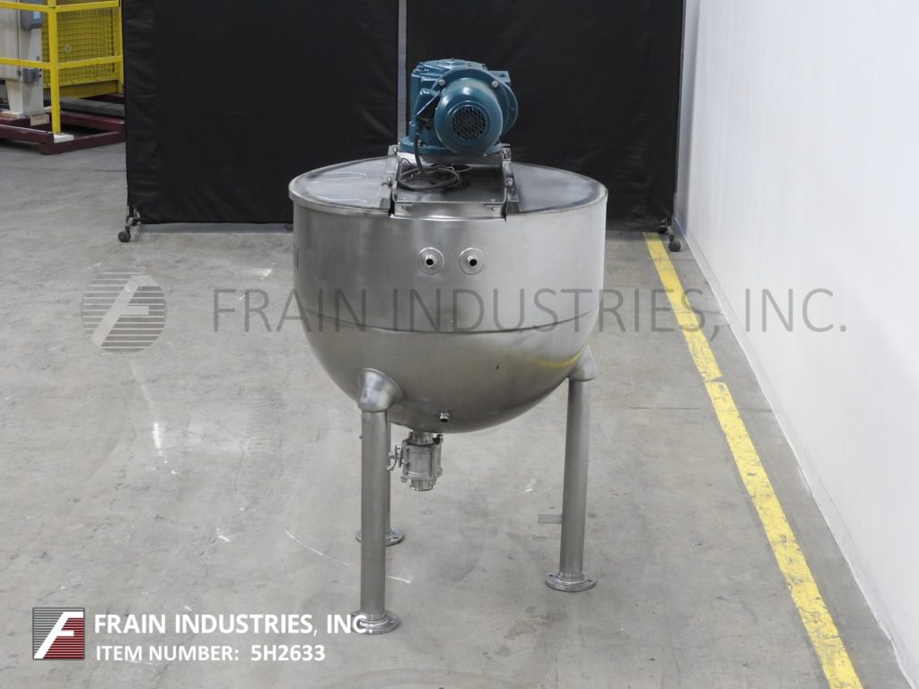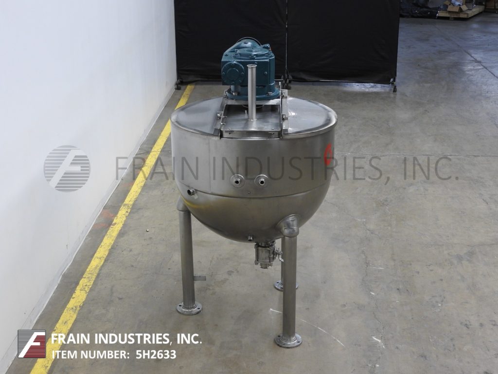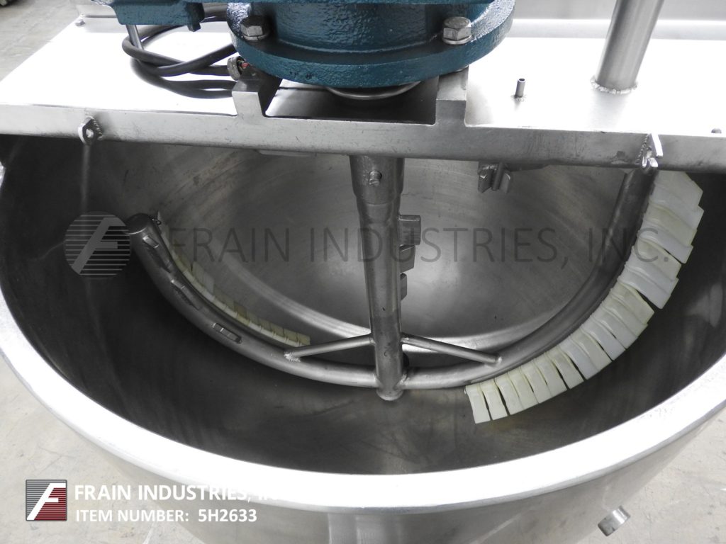 返回所有设备Groen, RA150型,316不锈钢单壁水壶。容器尺寸:42"直径x 34"深,16"直壁。配备一个桥式刮板搅拌器和3½”外径/ 3”ID三钳式排放与球阀和12”地间隙。安装在(3)管状腿架上。