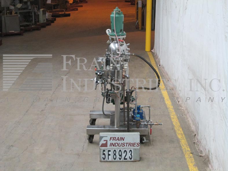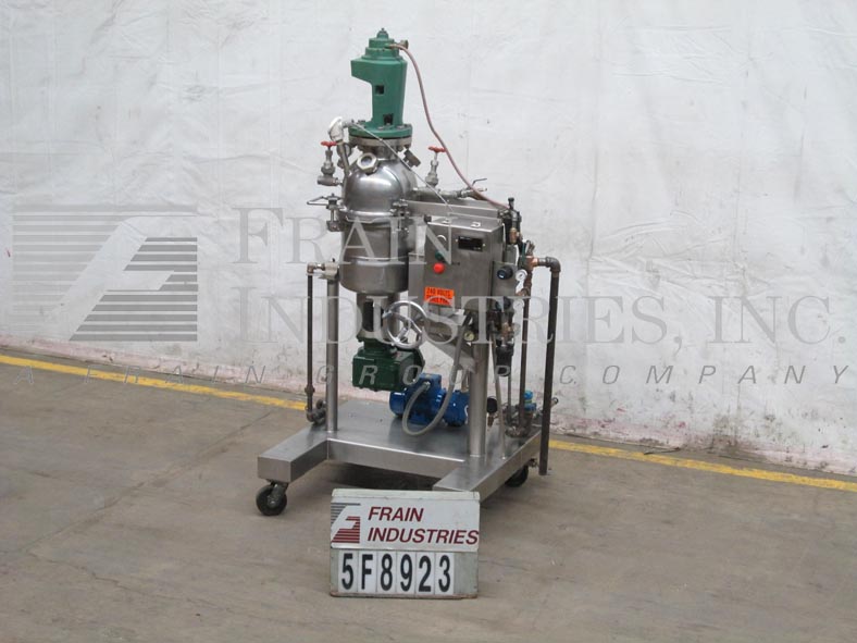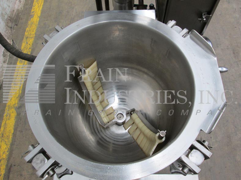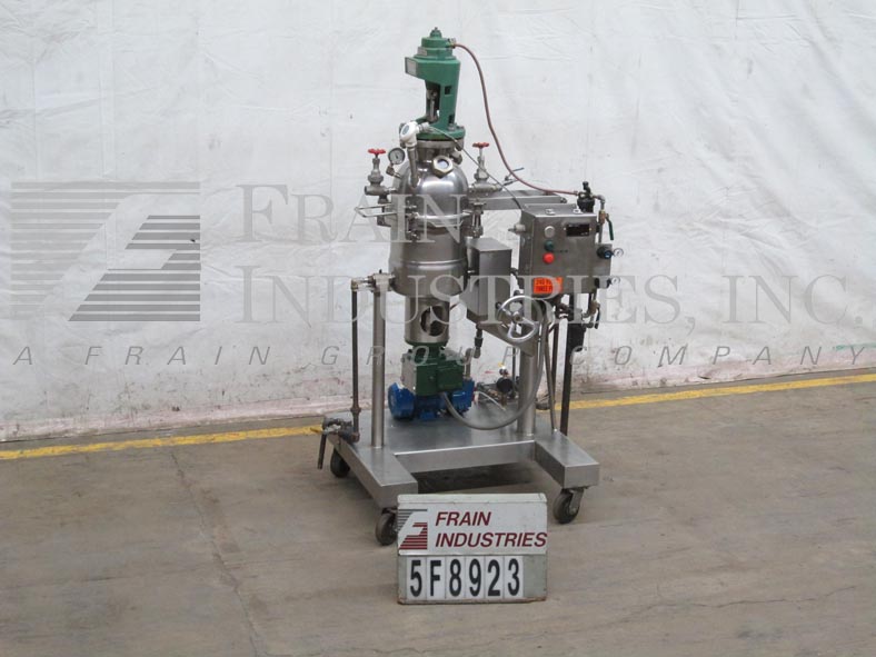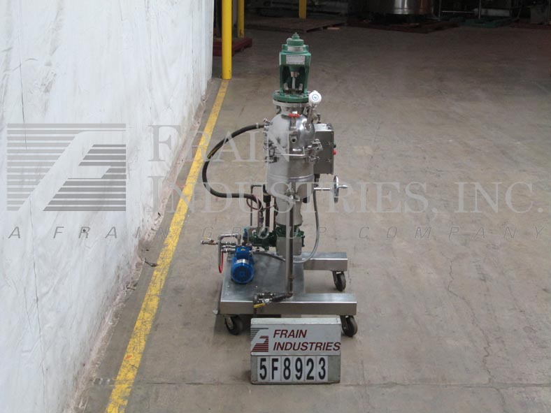 返回所有设备Groen 5加仑,316不锈钢,蒸汽夹套,实验室/中试工厂真空锅,带搅拌器和倾斜排放。配备12“OD x 12“深度产品混合碗,圆顶顶部与螺栓铰接盖,顶部法兰安装气动支撑风格混合器和底部电机驱动与(2)2边刮刀“OD网站端口有光,温度探头、压力表和(1)1 - 1/2”,(1)1”OD螺纹顶部港口。1/2夹套额定MAWP 90psi @ 338℉,完全内部真空额定29" HG, 1-1/2"外径螺纹夹套端口。真空系统与2-1/2马力泵和气动包装和手动曲柄产品倾斜排放。控制面板有灯开关和真空泵控制读数和安装在48" x 48"不锈钢H型底座与脚轮。