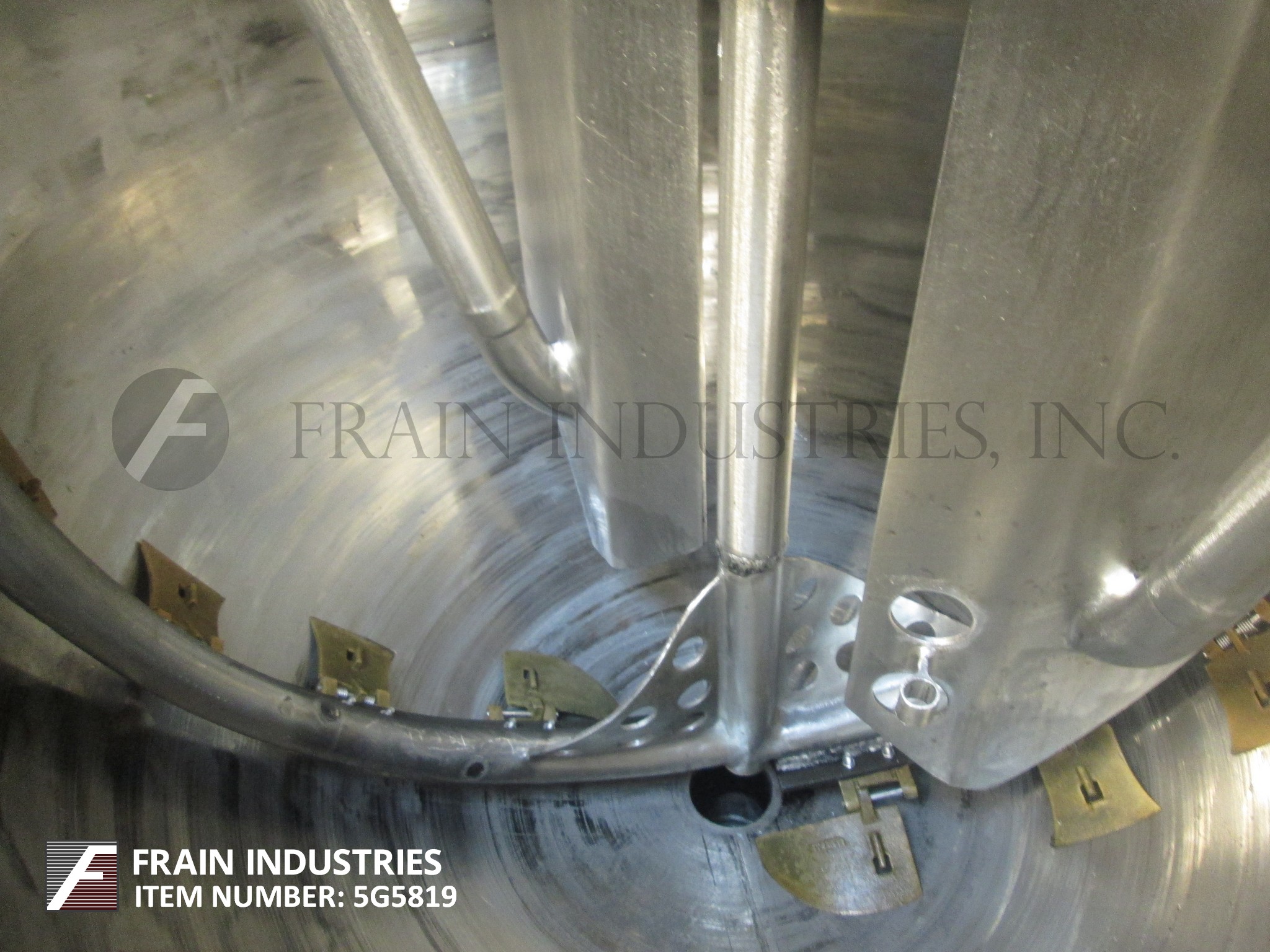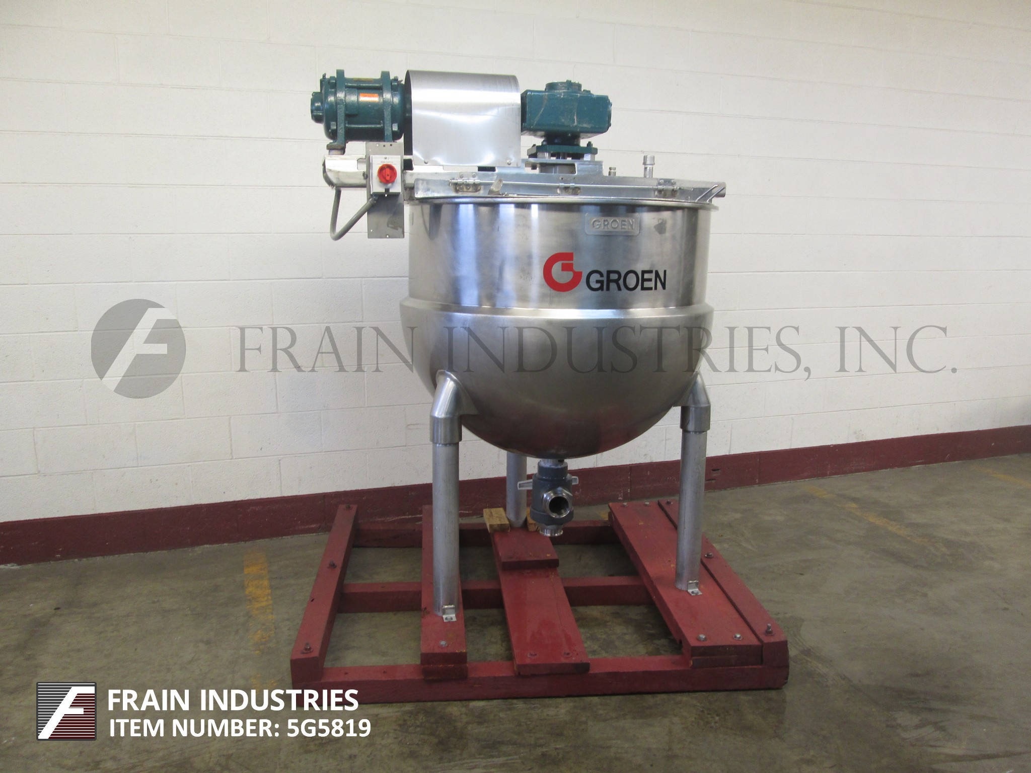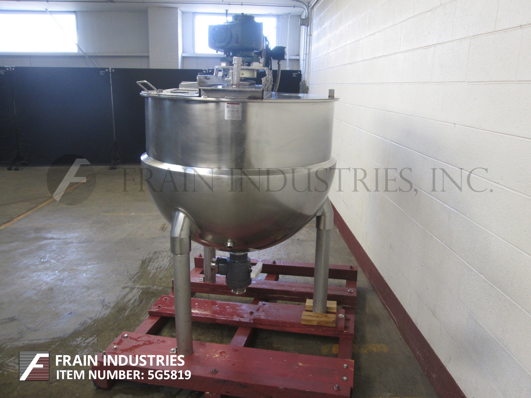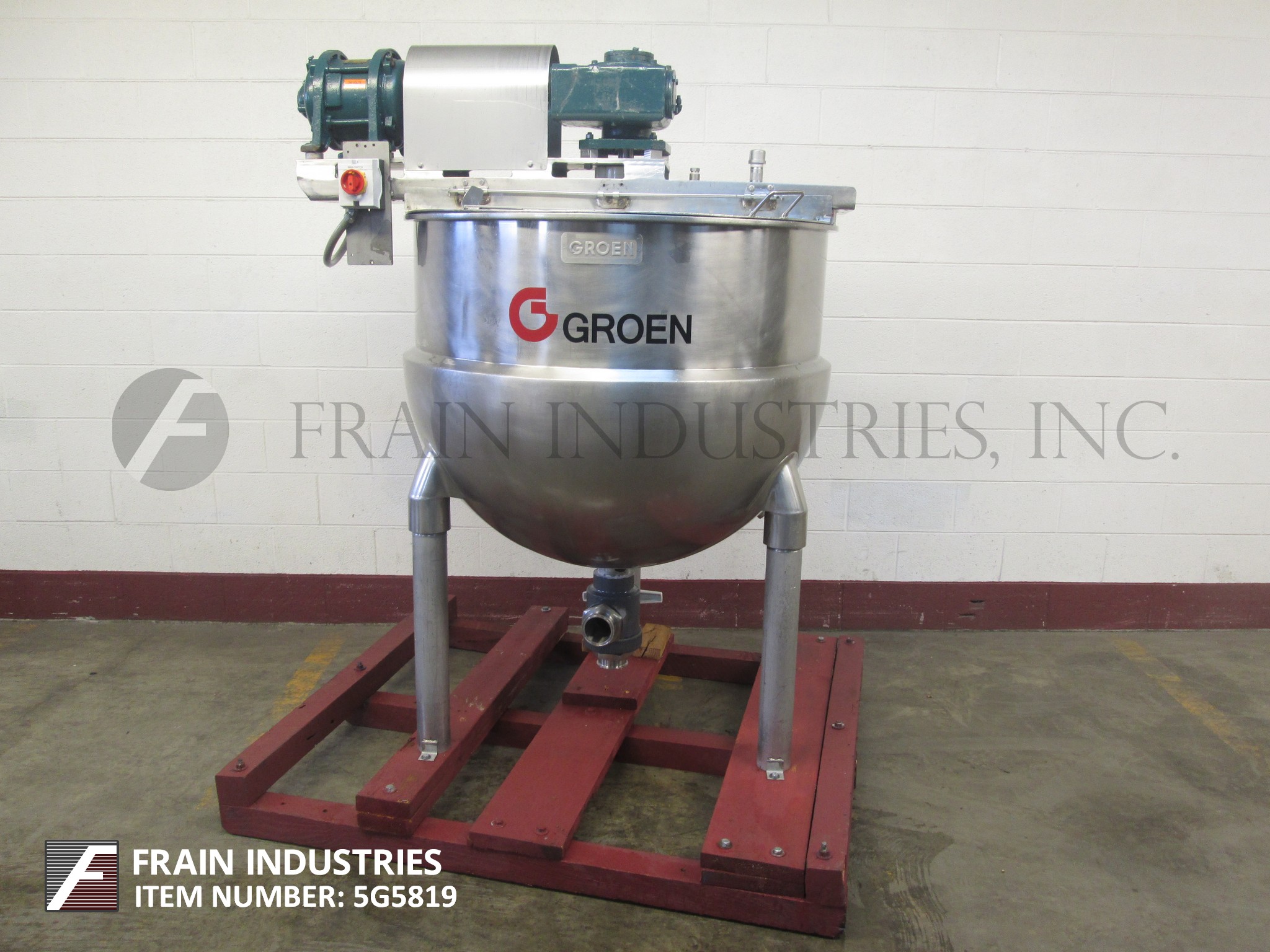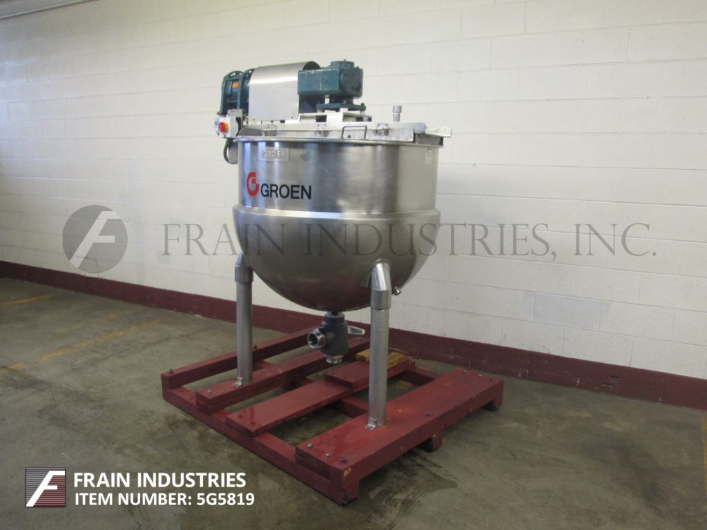 返回所有设备Groen, da - 150sp型,150加仑304不锈钢半夹套水壶。容器尺寸:42"直径x 33"深,13"直壁。配备了由2hp驱动驱动的桥式刮板搅拌器,(2)12英寸宽的挡板,提升盖和2英寸NPT式排气装置,离地间隙为13英寸。安装在(3)管状腿上。