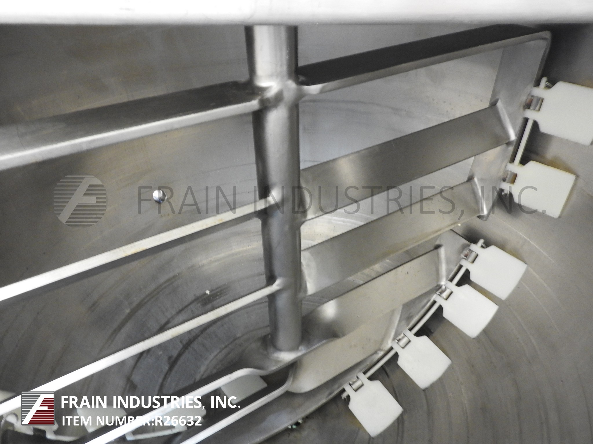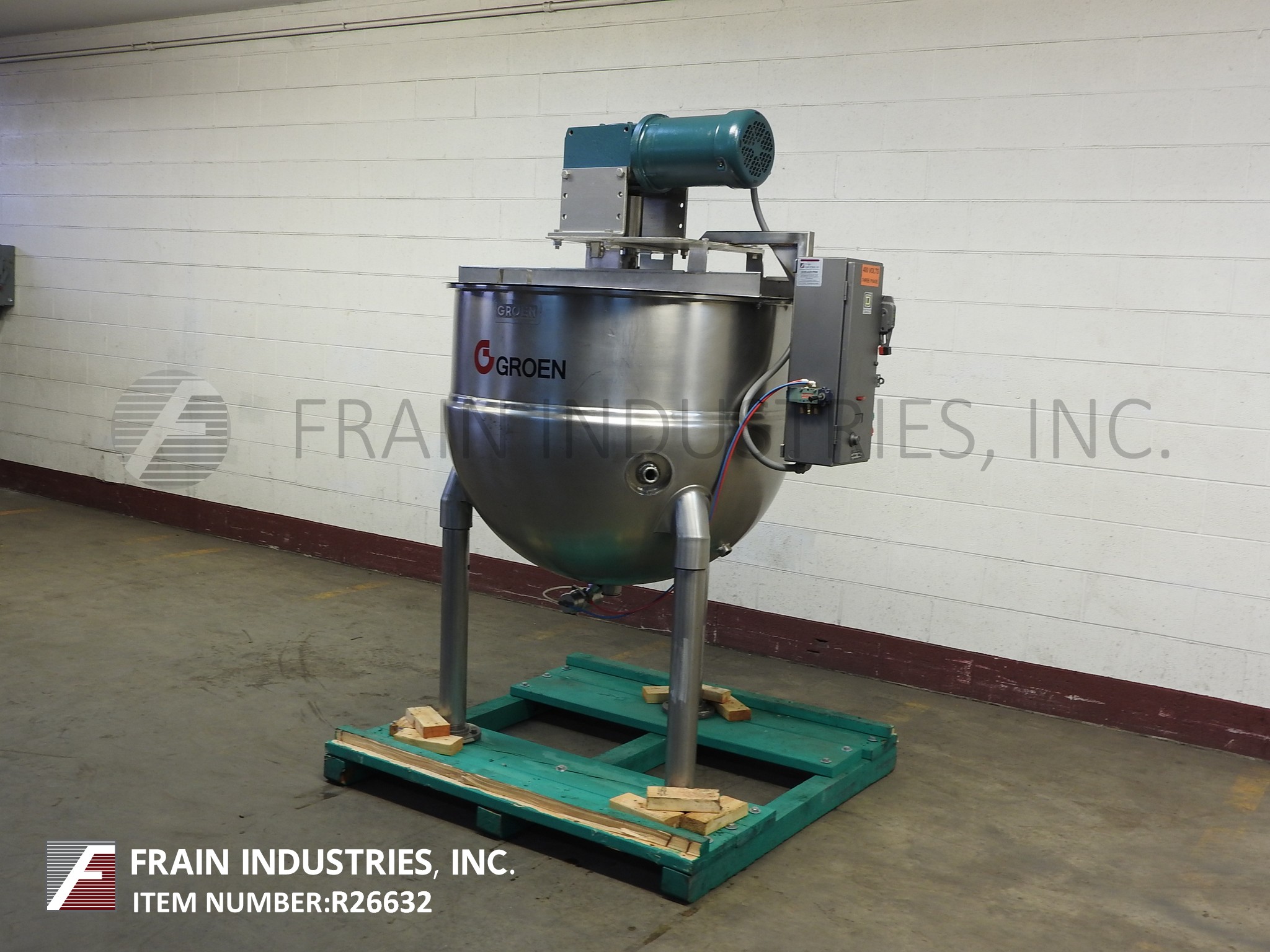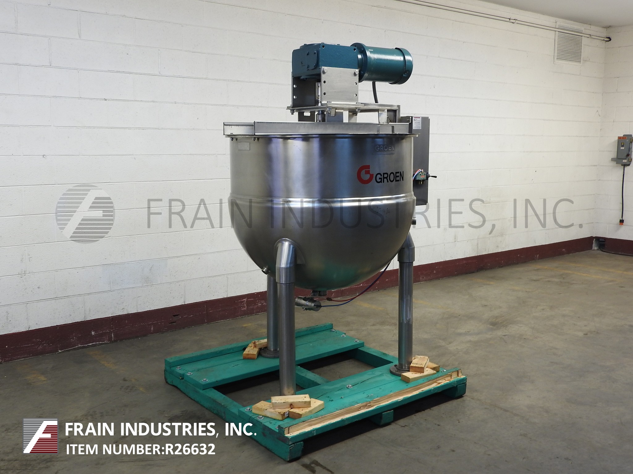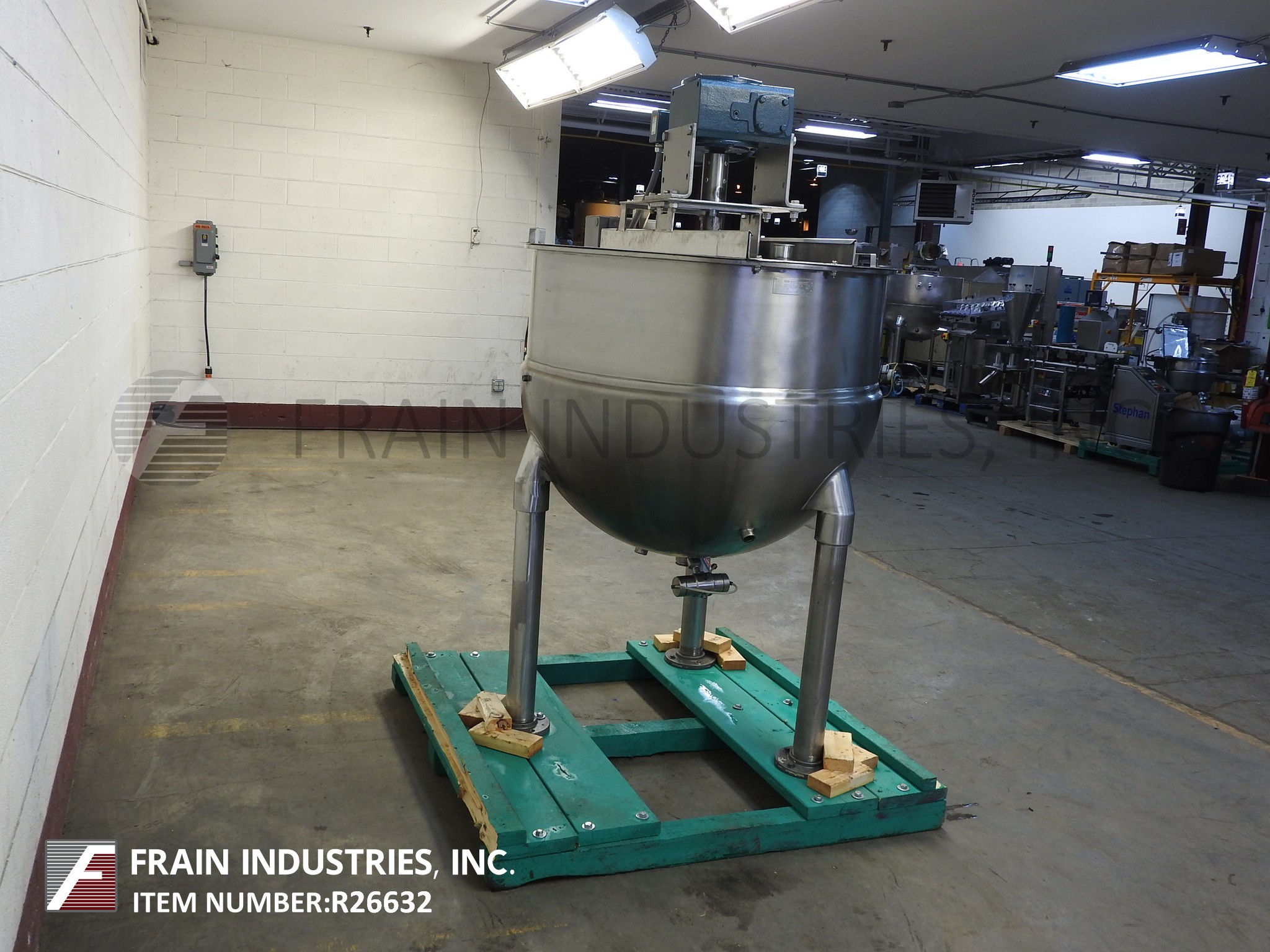 返回所有设备Groen,型号SA-F-150-SP, 150加仑316不锈钢半夹套水壶。容器尺寸:42"直径x __"深,14"直壁。配备顶部安装全扫式搅拌器,刮刀由一个5马力驱动,提升盖,(1)1¼”螺纹配件为嵌入式安装附件,(3)1½”螺纹夹套进口,(1)½”螺纹夹套进口和一个2½”外径/2”内径三钳气动阀排放与20”地间隙。安装在(3)管状腿上。