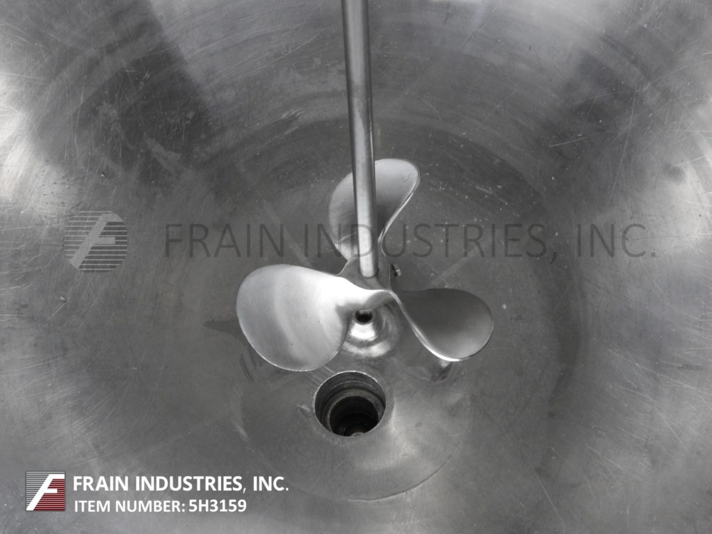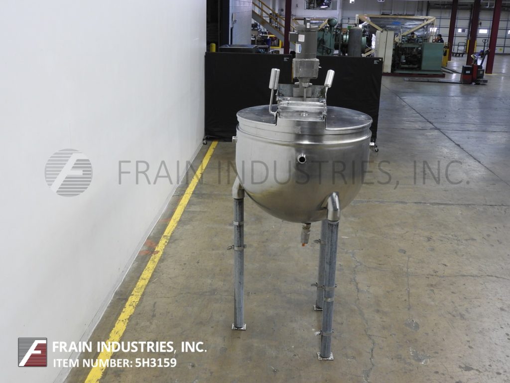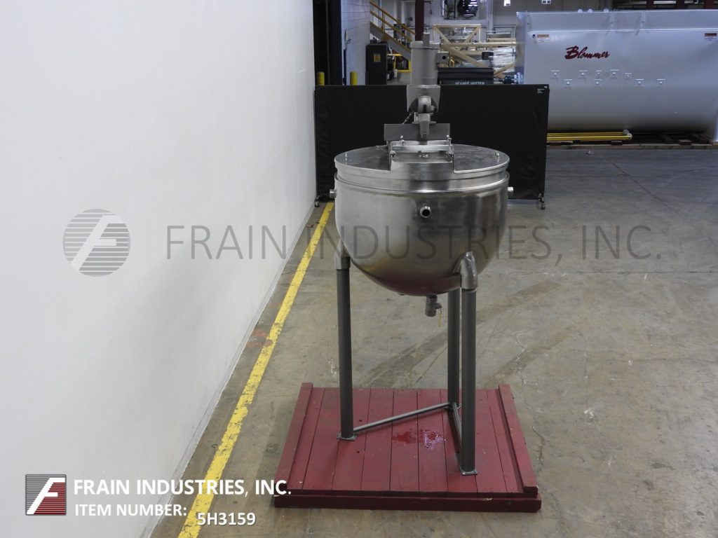 返回所有设备格伦,TA150SP型,304不锈钢夹套釜。容器尺寸:42"直径x 32"深,14"直壁。配有桥式支柱搅拌器和翻盖。碟形底部有2“NPT中心底部放电和34”离地间隙。安装在(3)管状腿架上。