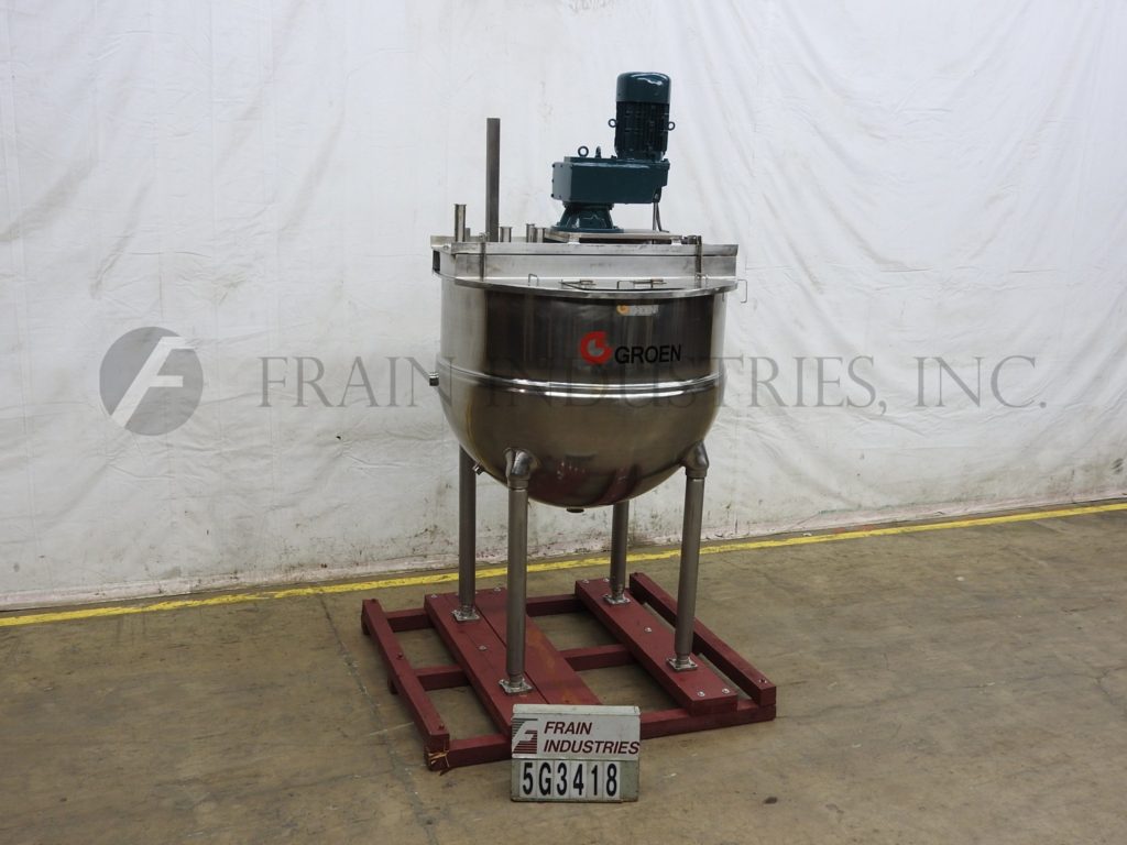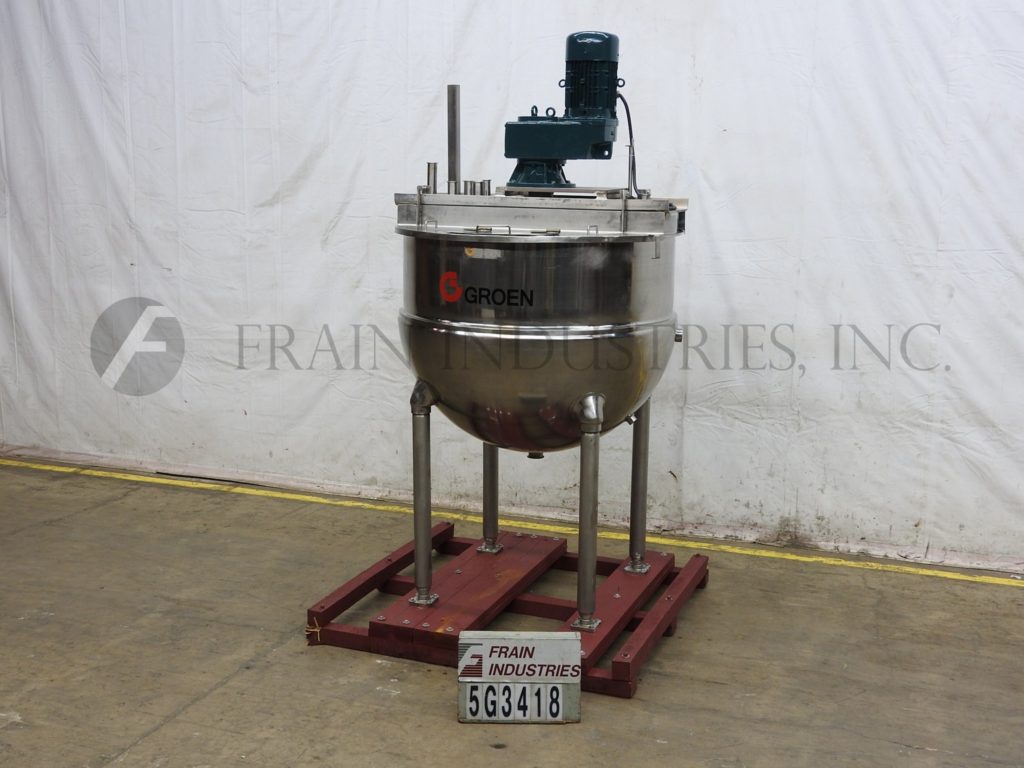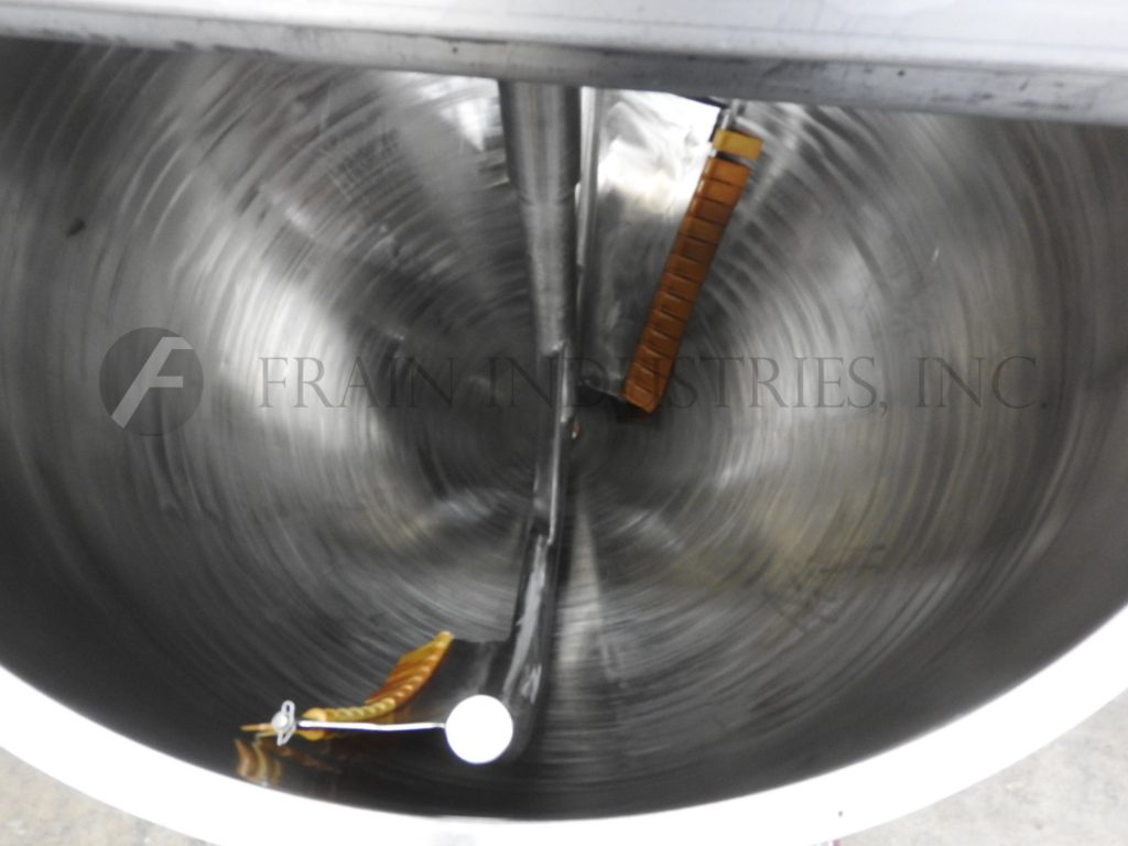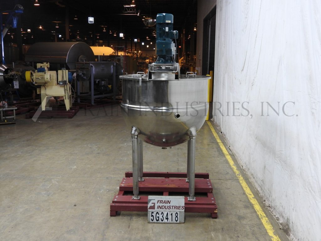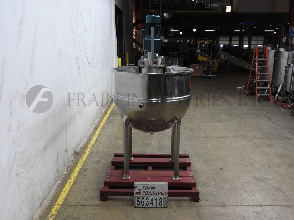 返回所有设备Groen, TA300型,300加仑316不锈钢½夹套水壶。两个区域1/2护套额定压力为100psi,温度为338℉,最低金属温度为-20℉,温度为100psi。夹套有(2)2½”,(2)1¾”和(1)2”螺纹进入/出口。配备54"直径和17"直壁碗。桥架安装有(5)2½”OD/1¾”ID和(1)2”OD/1¼”ID三夹管接头,由7½HP驱动和翻盖驱动。安装在(4)管状支腿上,带有3½”OD/3”ID三卡箍中心底部放电和28”地面间隙。