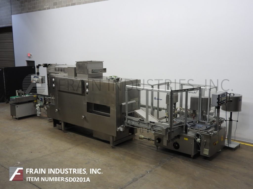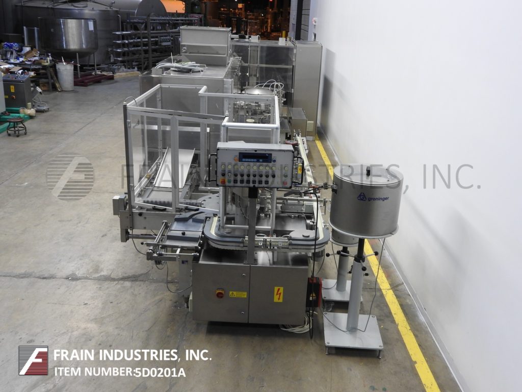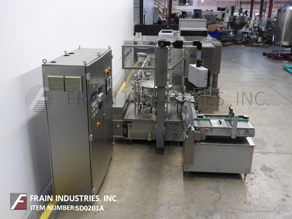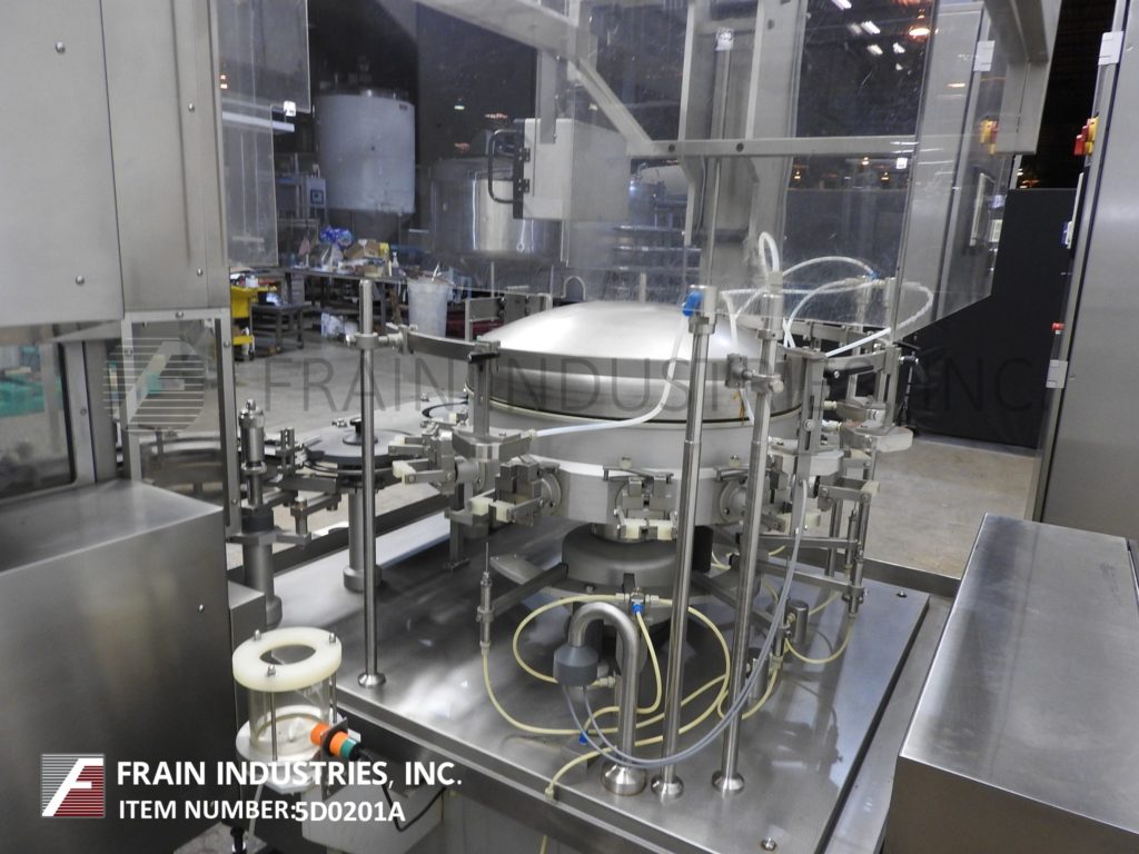 返回所有设备格罗宁格型号KFVG211A,完整的小瓶清洗杀菌,灌装,塞和铝卷曲系统与每分钟数量的小瓶-取决于材料和应用。小瓶直径:10mm至100mm,高度30mm至200mm。灌装量:3ml至270ml。塞子尺寸:13mm到28mm,都有适当的更换部件。生产线包括所有的格罗宁格机,从饲料输送机中的模型FSA托盘到蜗杆,星轮分度到模型ASV100,12台旋转瓶垫圈与硅化Groninger模型STS 3226 l去除热原法隧道炉有14“宽x 10“高孔径x 105“12-1/2长隧道输送带宽度”和部分均匀受热,消毒、冷却和depyrogenizes瓶低压预过滤器和高presuure Hepa过滤器。格罗宁格型号KFVG 211A整体系统有一个填料(4)加药站目前设置为(2),底部向上填充和无容器/无填充,有塞子插入器和铝压盖16" OD塞子和铝帽振动碗给料器,自动拒收系统,无塞子/无盖检测和204"长x 2-1/2"宽的小瓶排放塑料伸缩链带输送机。(3)控制面板(1)主机和(2)机上有过滤、通风、风速、加热、冷却、切片、消毒、碗料、灌装、塞、压接和输送控制,具有数字读数、图表记录和启动、停止、e-stop按钮。全部安装在不锈钢框架上。