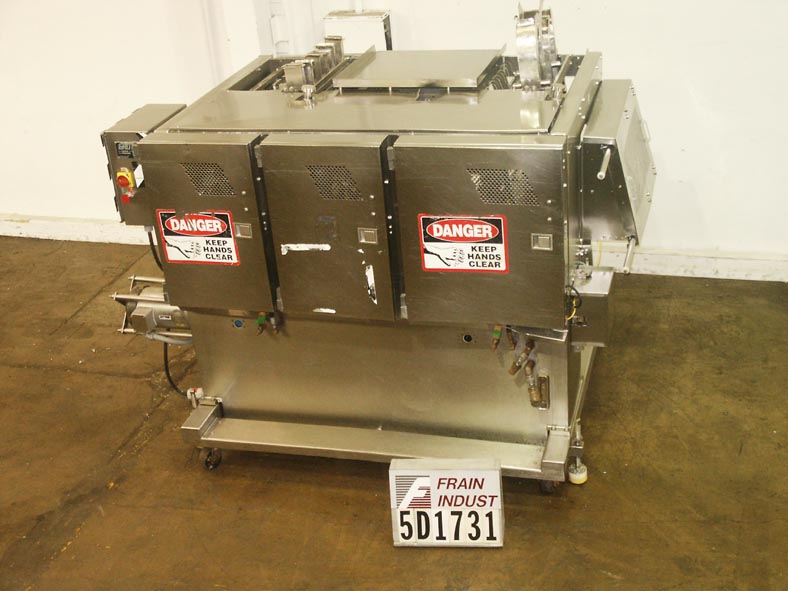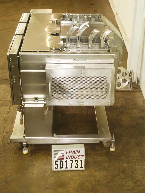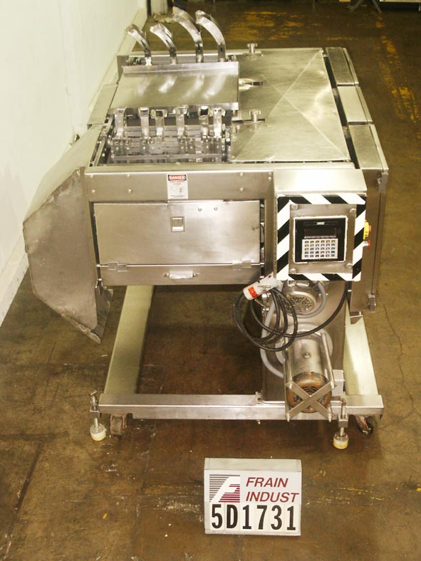 返回所有设备三头ss冲洗装置。每人每分钟划120下。公称5 1/2”行程和22”w切片区。大多数无骨/非冷冻肉、鱼、家禽、奶酪、面包产品、水果和蔬菜都可以切片。全S/S冲洗电机驱动刀带,锯带。最后一次用在美国农业部食品部门切火腿和奶酪做基辅鸡肉。根据应用程序更换所需零件。