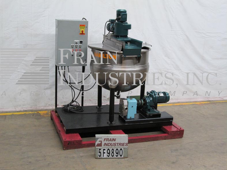 返回所有设备汉密尔顿SA150型,150加仑,304不锈钢,双运动水壶,APV型R4R PD泵,和A/B控制包。水壶尺寸:41" ID x 32"深度。配备5马力桥式刮面搅拌和1.5马力二级圣诞树搅拌机,双翻转顶部闩锁下盖,1/2夹克MAWP 125 psi @ 345度F和(2)2“OD螺纹的夹克/网点盘底部2 - 1/2“OD中心底部排放16“地板间隙和(3)腿安装在85年“长x 51”宽金属打滑和APV R4R PD旋转输送泵5 Hp马达驱动。控制面板有艾伦布拉德利控制器变速控制和加热器,刮刀,泵开/关开关,带温度控制器。国家板# 5727和UL认证。