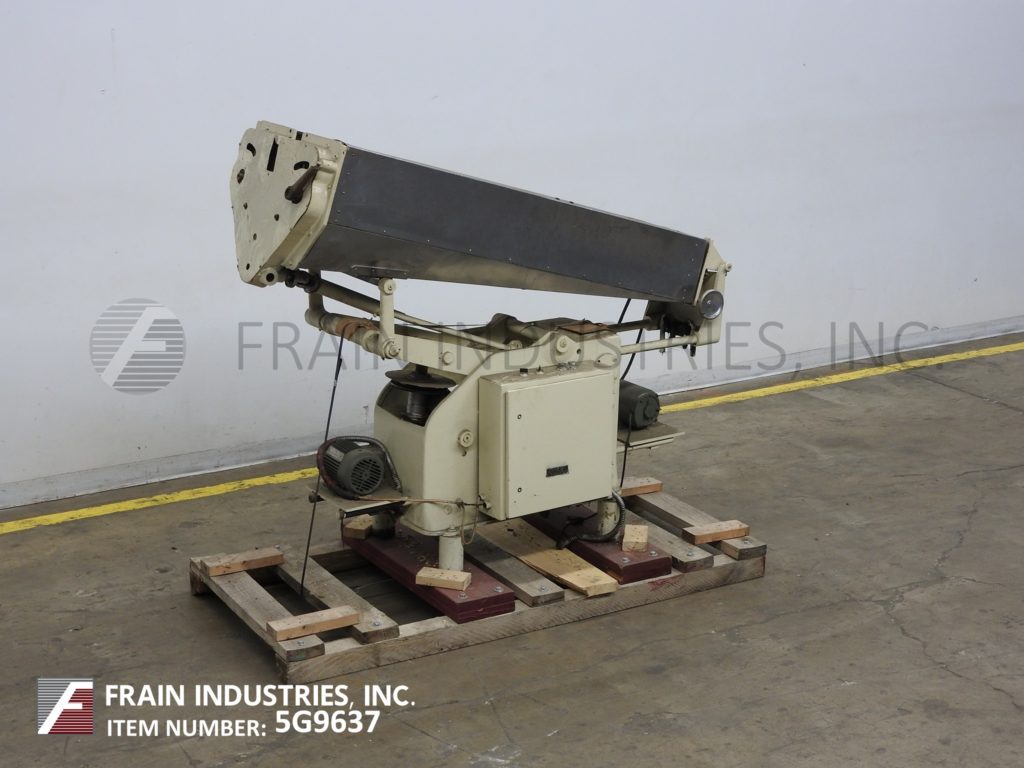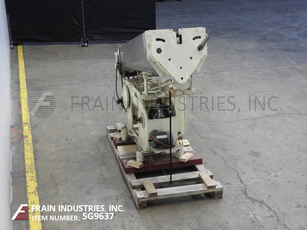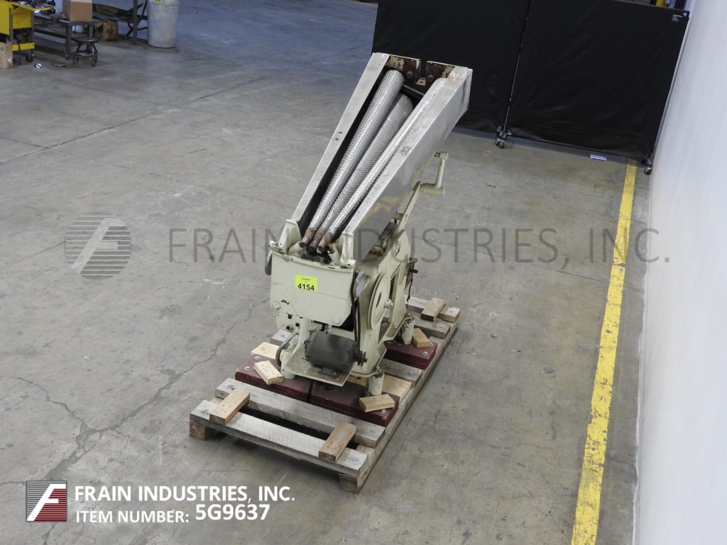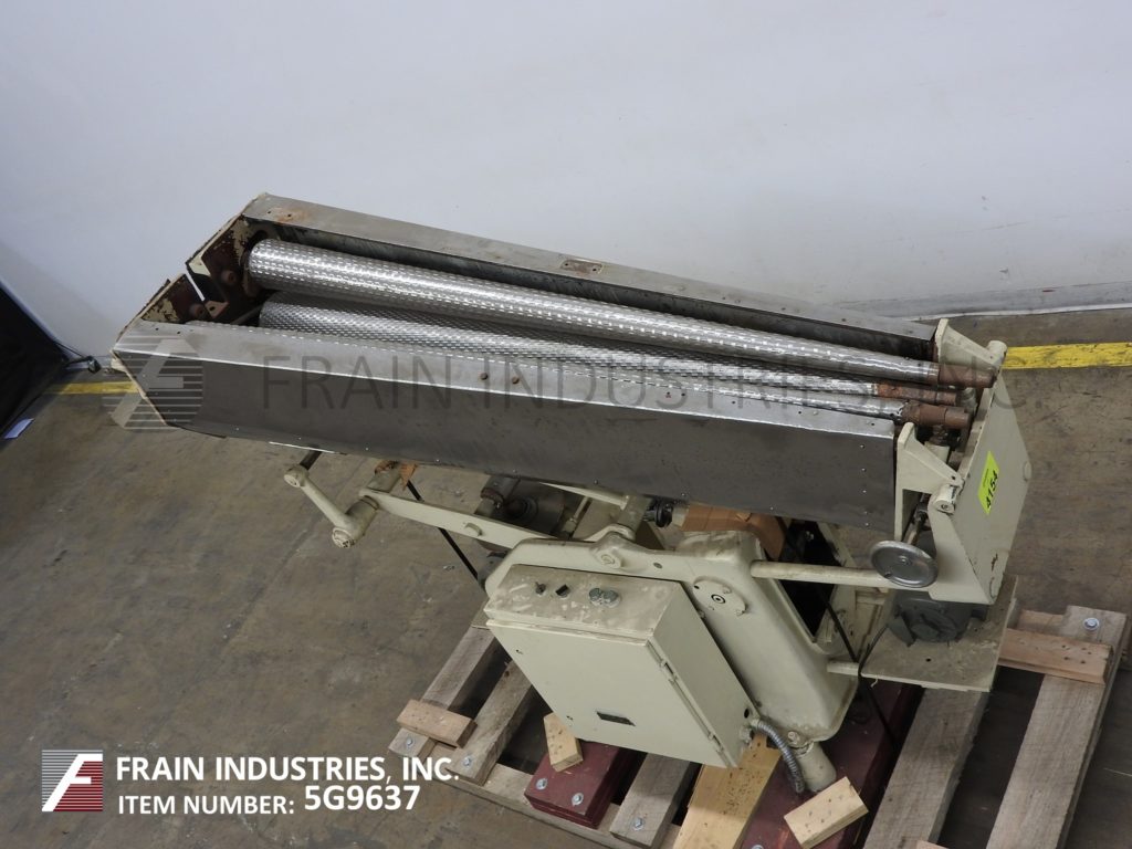 返回所有设备汉氏素,型号19h,批量糖果扭曲前。额定最大75公斤(165磅)批次。配备(4)不锈钢圆锥形,罗纹和加热的产品滚筒,测量72“长,(2)6”DIA和BIAD的(2)9“DIA”,尖端。用于从糖批量形成绳索。4个锥形辊以这样的方式布置,使得糖批次,有或没有中心,条纹或平原,拉动或普通的方式形成为均匀的锥形,其中非扣除的产品尺寸连续减小,直到它达到所需的厚度在排放端。