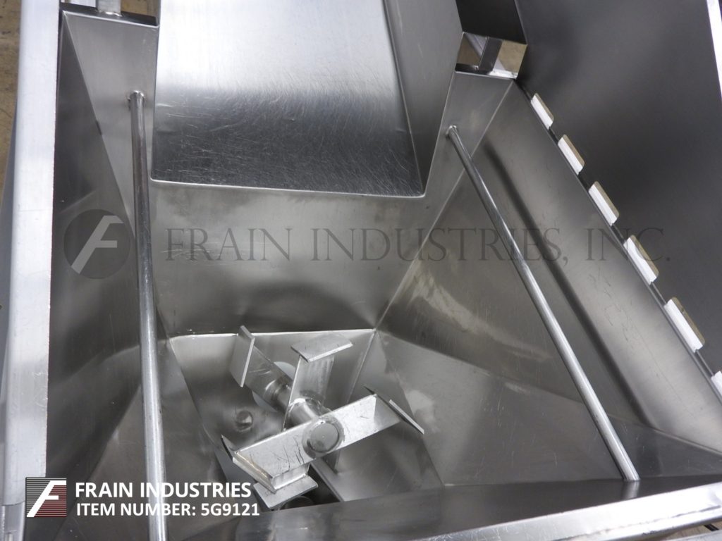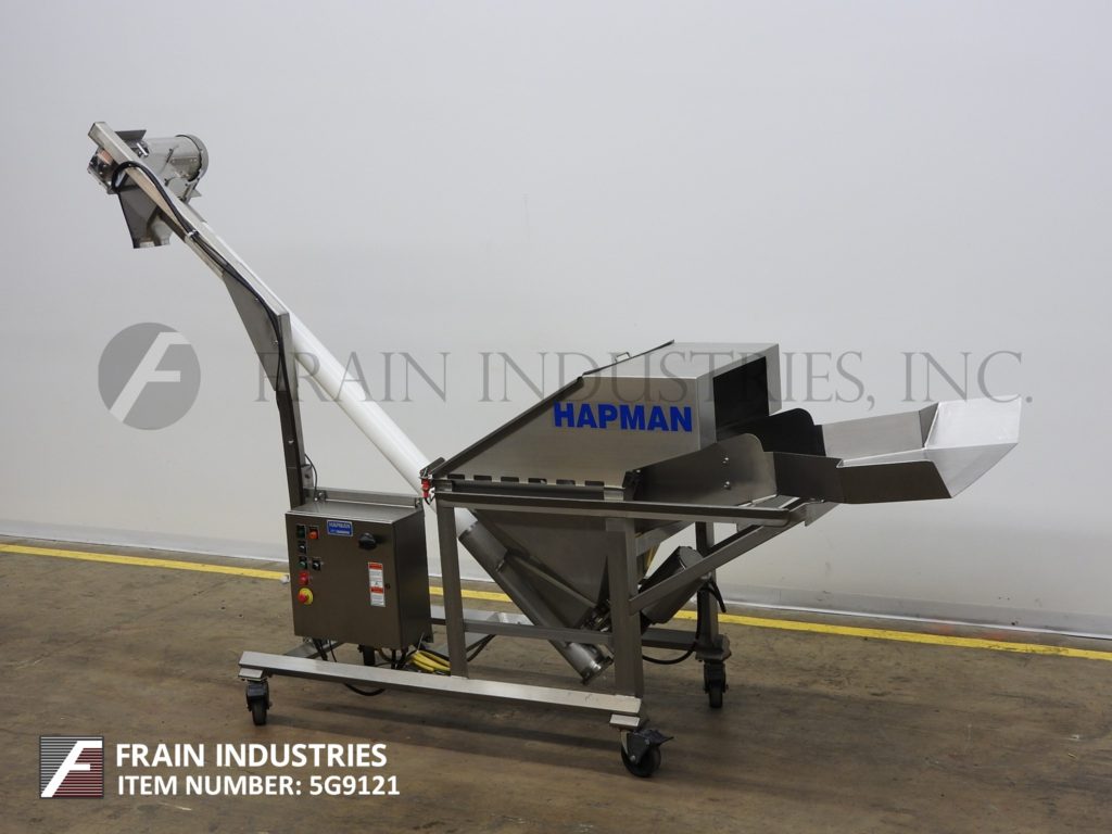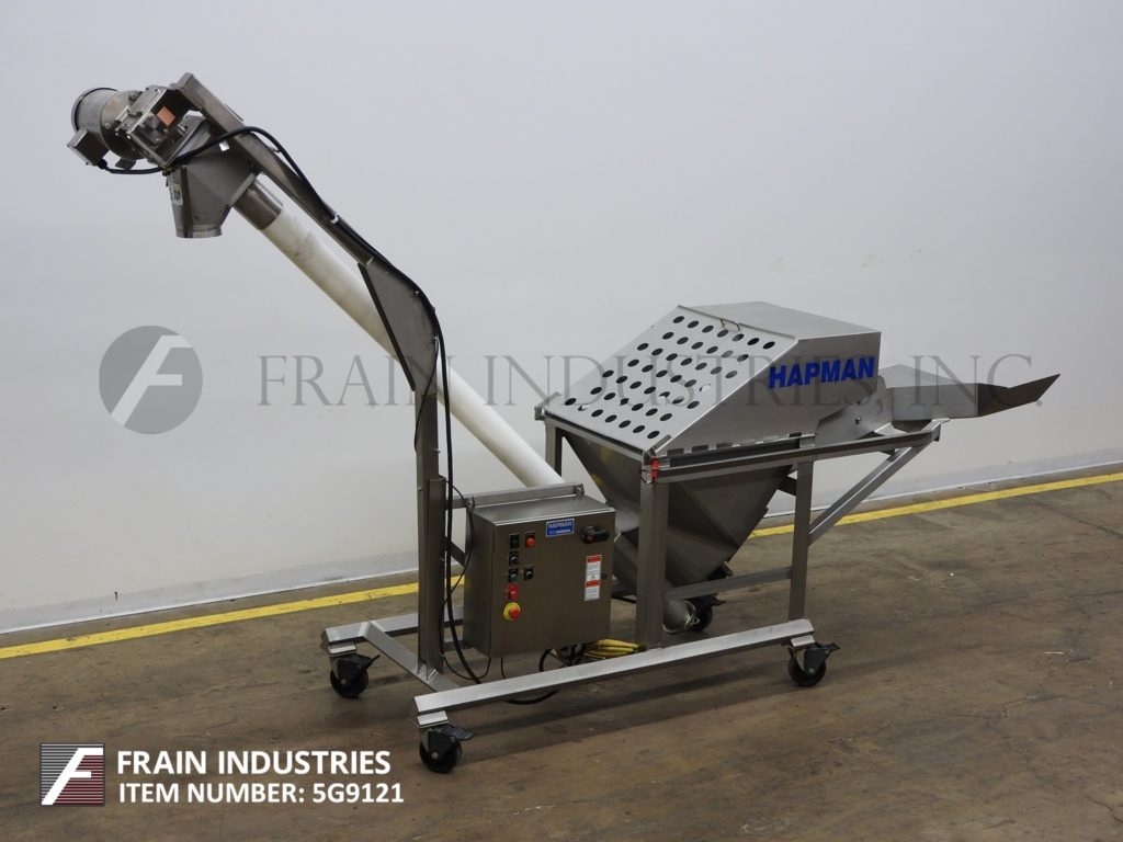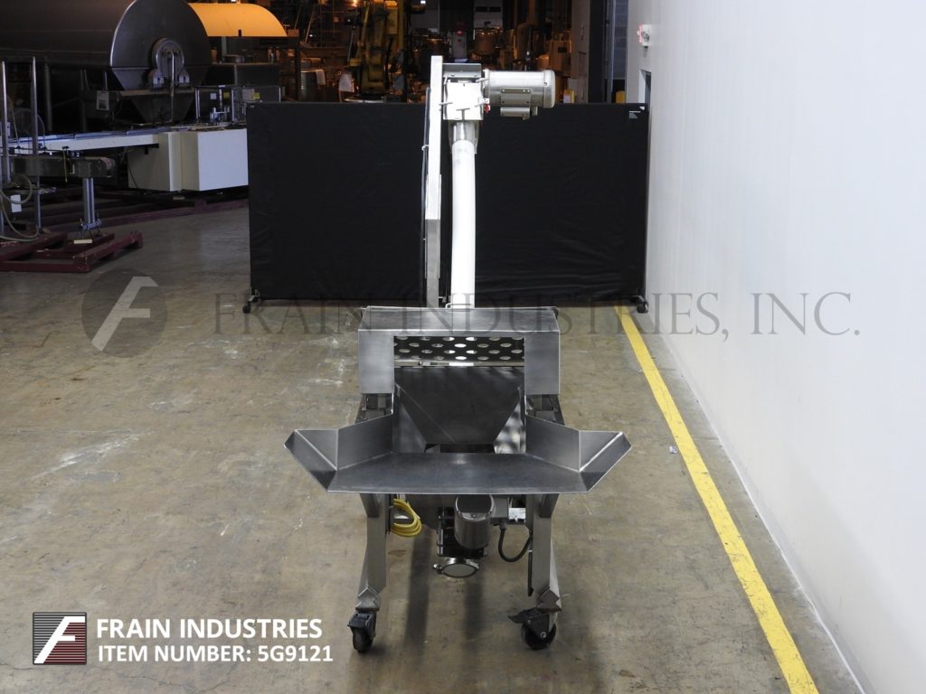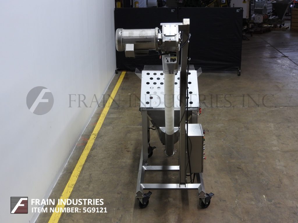 返回所有设备HAPMAN,型号400系列,螺旋输送机和产品料斗。每小时1至4英尺/分钟,每小时磅产品 - 取决于材料,应用,环境和机器配置。配备34英寸宽x 26“长x 6”深饲料盘,30“长x 30”宽x 25“深不锈钢产品料斗与¾hp底部搅拌,螺旋钻饲料和盖子,3¼”od x 103“长不锈钢钢制品螺旋钻螺钉,带有4“ID X 82”长柔性多管,顶部安装5 HP电机驱动器和6“OD产品排放口,具有75”地间隙。控制面板具有变速,启动,停止复位和电子停止控制。安装在带脚轮的不锈钢底架上。