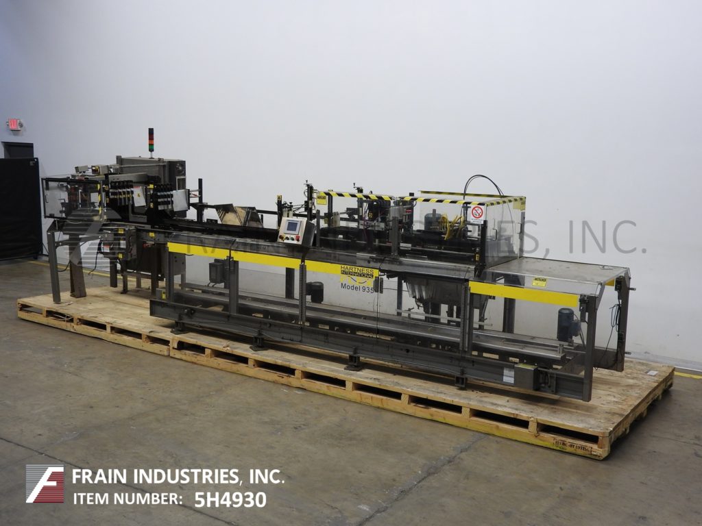 返回所有设备HARTNESS Model 935,自动,间歇运动,下降,案例包装机,每分钟5至30件案例,每种情况下的产品数量 - 取决于材料,应用和案例包模式。案例尺寸范围:长度为7“至22½”;5½“到16½”的宽度;2“至19”高度。容器尺寸范围:2盎司至2½加仑,可以处理玻璃,以及各种尺寸和形状的塑料圆形容器(所有具有适当的变化部件)。配备(2)9英寸宽(18个“总计18个)X 72”长伺服驱动的产品Laner,进给输送机,到(4)1“宽x 132”长累积产品输送机,静态分频器和集装箱停止。有(2)底部4“宽X 72”在进料输送机上的长壳和72“长(2)链销钉壳体分度输送机设置在30”中心和28½“x28½”下降落袋段,带有空气膀胱容器处理,容器电容器不同的每种应用。控制面板具有A / B CPU控制器和A / B PanelView触摸屏,带有启动,停止,重置,电子停止控制和Statis Light Bar。安装在重型基础框架互锁安全保护和调平腿上。