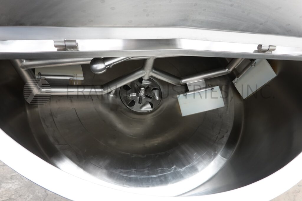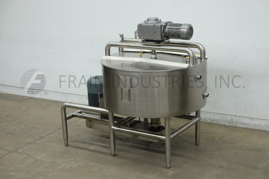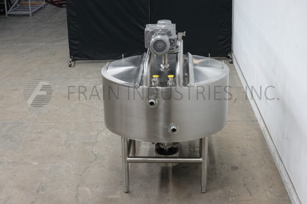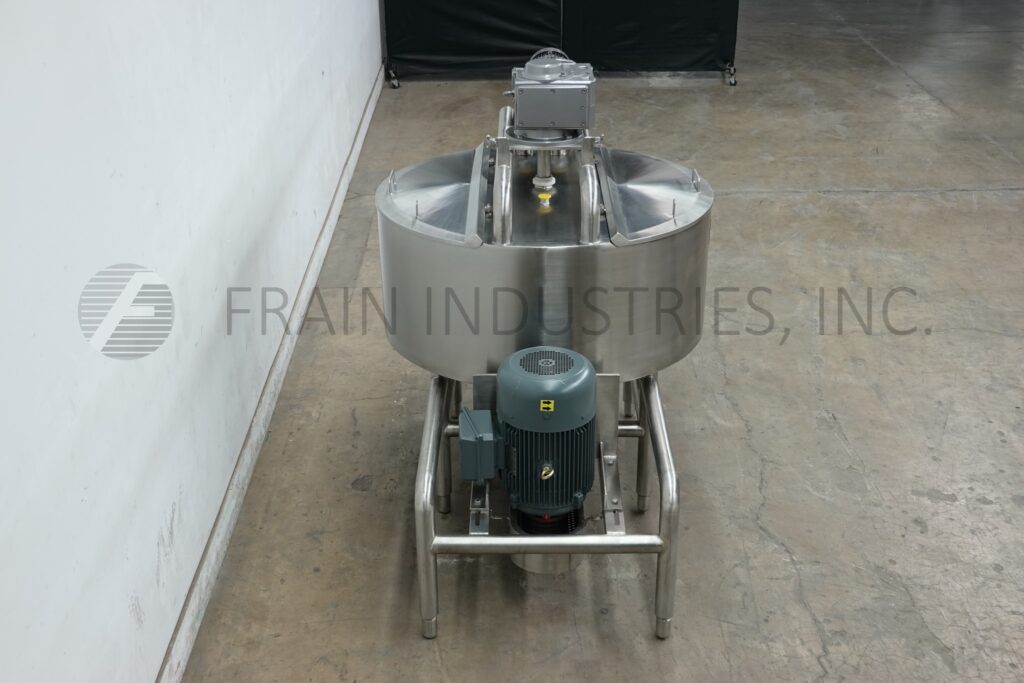 Back to All EquipmentHeritage Equipment / Bcast, Model BC-LIK200, 200 gallon, 316 stainless steel, high shear, jacketed, liquefier with amount of product per hour – depending on materials and application. Vessel dimensions of: 55" OD x 24" deep. Flat top with bridge mounted side and bottom scrape surface agitator powered by a 5 HP drive, dual hinged flip top covers, CIP spray balls supplied by a 2"OD / 1½"ID Tri-Clamp fitting and bottom 6 hole / 3 wing impeller with 50 Hp side mounted motor drive. Cone bottom has 3"OD / 2½"ID bottom discharge with 20" floor clearance. Mounted on (6) stainless steel leg frame. Control panel with push button start / stop and variable speed control.
