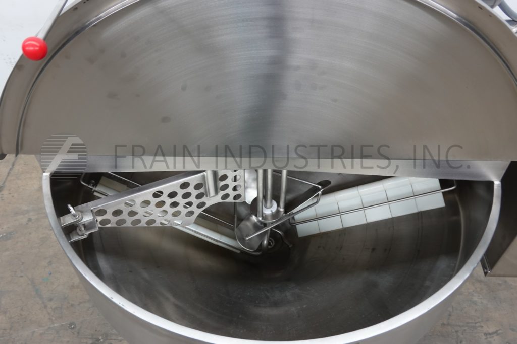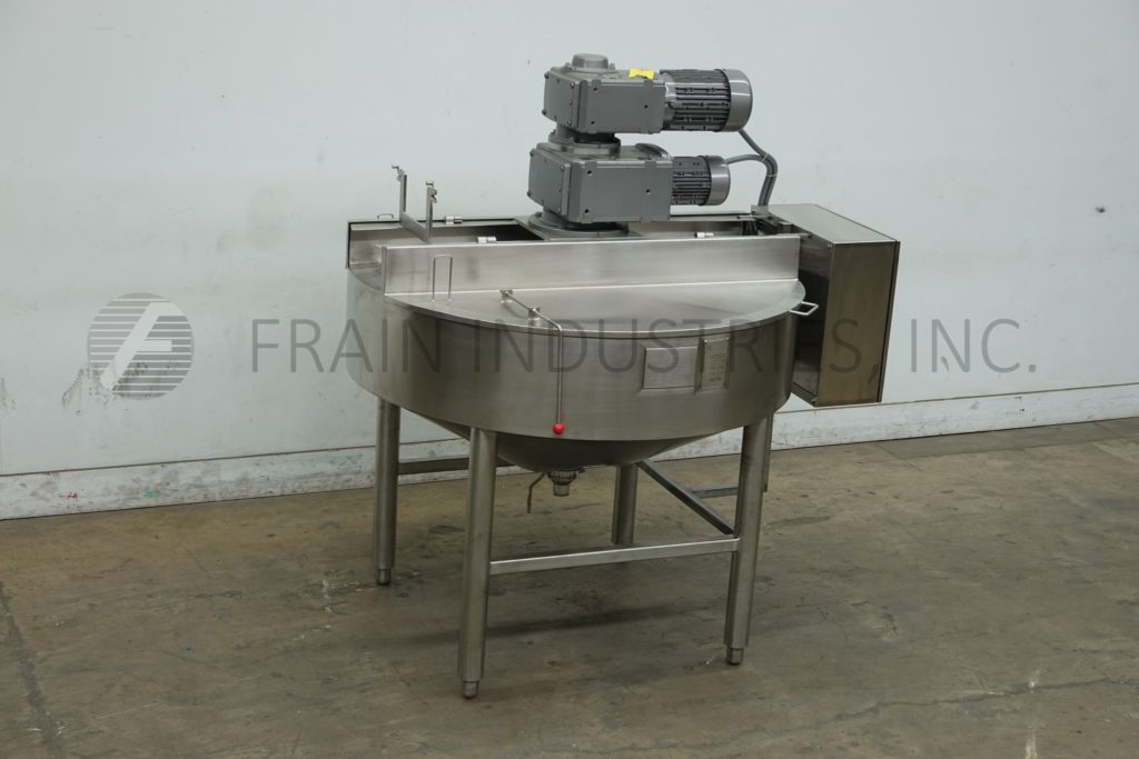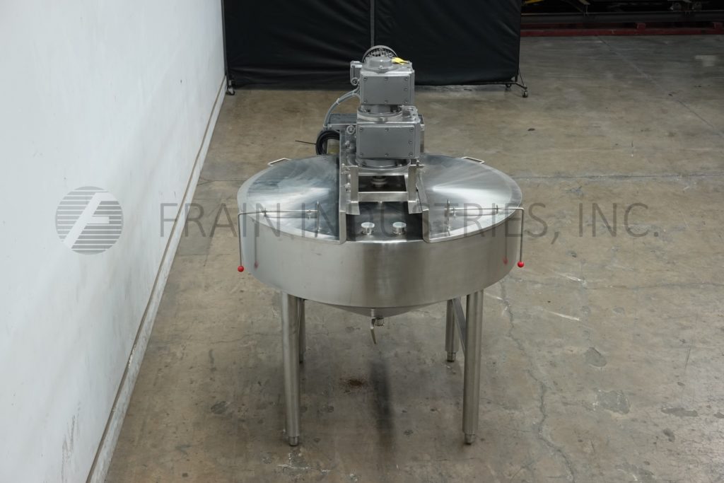 Back to All EquipmentHeritage Equipment, B Cast, 100 gallon capacity, 316 stainless steel jacketed dual purpose cooker, cooler. Vessel dimensions: 60" diameter x 23" deep with cone bottom. Equipped with lift up covers, 5 Hp bridge mounted scrape and 2 hp prop agitator, 2½" OD / 2" ID Tri-clamp style bottom discharge with 19" ground clearance. Mounted on (4) tube legs.