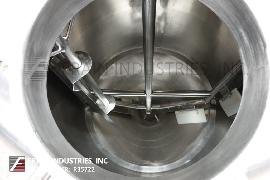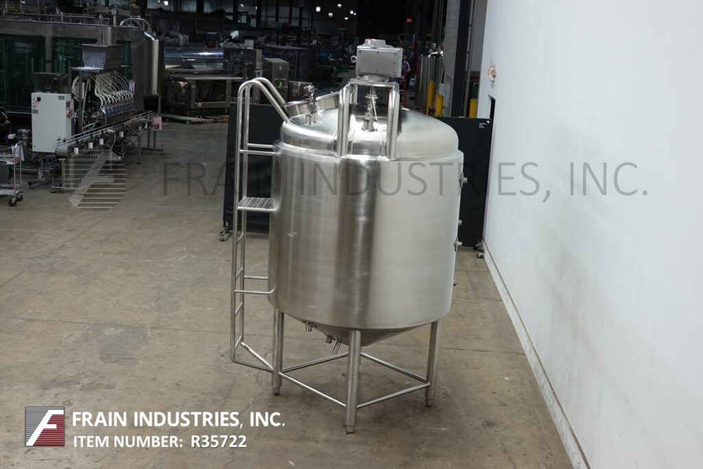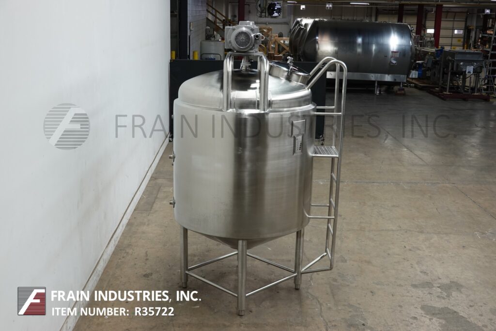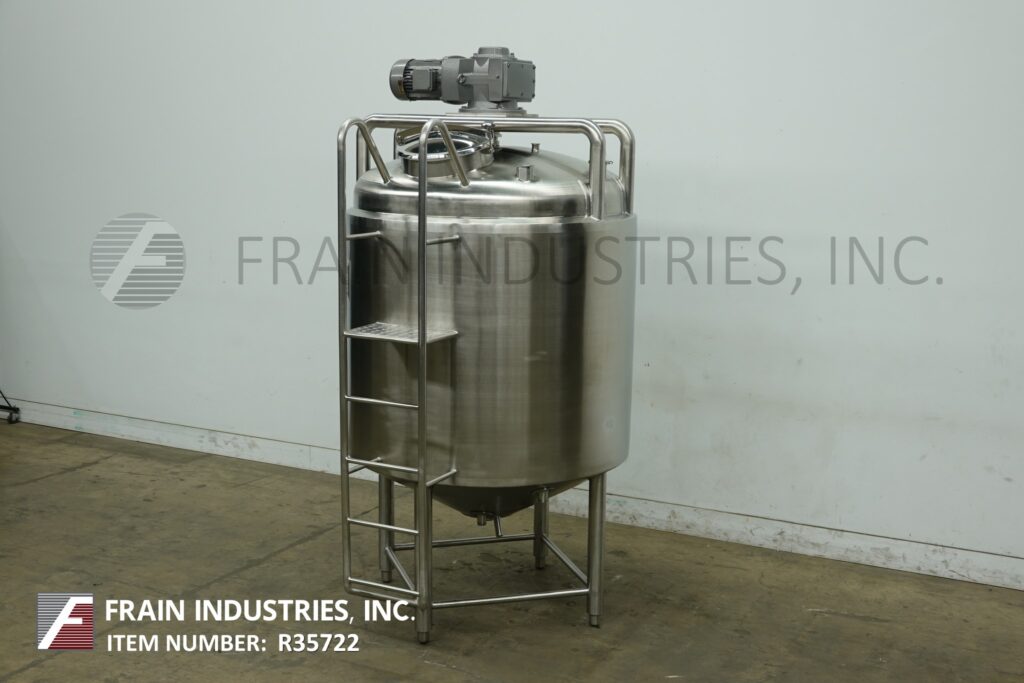 Back to All EquipmentHeritage Equipment / BCast, 500 gallon capacity, stainless steel jacketed and insulated process tank. 316L stainless steel contact parts and 304 stainless steel jacket and exteroir parts. Vessel dimensions: 55" diameter with 48" straight wall. Equipped with dome top, 18" OD flip top man way, top mounted 5 Hp side scrape surface / bottom sweep agitation, CIP spray balls supplied by a 2"OD / 1½"ID Tri-Clamp fitting and thermowell. Dish bottom has 3½" OD / 3" ID center bottom discharge with 18" ground clearence. Control panel with push button start / stop and variable speed control.
