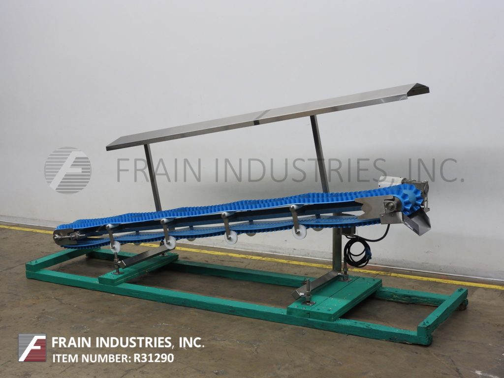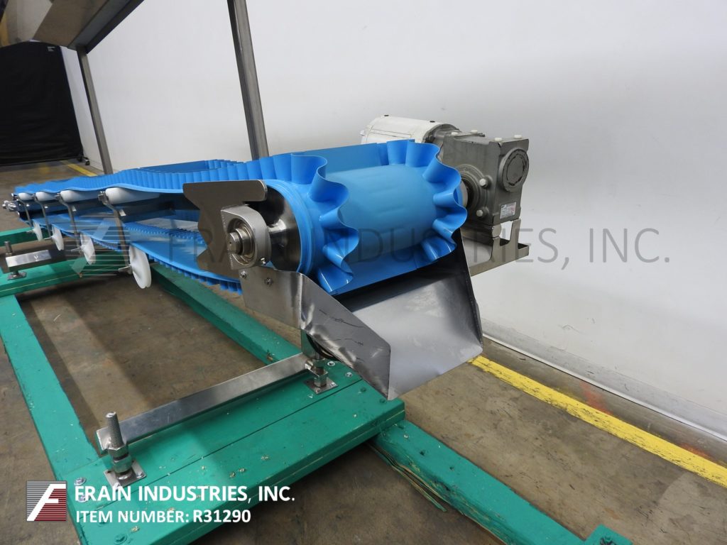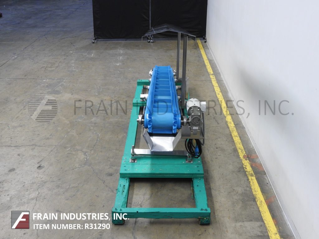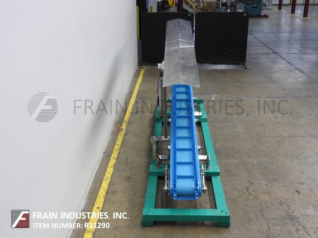 返回所有设备HiMEC,不锈钢,倾斜楔形输送机每小时产品磅数-取决于材料和应用。配备15"至27"饲料高度,9"宽食品级传送带2"高夹板设置在12½"中心。输送机有176"长的倾斜43"至55"放电高度。1 / 2马力电机驱动。安装在(4)腿不锈钢框架与脚轮。