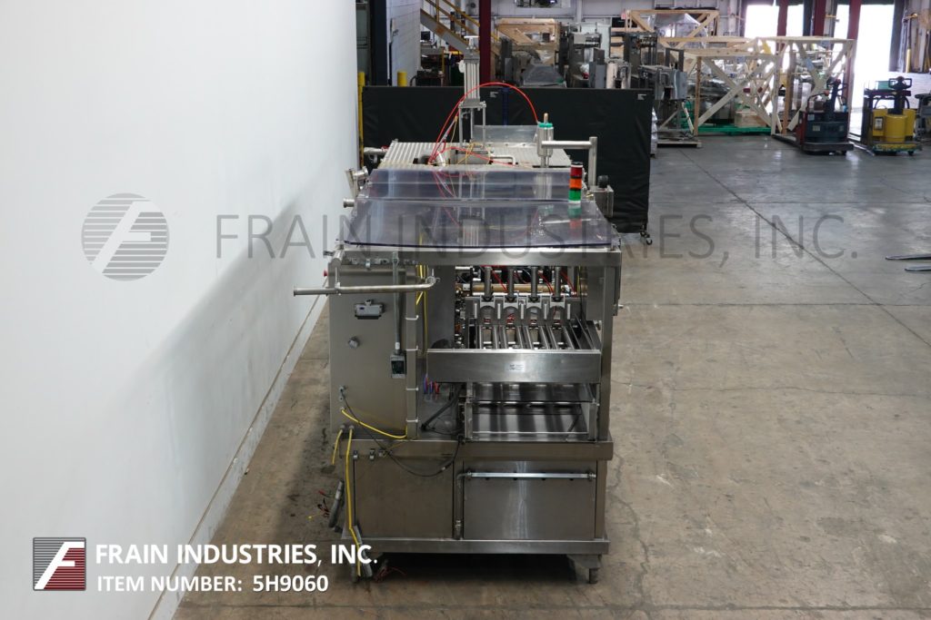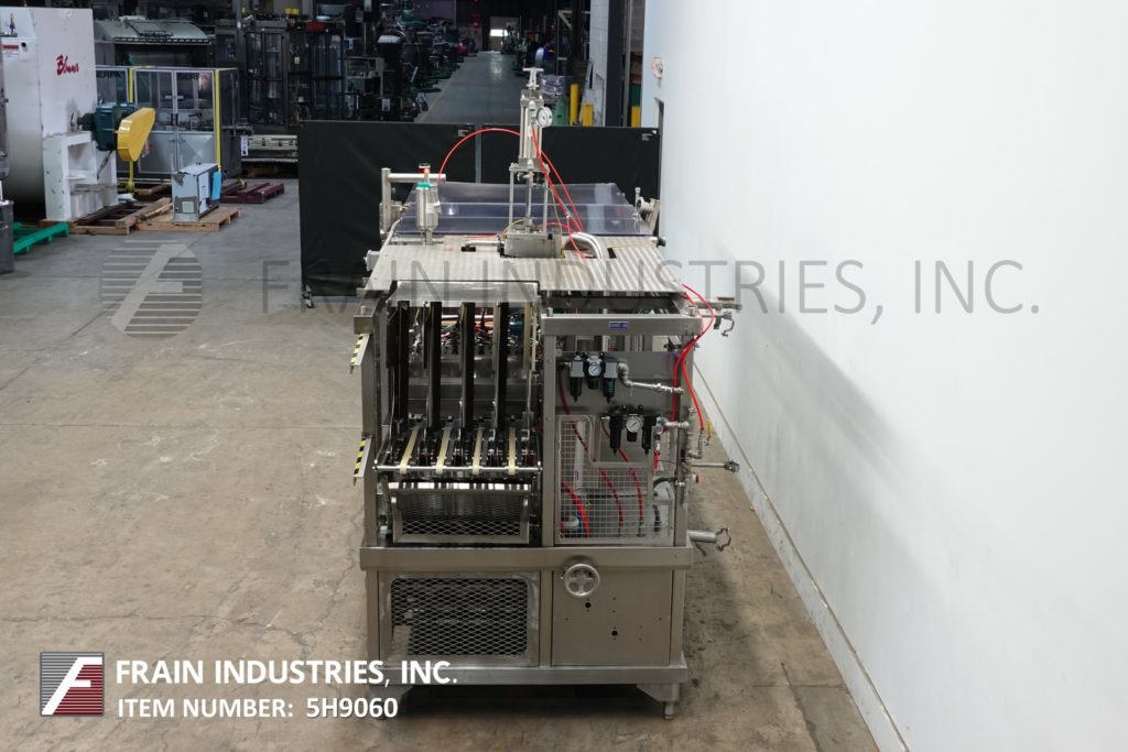 返回所有设备Holmatic型号of -2340,自动,4-up,内联杯灌装机,卷料膜,模切机,热封口机和超过lider额定每分钟40个指标的杯数-取决于材料,应用和机器配置。全不锈钢和阳极氧化铝结构。杯形尺寸:直径达5";身高6-1/4英寸。灌装尺寸:可达41oz + / - 0.5%,都有适当的更换部件。配备(4)巷32“长自动带美联储杂志和denesters空杯,杯输送机22-1/2“长板(4)4 1/2“ID杯口袋设置7日”中心,(4)7“长x 2”OD活塞旋转阀和1 - 1/2“OD积极关闭喷嘴,23”长卷筒材料膜辊(4)模具刀具、热封口机和杯盖杂志,与旋转滚轮盖上涂抹器。控制面板有A/B控制器,A/B panel view和(4)热封控制器,具有系统复位,循环,电子停止按钮控制和静态灯条。安装在不锈钢框架与联锁笼式安全保护和水平腿。