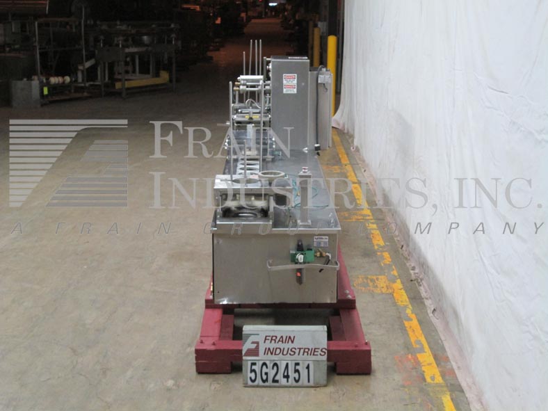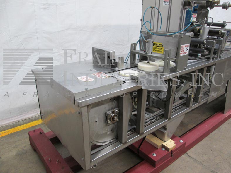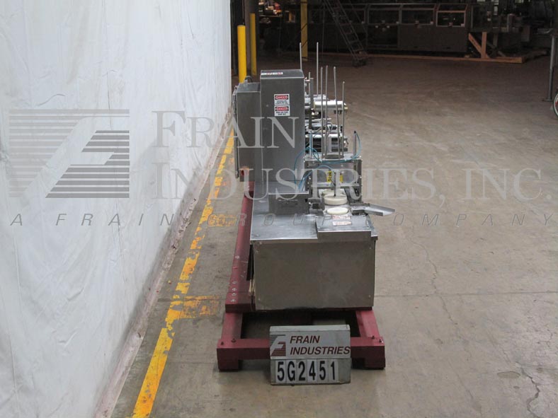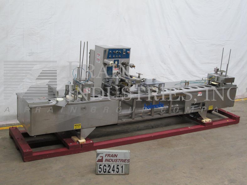 Back to All EquipmentHolmatic Model PR1S, automatic stainless steel single lane cup sealer and over lidder rated from 10 to 40 containers per minute – speeds depending on materials and application. Container size: up to 7" in Diameter; up to 6" in Height. Fill volume up to 90oz – with proper change parts. Equipped with 27" magazine cup de-nest station, roll fed tamper evident film with die cut and heat sealing station, pick and place style over-lidder with 27" magazine and automatic eject. Control panel has denest, fill, lid, conveyor, heater on/off switches, temperture controller with e-stops and mounted on stainless steel base frame.