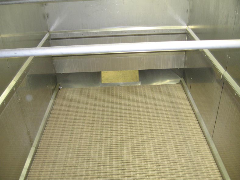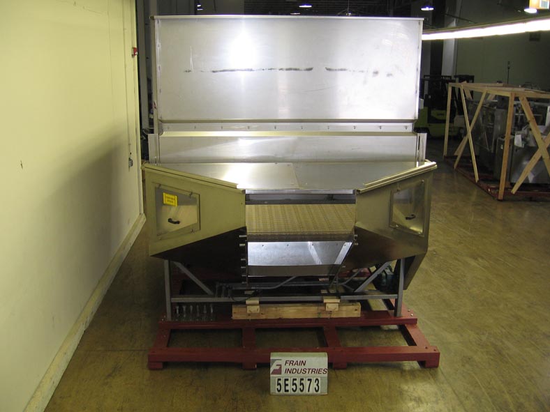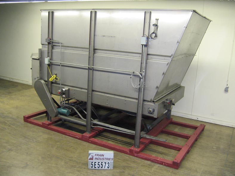 大料斗,38“长x 96”宽x 82“D产品料斗,有138“长x 96”W塑料网输送带138“长x 14”H终端产品排放34“地板间隙,有电机驱动保护和e-stop。