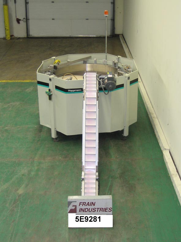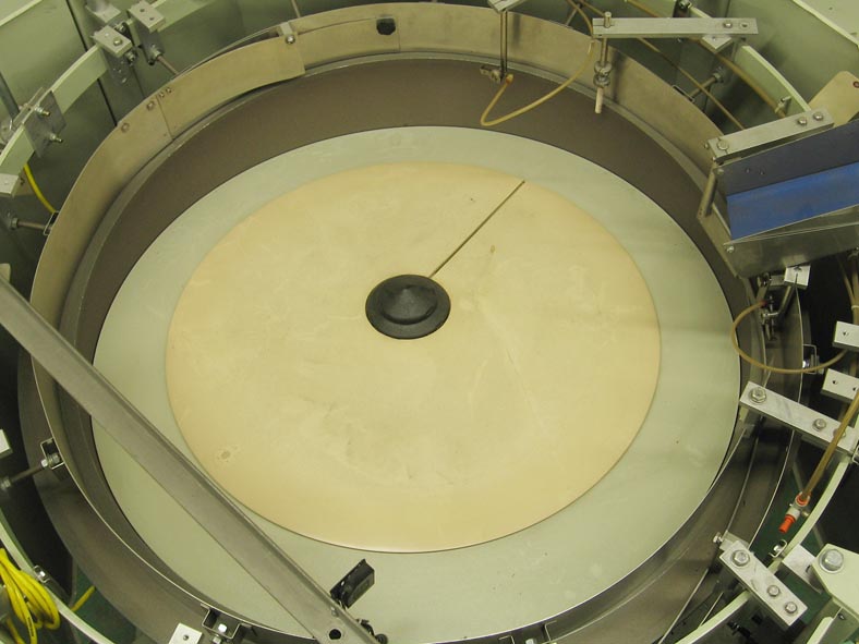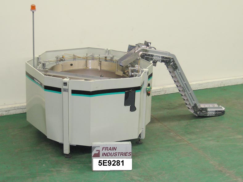 50"直径(25立方英尺)容量离心碗给料机额定为2000份/分钟。环直径72",底部外壳直径50"。配备一个8'L Z框架cleated进给与1 1/2" H cleats。安装在可调节高度的螺丝腿上。