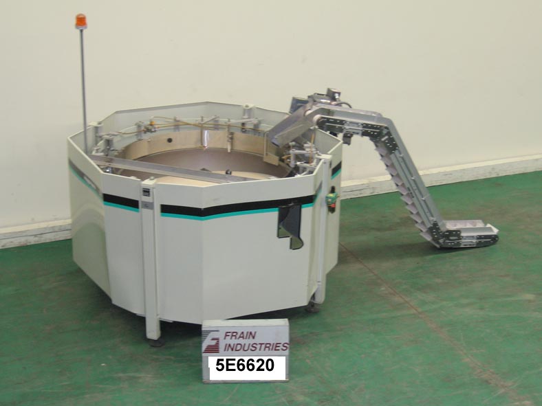 返回所有设备50" diameter (25 Cu Ft) capacity centrifugal bowl feeder rated to 2000 parts per minute. Ring diameter of 72" with a bottom shell diameter of 50". Equipped with an 8’L Z frame cleated infeed with 1 1/2" H cleats. Mounted on adjustable height screw legs.