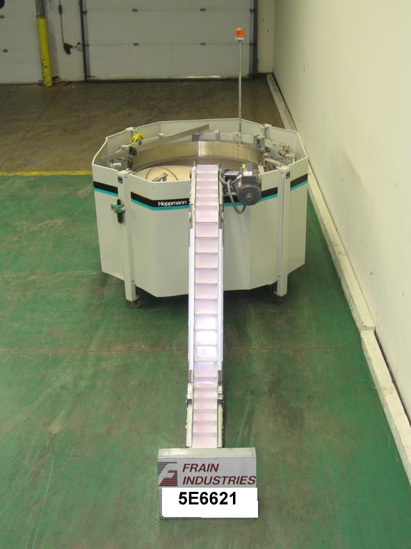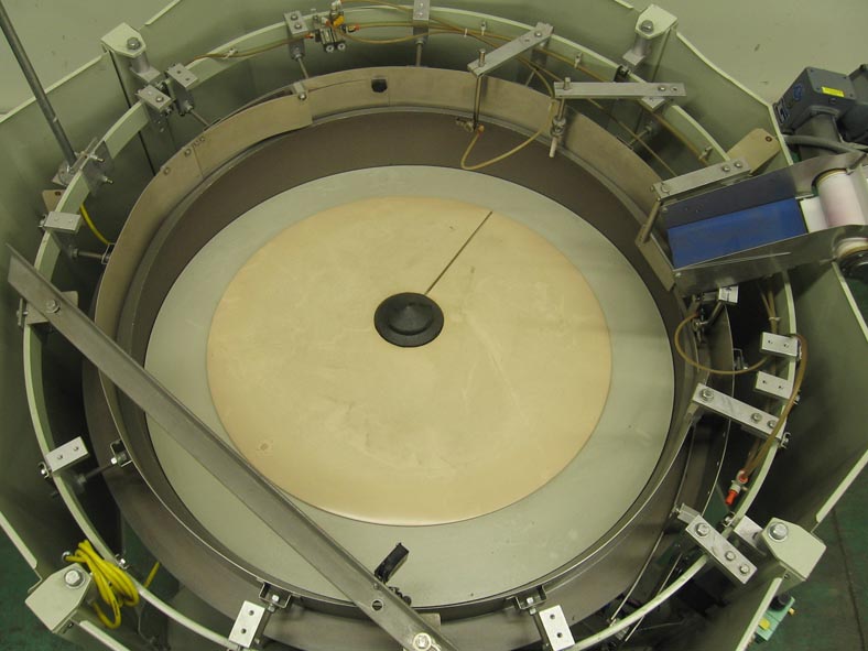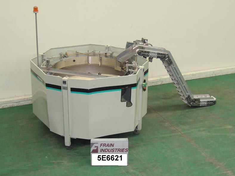 50"直径(25立方英尺)容量离心碗给料机额定为2000份/分钟。环直径72",底部外壳直径50"。配备一个8'L Z框架cleated进给与1 1/2" H cleats。安装在可调节高度的螺丝腿上。