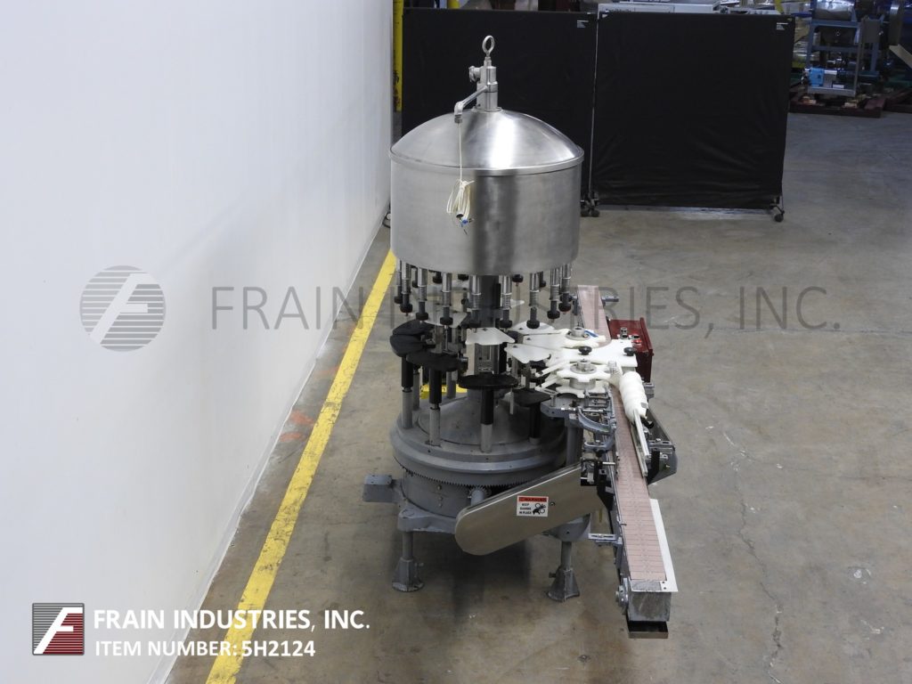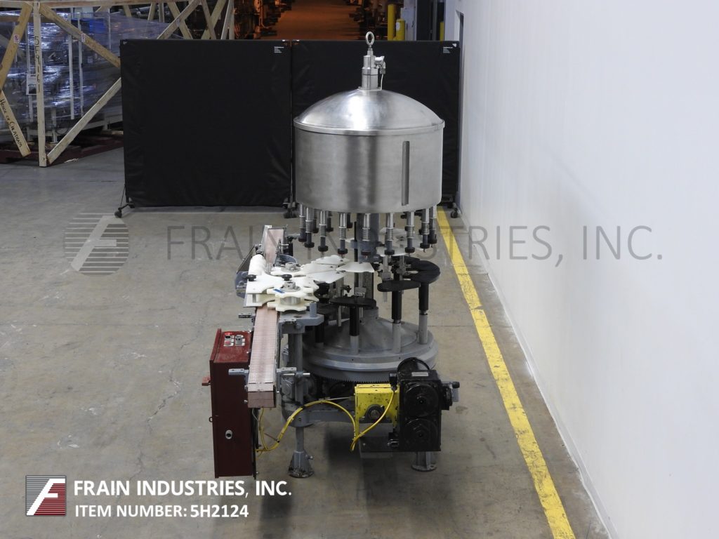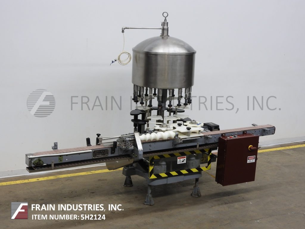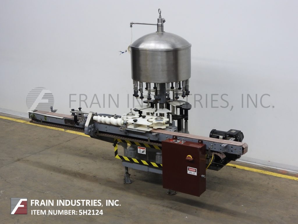 返回所有设备Horix Model HBP 9-18-59,自动,18头,旋转,压力重力填充器,每分钟的容器数量 - 取决于材料和应用。最大容器直径:6-1 / 2“在圆形和矩形容器上运行9个填充阀和机器配置和机器配置。所有不锈钢接触部件。配备140”长x 4-1 / 2“宽塑料delran产品输送机用蜗杆螺钉到饲料和放电和集装箱导轨,30“od炮塔,拥有(18)5/8”OD喷嘴,设置在5英寸中心,7-1 / 2“长x 6-1 /2“宽阔的容器底座用于底部填充,没有容器/无填充架空产品饲料系统。控制面板具有填充器和输送机启动,停止开关和启动,停止,电子停止按钮。安装在重型基础框架上。