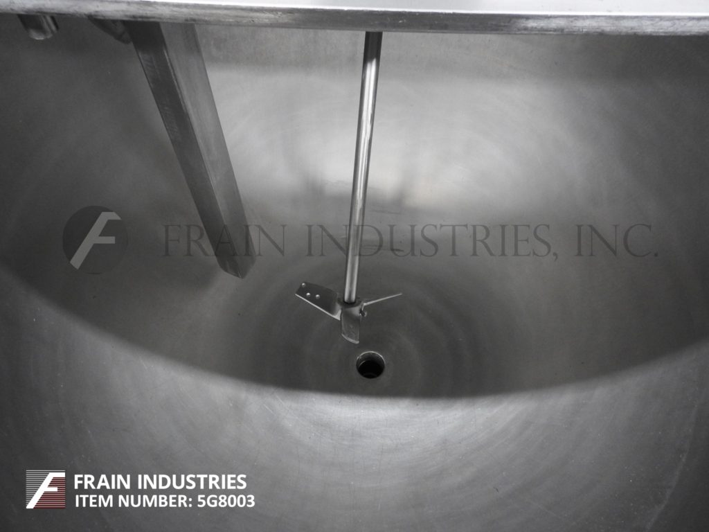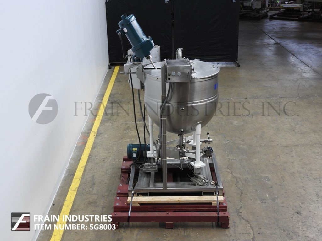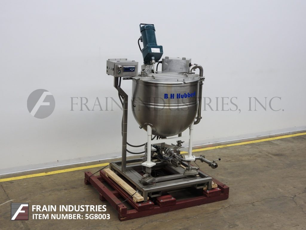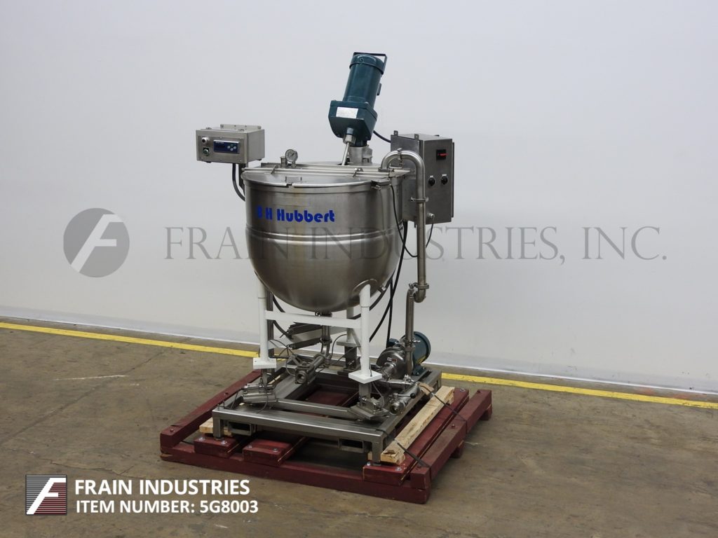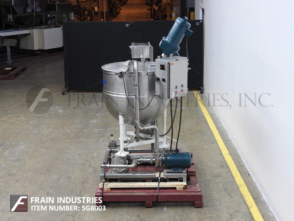 返回所有设备休伯特,容量100加仑,304不锈钢夹套水壶。容器尺寸:35"直径x 30"深,13"直壁。配备翻盖,提升炉排,温度测量,变速1.74马力侧安装水翼搅拌器与2½“外径/ 2”ID三钳式底部排放和28“地间隙。安装在不锈钢平台上的梅特勒托莱多负载传感器和Waukesha,型号2065,由5马力驱动的变速离心泵。