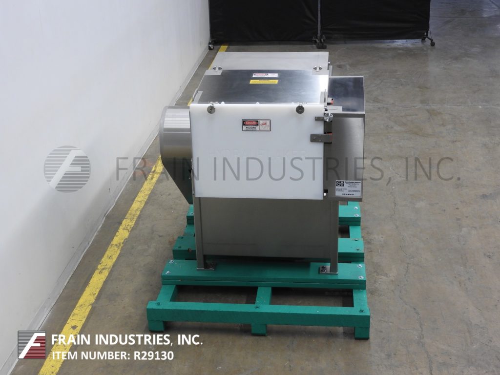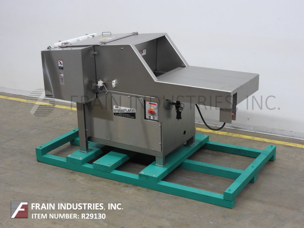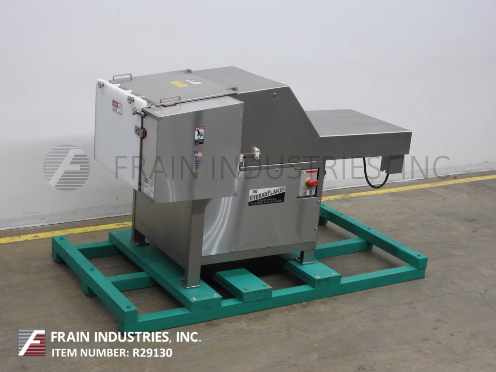 返回所有设备Gemac型号2501 Hydraflaker,不锈钢,冷冻断块器,额定每分钟1至3块,具体取决于材料和应用。块尺寸最大24英寸长:24英寸宽;10英寸的高度,降低到0°F,可以减少产品1/4英寸厚在18到30秒,1/32英寸厚在2分钟加(取决于产品)。配有30"宽x 69"长产品进料台22"宽x 6-1/2"高液压产品冲压件28"长x 12"外径(8)刀片旋转滚筒切割组件有翻转安全盖联锁关闭和30"宽卸料溜槽与46"地板间隙。安装在(4)腿基础框架上。
