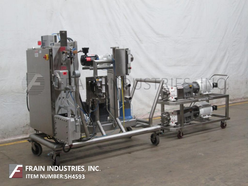 返回所有设备Ika-Works型号MHD 2000/10,连续液体/固体,混合,均质和分散系统,能够处理高达80%的固体浓度,额定为1500升液体和2900磅的粉末/颗粒每小时-取决于材料和应用。所有316 l不锈钢接触液体的部件,1/2惠普顶部安装马达驱动与Sunco不锈钢,清洁锁,固体旋转计量阀7“OD /半”ID x 19-1/2“长产品混合室3”OD固体入口,2 - 1/2“OD液体入口,2 - 1/2 OD最终均质,分散出口和2 - 1/2”OD流量计港口内部进料螺旋,混合桨和转子/定子系统,20马力主电机驱动。控制面板有A/B CPU与A/B变速控制器,Stahl触摸板控制器与读数和e-stop也液体流量控制和压力表。安装在带脚轮的不锈钢管状底座框架上。