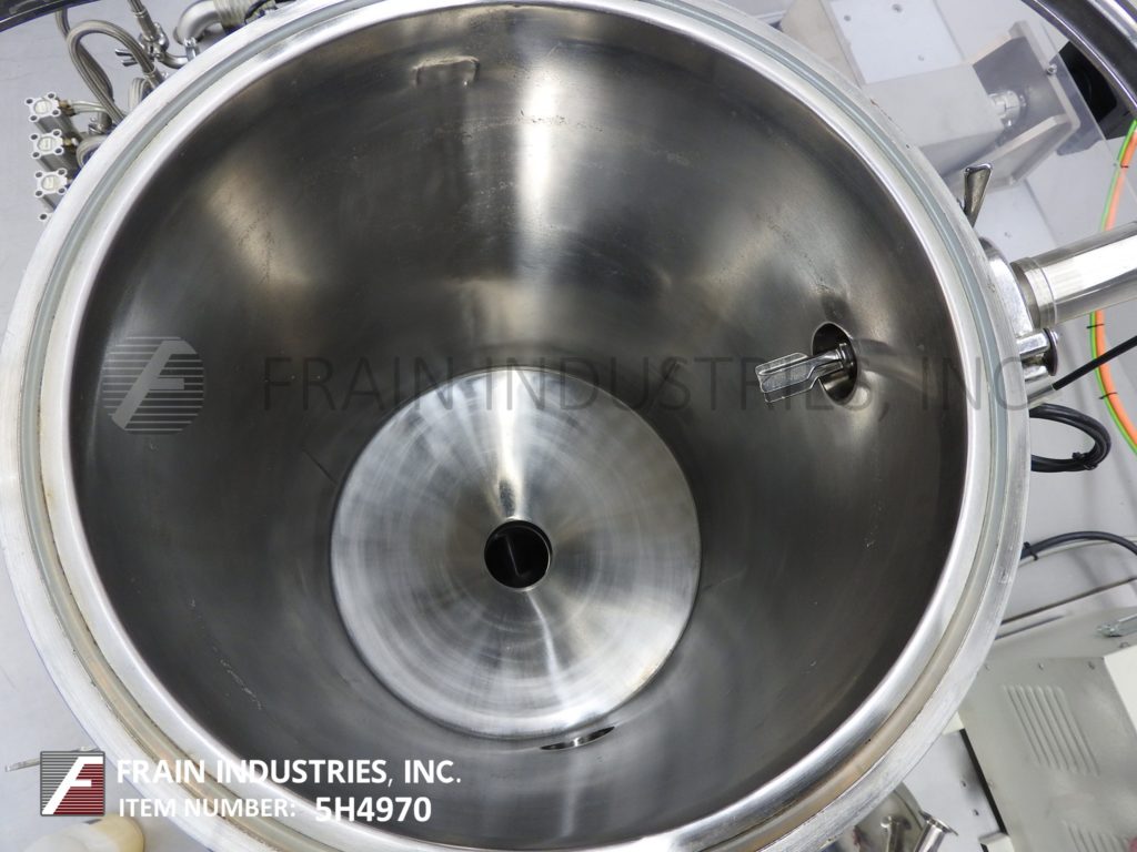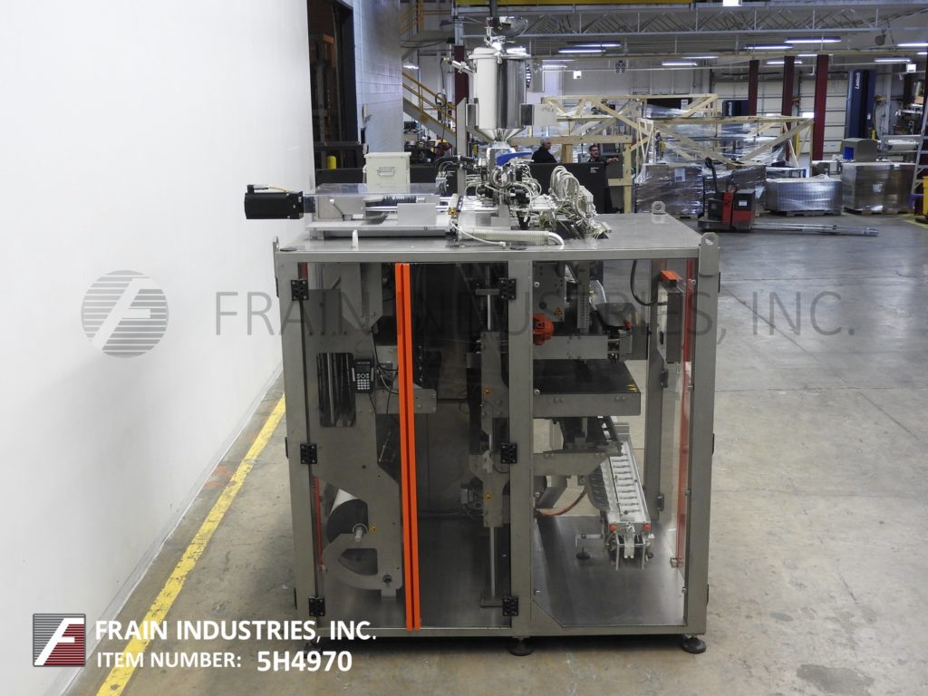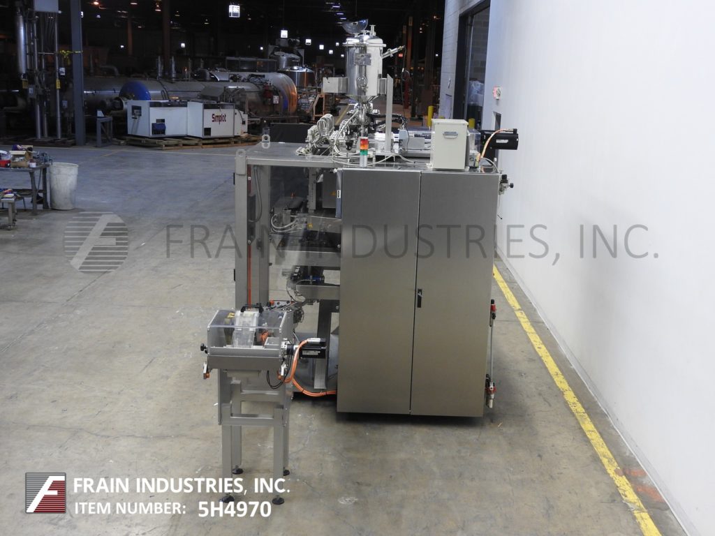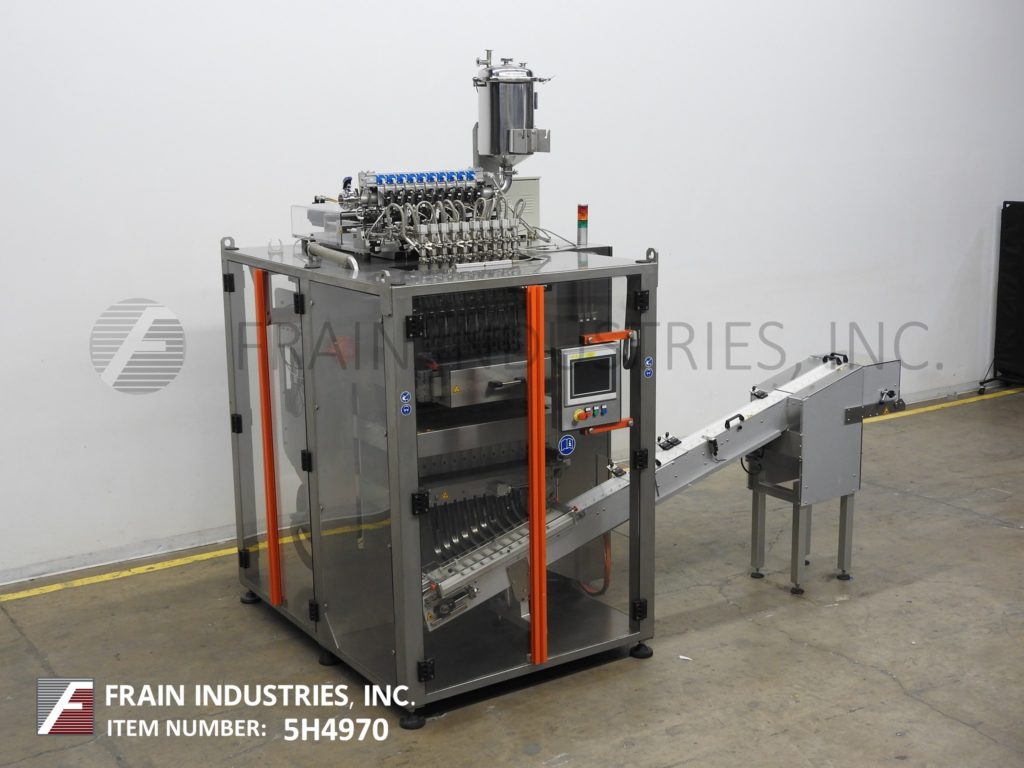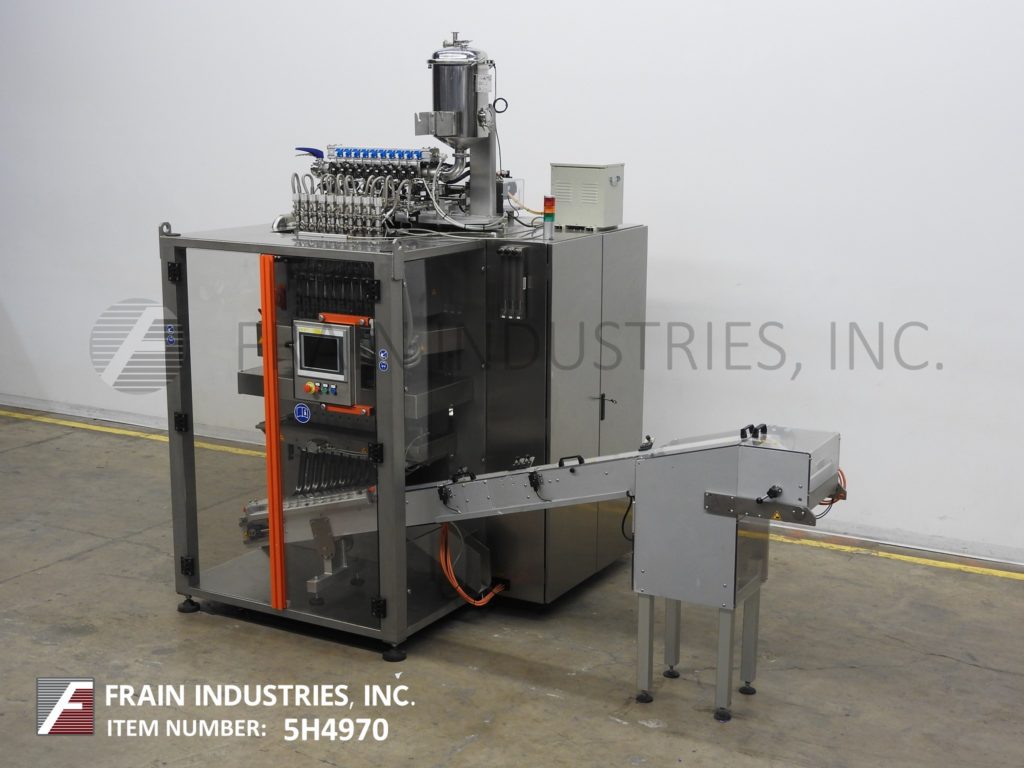返回所有设备Inever包装/矩阵模型MLS6/10,不锈钢,10头,垂直,棒包装,成型/填充/封口机额定50至450包每分钟-取决于材料和应用。最小/最大包装尺寸范围:17mm至25mm宽;长度60mm至200mm。采用不锈钢加压产品料斗,配有卫生活塞和加液器和伺服驱动器,均安装在带CIP和超声波液位控制的贴包机上方。薄膜分切机和成型管,与(10)1“外径灌装喷嘴设置在2-1/2”中心,和1“长垂直搭接密封与25”宽横切密封条。最大胶片卷直径为600mm,最大胶片卷宽度为600mm,具有120"长x 2-1/4"宽的倾斜cleated排料输送机,3/4"宽x 3/4"高cleats设置在2-1/4"中心。控制面板有PLC控制器和触摸板控制和读出,伺服驱动器与变速控制器和启动,停止,复位,e-stop按钮和手持式控制器。包装机安装在不锈钢底座框架上,设有联锁安全门和统计灯。