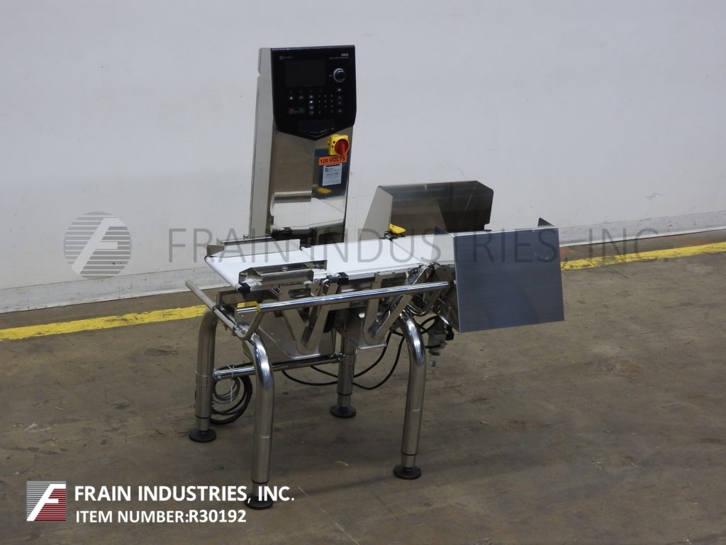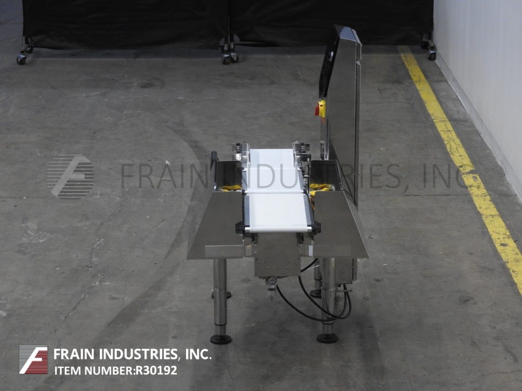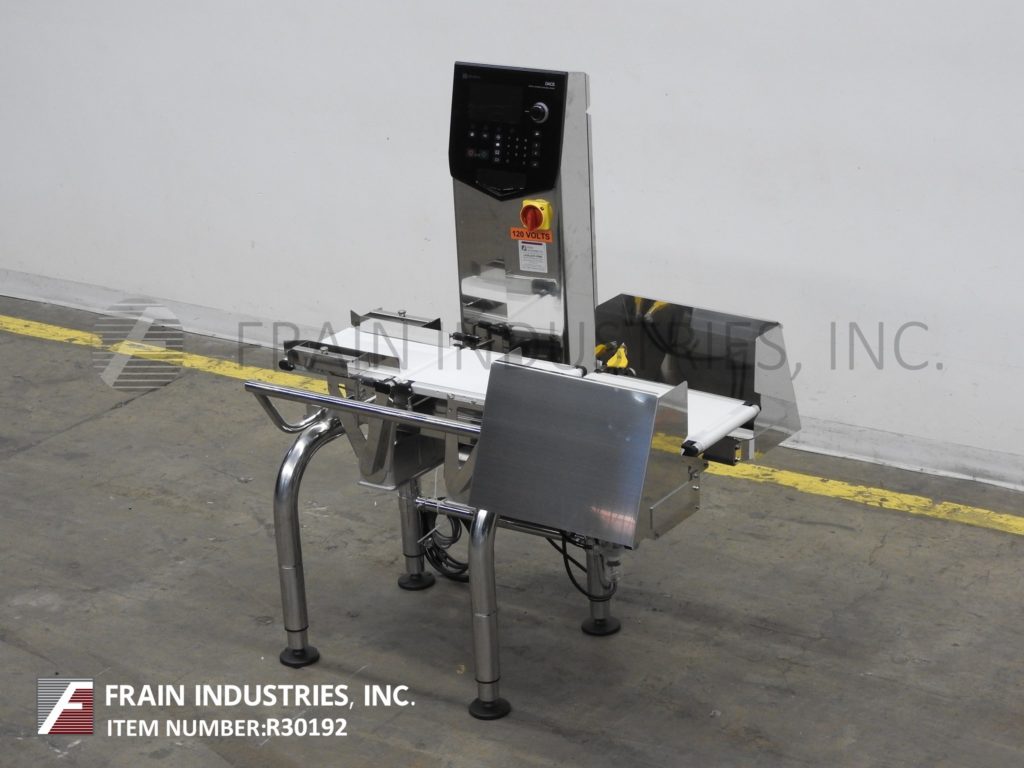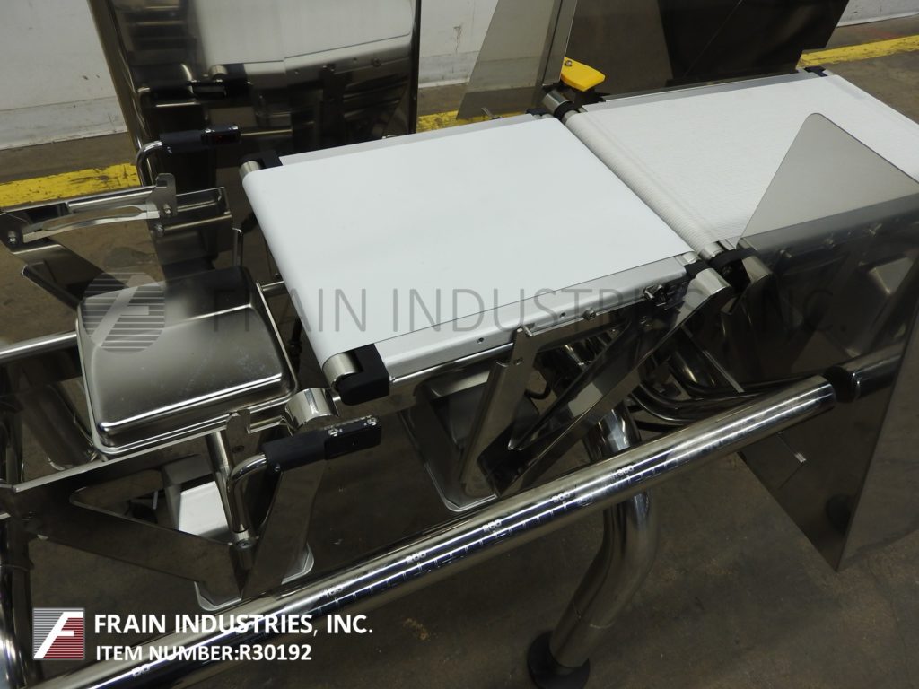 返回所有设备石田DACS,自动,三个区域,不锈钢校验秤额定高达300英尺每分钟。测压元件:长度为14英寸;9.5”宽。重量范围:6至600克或15至1500克。精度:±0.1克或±0.2克。配备14"长× 9.5"宽氯丁橡胶进料输送机,不锈钢导轨,14"长× 9.5"宽氯丁橡胶称重输送机,18"长× 9.5"宽氯丁橡胶卸料输送机,双鼓风(一个在上/一个在下)和触摸屏操作界面与可视化显示。安装在可调节高度的腿。每分钟产品数量和精度取决于材料,应用,机器配置和环境。