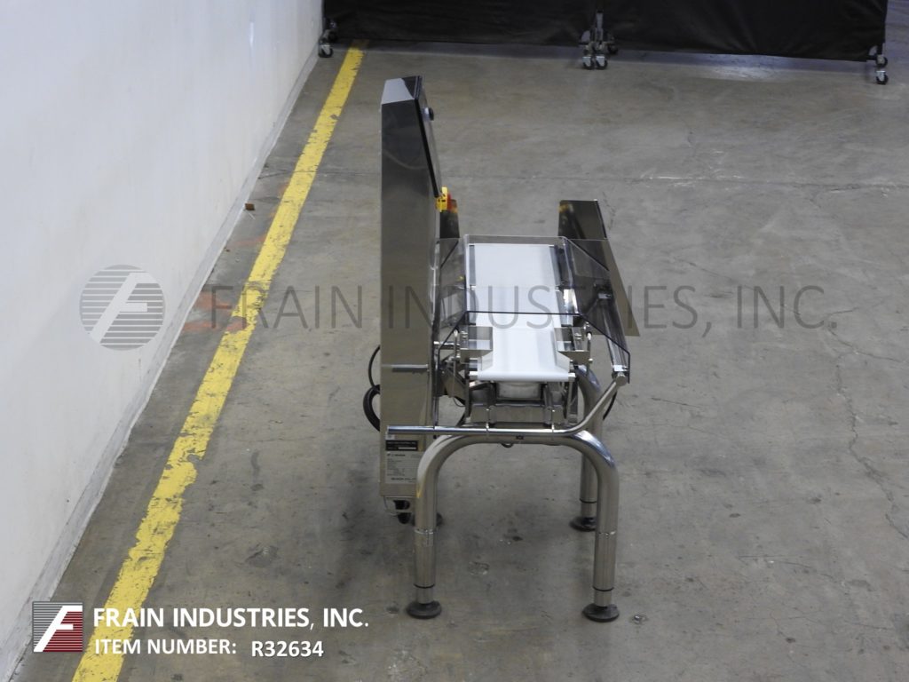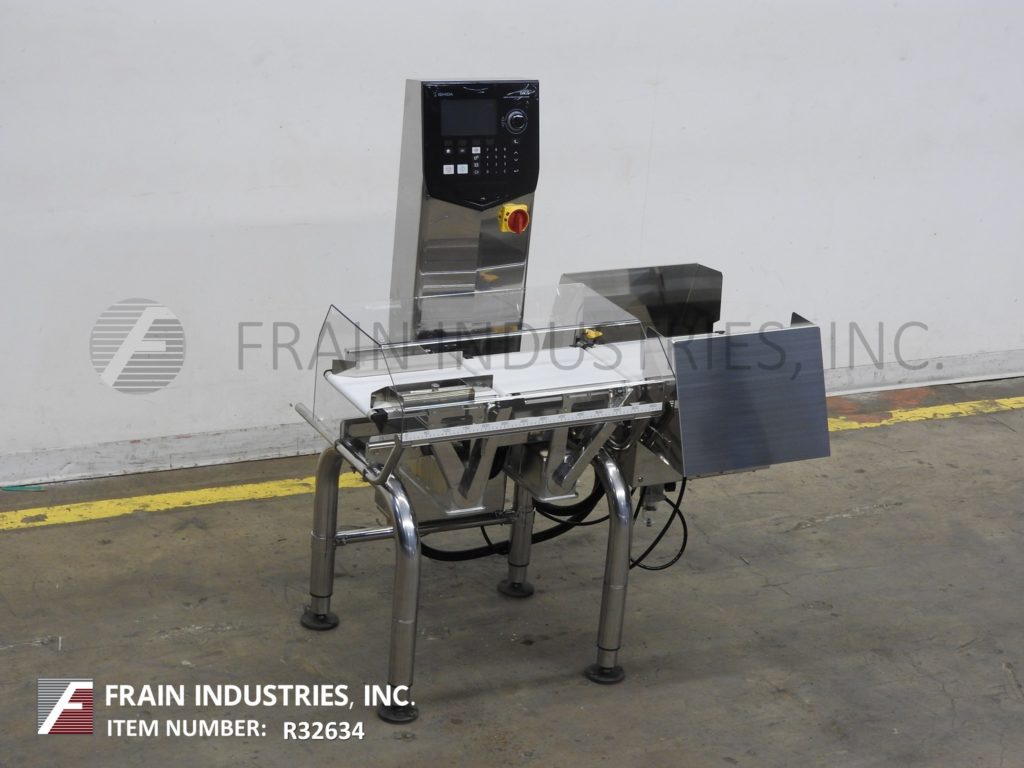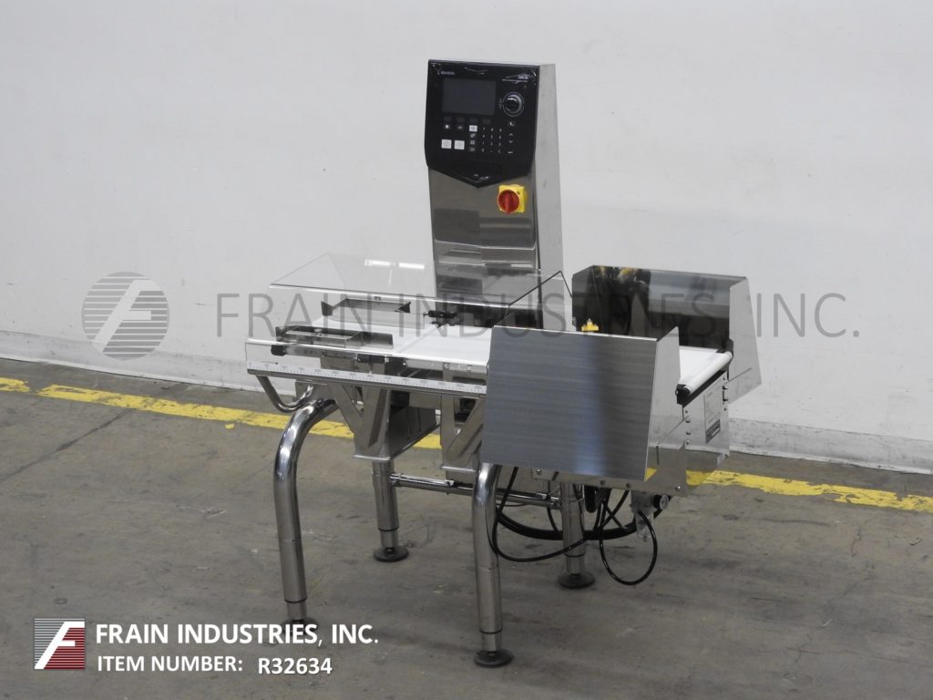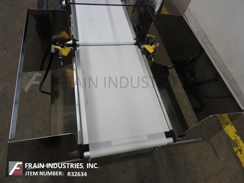 返回所有设备石田DACS-GN-S015-SS-1型,自动(3)区,304不锈钢校验秤。额定高达每分钟300英尺,产品数量取决于材料和应用。测压元件:长度为14英寸;9.5”宽。重量范围:6至600克和15至1500克,精度:±0.05克或±0.01克,精度取决于材料,应用,机器配置和运行环境。配备13.8"长x 9.5"宽氯丁橡胶饲料输送机,不锈钢导轨,13.8"长x 9.5"宽氯丁橡胶称重输送机,17.7"长x 9.5"宽氯丁橡胶卸料输送机与双吹风废弃物(一个/一个下)。控制面板带有触控板操作界面,7寸全彩色LCD显示,300个“预置”产品程序,SUSB记忆棒带有x -条形图和直方图,RS232串行输出原始重量数据。安装在(4)高度可调腿上。