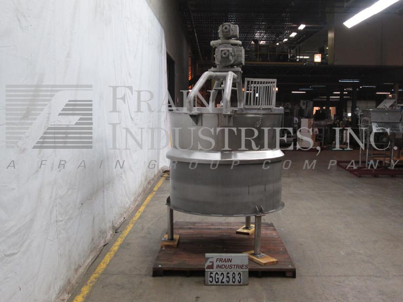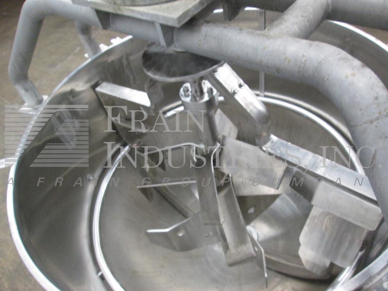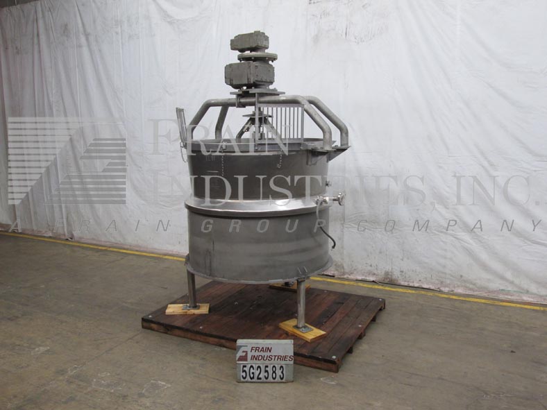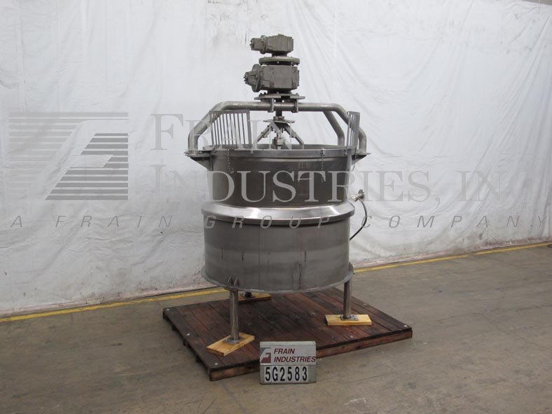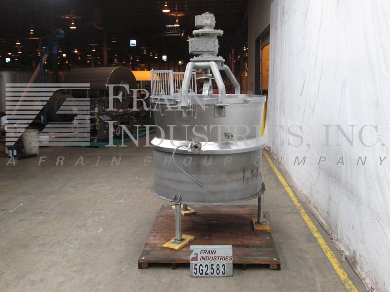 返回所有设备HICKS设备,700加仑,304不锈钢双动夹克水壶。船舶尺寸:66“直径; 23英寸”直壁。夹克评分:110psi @ 344°F;110psi @ -20°F。开放式顶部设备配备桥式装有12个桨叶的圆锥形圣诞树内搅拌,由7½HP驱动器和外部扫描驱动器供电。直墙上的一个2½“OD /1¾”ID Tri-Clamp风格接入配件,两2“螺纹和两个螺纹夹套端口,温度探头和一个2”ID内液注射环,具有6“OD / 2”ID 4螺栓法兰配件。一个11“OD / 6”ID八个螺栓法兰中心底部放电,18“接地间隙。水壶安装在带腿的不锈钢底座上。
