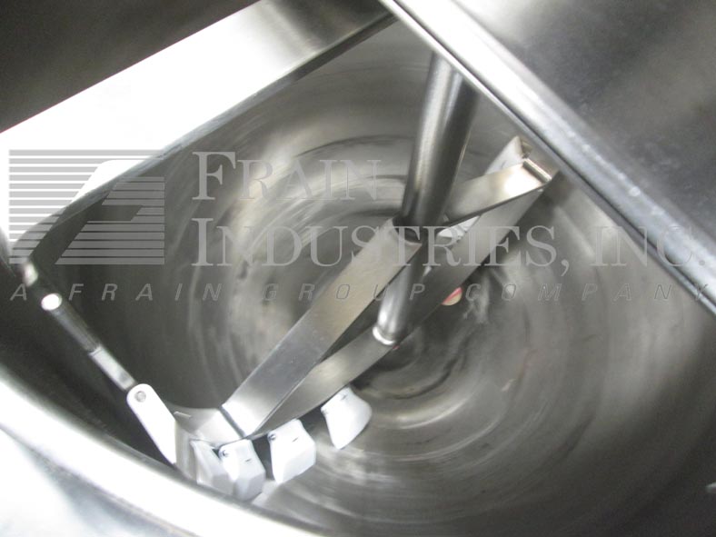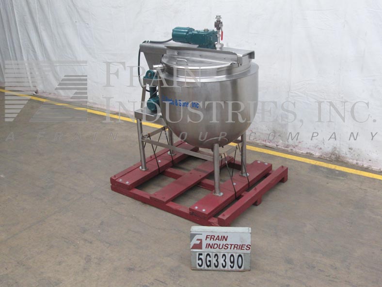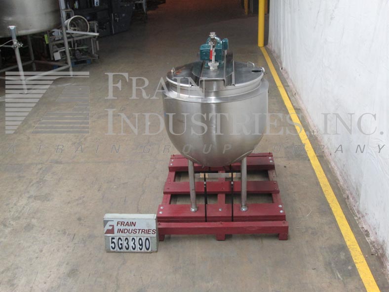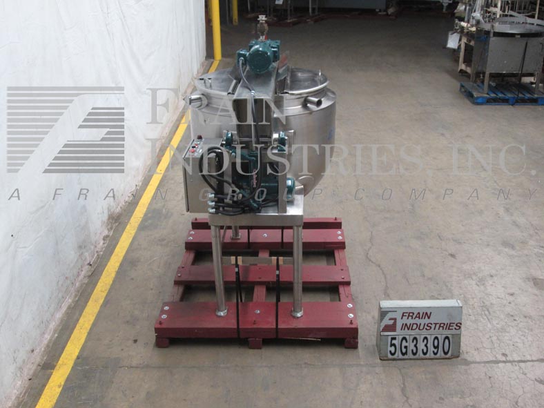 返回所有设备JC Pardo & Sons, 100加仑,316不锈钢,夹套,刮面水壶。容器尺寸:36"内径x 36"深度,MAWP: 40 psi @ 287°f。配备有桥式刮刀表面搅拌器,带有双顶盖和液压倾斜。CIP喷淋球,(3)7/8”内径螺纹夹套进/出口,(2)2-1/2”外径卫生级端口,2-1/2”卫生级中心底部排放与蝶阀,18”离地间隙。另外,具有启动/停止/倾斜控制的控制面板。全国委员会:1587