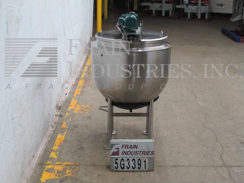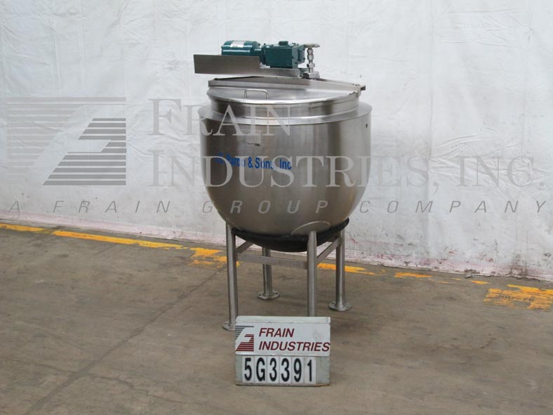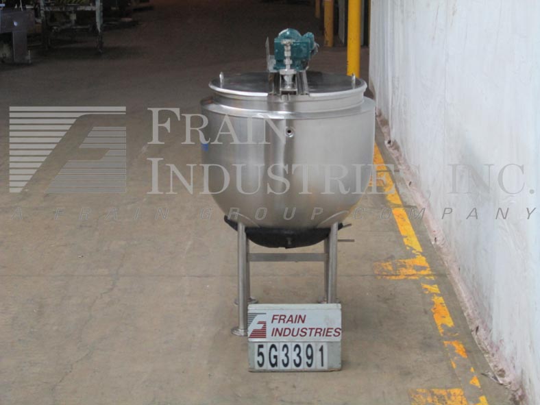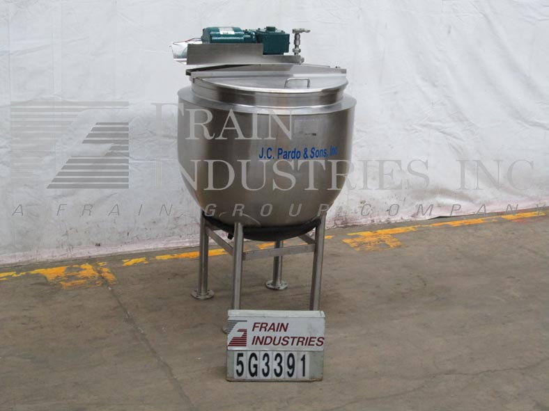 返回所有设备J C Pardo&Sons,100加仑,夹套316不锈钢混合水壶。混合碗的36英寸直径为16英寸的直壁和半球形底部。配备双翻盖顶盖,桥梁安装了1/2 HP刮搅拌。桥梁有(1)2“OD / 1”ID卫生配件,用于CIP喷射球。全套夹克额定MAWP为40PSI @ 287度F与(3)1“螺纹入口/出口端口。底部有(1)2.5”OD / 1.75“ID卫生中心底部放电和(1)2”ID六个螺栓法兰,具有1.5“中心。18”接地间隙并安装在(4)不锈钢腿上。