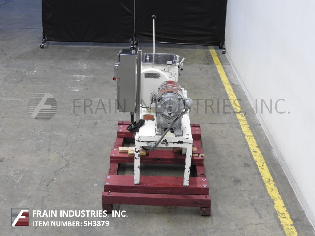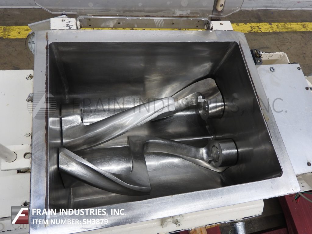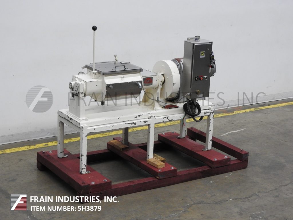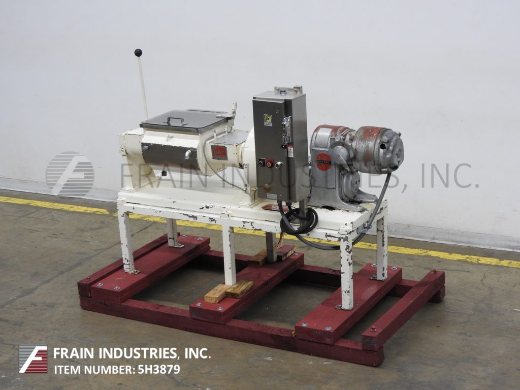 Back to All EquipmentJ H Day, 1 ft³ (7½ gallon) / 0.67 ft³ (5 gallon) working capacity, jacketed, double arm, sigma blade mixer. Inner mixing chamber dimensions: 15¾" in Length; 12" in Width; 10¾" in Depth. Equipped with 304 stainless steel contact parts, 3 Hp motor drive with variable speed gearbox, hand tilt with 28" discharge height and ½" NPT jacket connections.