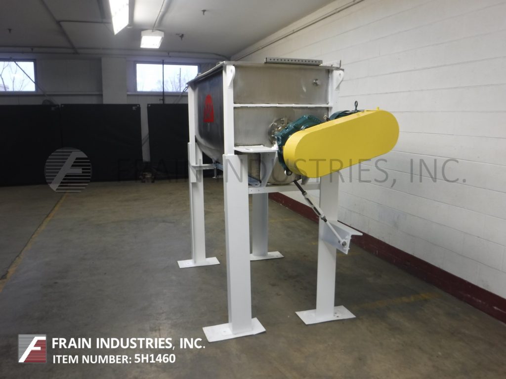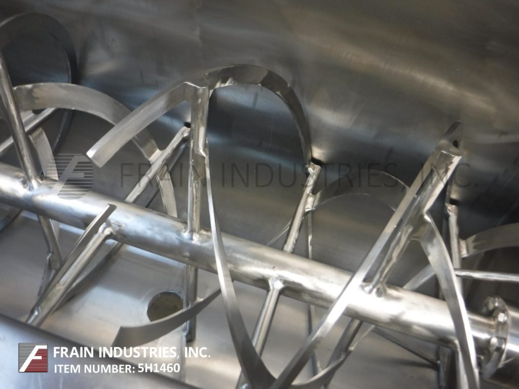 返回所有设备J H日,30英尺(25英尺可行)304不锈钢双带搅拌机,每小时磅产品 - 取决于材料,应用和机器配置。内部混合室尺寸:60“长度;宽度为28½”;33“深度。配备翻转盖并具有12个”直径磨碎的端口,1“NPT接头,可选择的喷杆,3”直径电机轴,3½“直径轴,宽X(3/8)”厚度为1¼“外部)和2“宽(内)X¼”厚不锈钢丝带。手动滑动阀门在4“中央底部放电,带119”x7¼“在39”落地间隙。由5 HP驱动器供电。安装在温和的钢(4)腿涂上底架。
