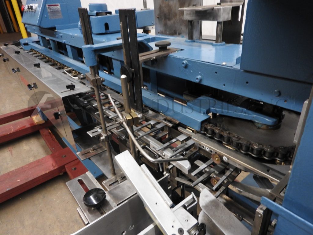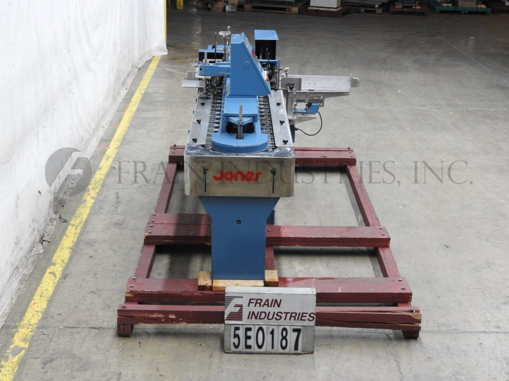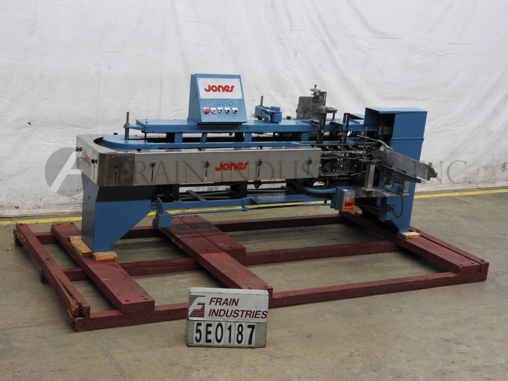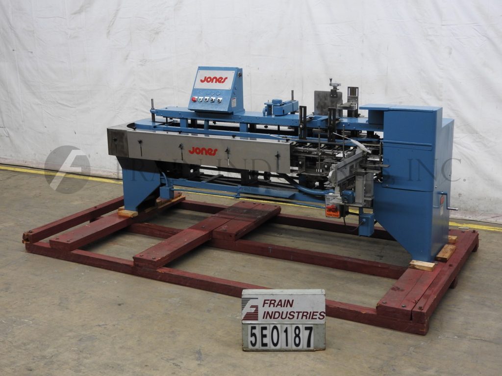 返回所有设备琼斯IMV5,间歇运动,垂直,折叠纸箱机,速度从30至60个纸箱每分钟-速度取决于材料和应用。纸箱长度:1" - 4";3/4" - 2-3/4"宽度;深度2-1/8" - 7"配备一个26"纸箱杂志,往复真空挑选和放置纸箱转移,2链驱动与5"中心,E-stop,变速驱动控制器的产品在饲料,和状态指示灯。安装在施法者。