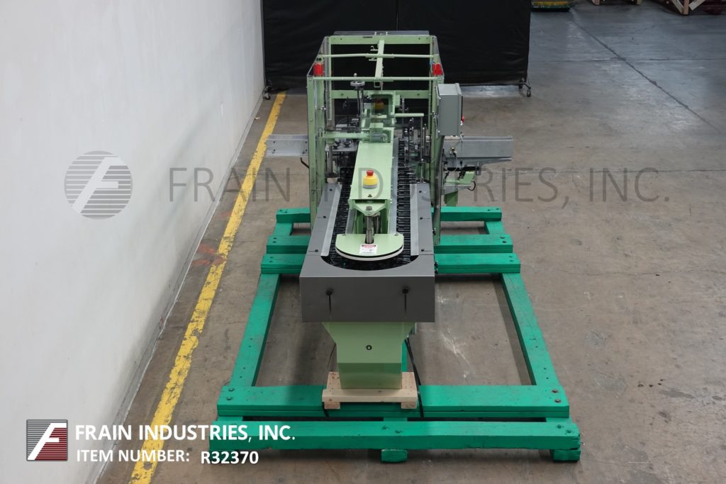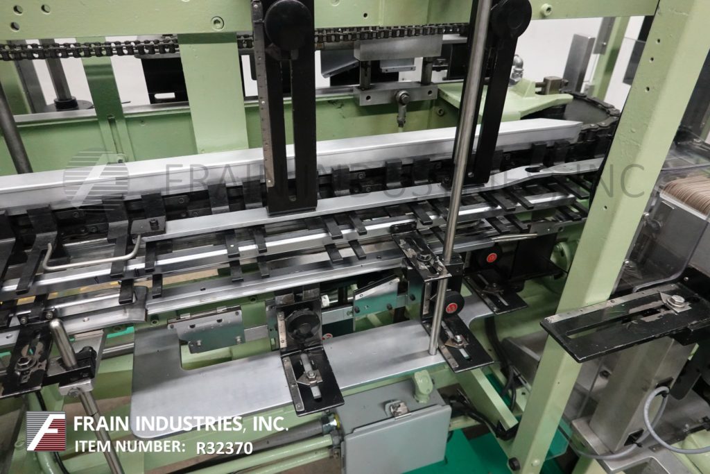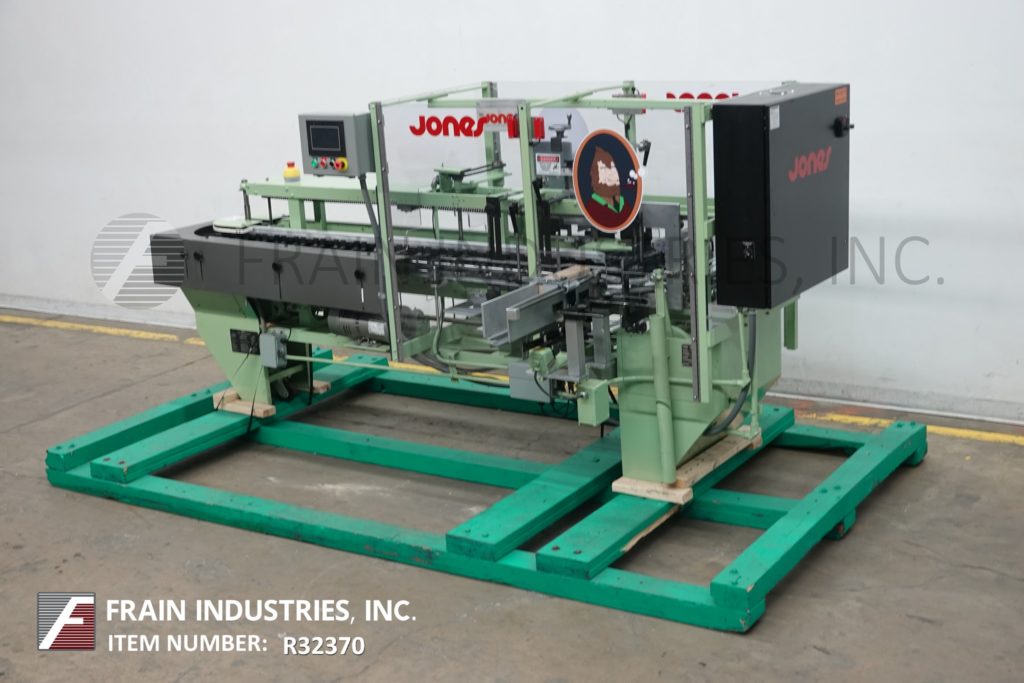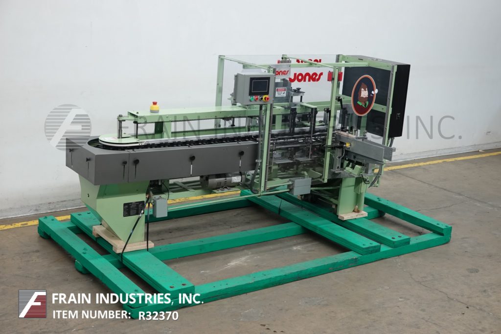 返回所有设备琼斯IMV5型,半自动,间歇运动,垂直卷盒机额定每分钟10至60个纸箱-取决于材料,应用,机器配置和操作熟练度。纸箱尺寸范围:1"至4"长度;3/4"到2-3/4"宽度;深度2-1/2"至7"。配备(2)链设置在5"中心,24"长的纸箱杂志,往复picn -place, 48"长的操作员负载区域每边,小皮瓣褶子,主要皮瓣关闭和独立的真空系统。控制面板有继电器逻辑控制,手持控制器和脚踏慢跑与统计灯。安装在重型框架与水平腿和安全防护。