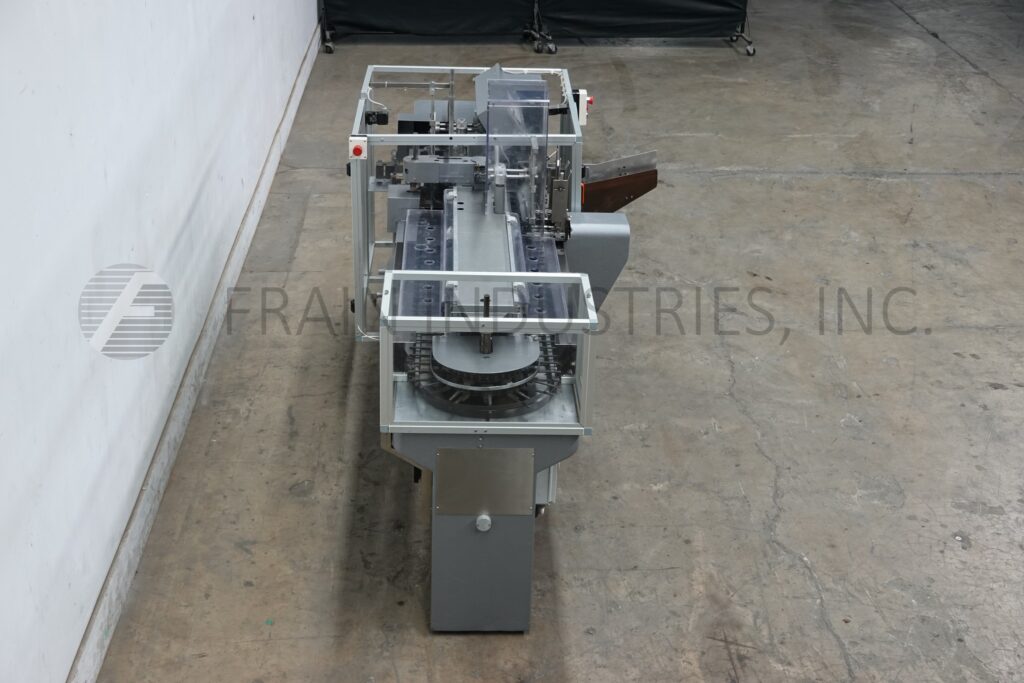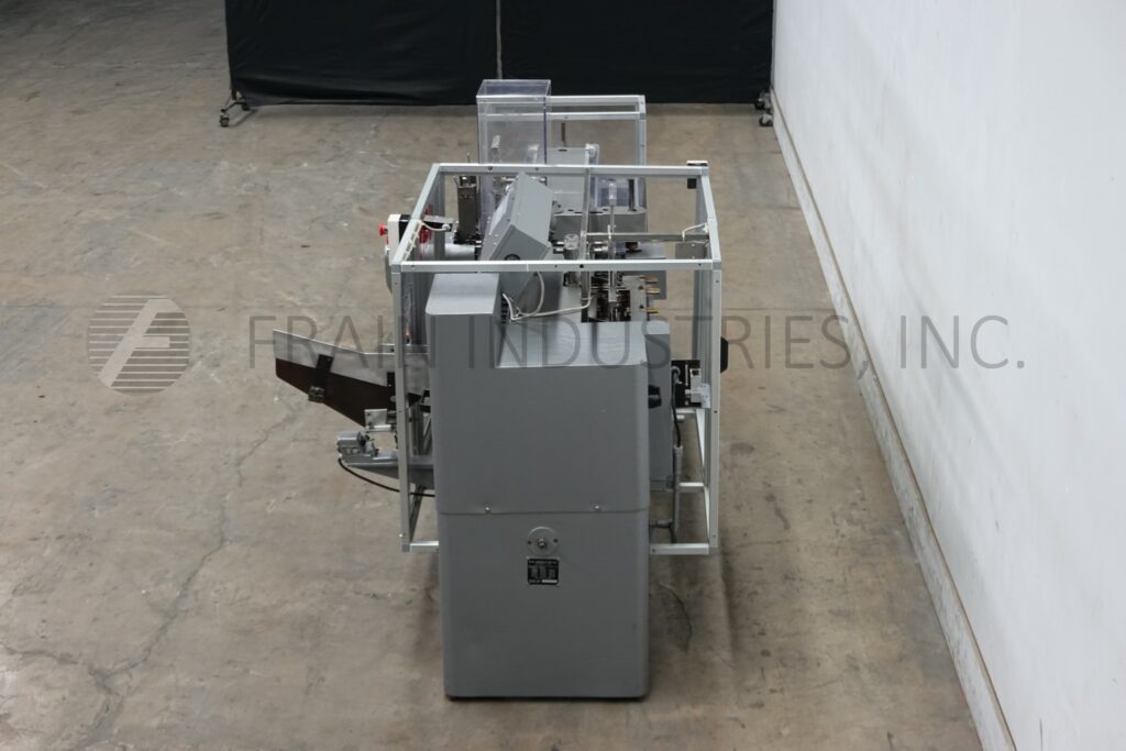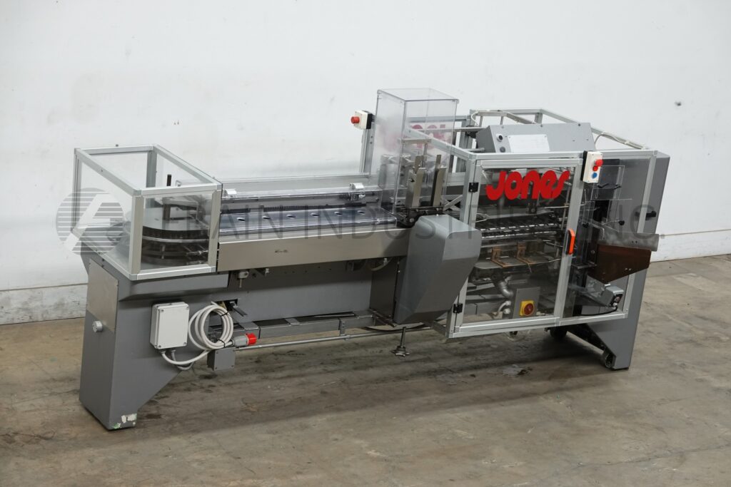 Back to All EquipmentJones, Model IMV5, Semi automatic, intermittent motion, vertical, tuck cartoner. Rated from 10 to 45 cartons per minute – depending on materials, application and operator dexterity. Carton size range: 1" to 4" in Length; ¾" to 2¾" in Width; 2-1/8" to 7" in Depth with proper change parts. Equipped with (2) chains fixed set on 5" centers, 21" long blank carton magazine, reciprocating pic and place, 38" long manual product load area each side, minor flap tuckers and major flap closers. Control panel with start, stop and e-stop push buttons. Mounted on heavy duty frame with lexan safety guarding.