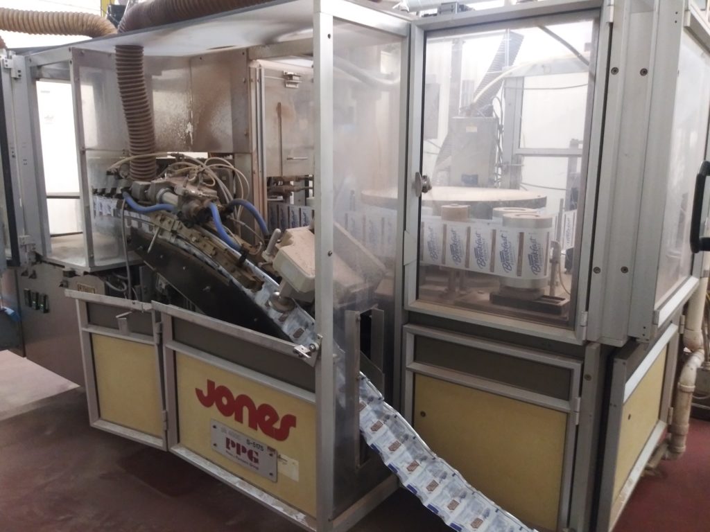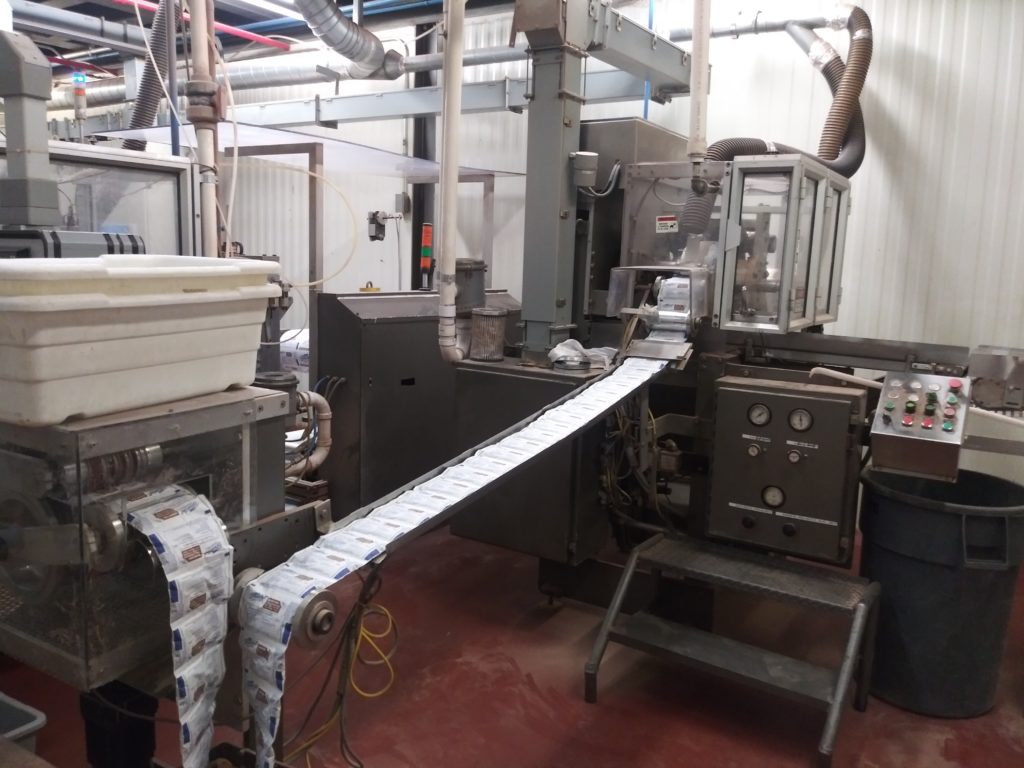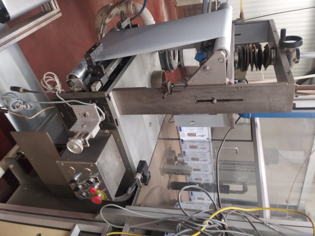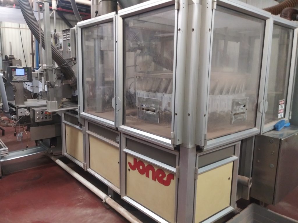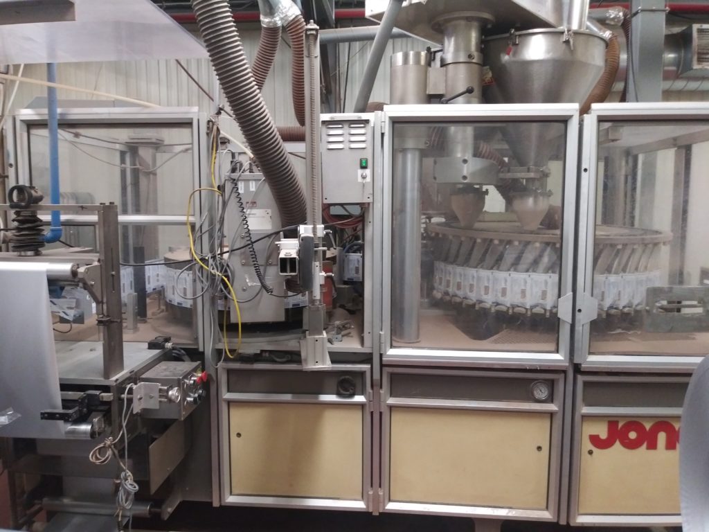 Back to All EquipmentJones Model PK4000, High speed, horizontal, continuous motion, form, fill and seal pouch machine rated up to 328 feet per minute with number of pouches – depending on materials, application, fill and size pouch. Machine is set on 3-1/2" centers currently running pouch 3-1/2" in Width x 6-1/2 in Height. Pouches are made from film stock unwind stand with (2) film rolls, the film is pulled from the rollers thru a forming plow that folds the roll stock length wise to form a pouch strip which is then wrapped at 180 degree’s around the vertical heated rotary drum sealer set on 3-1/2" centers, to vacuum transfer wheels that opens the pouch strip and takes them to the rotary 42 head filling plate with dual auger fillers, the filled pouch strip is then pulled thru top heat sealing bars, then turned 90 degress to rotary knife mechanism that cuts the pouch strip into individual pouches. Mounted on heavy duty frame with safety door guarding.