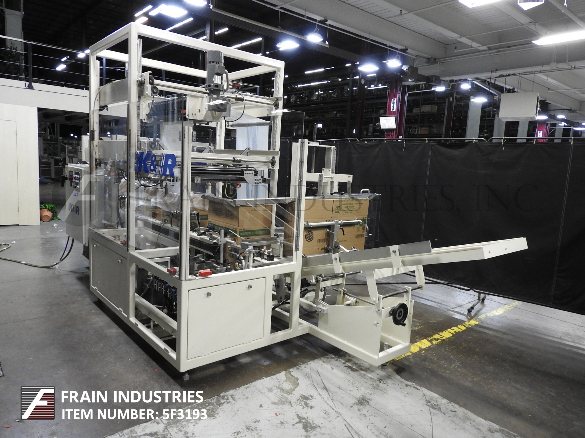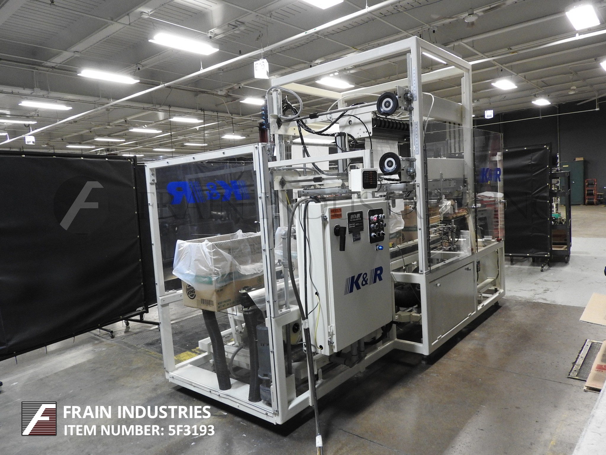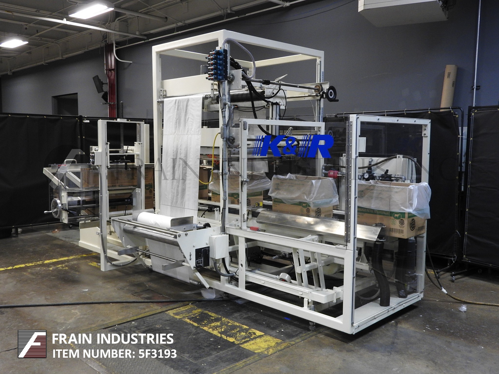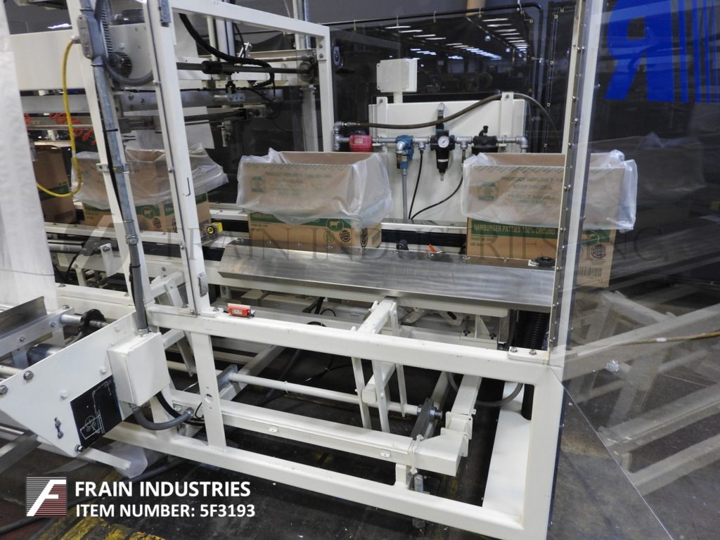 返回所有设备K&R型号PBI32,自动,案例竖立器和袋子插入器与底锥度,从5到20例每分钟速度 - 速度取决于材料和应用。案例尺寸范围:12“至22”的长度;9“到16”的宽度;高度为8“至18”。配备72英寸的长空盒杂志,3个吸盘真空镐和放置,108“长边夹持带式输送机,小翼片闭门,袋子打开/插入机械手指夹具,空气抽空真空系统带来多袋冲洗壳体的五个内侧,主要襟翼文件夹,2“底壳锥,A / B PLC,按钮控制和Lexan安全守护。