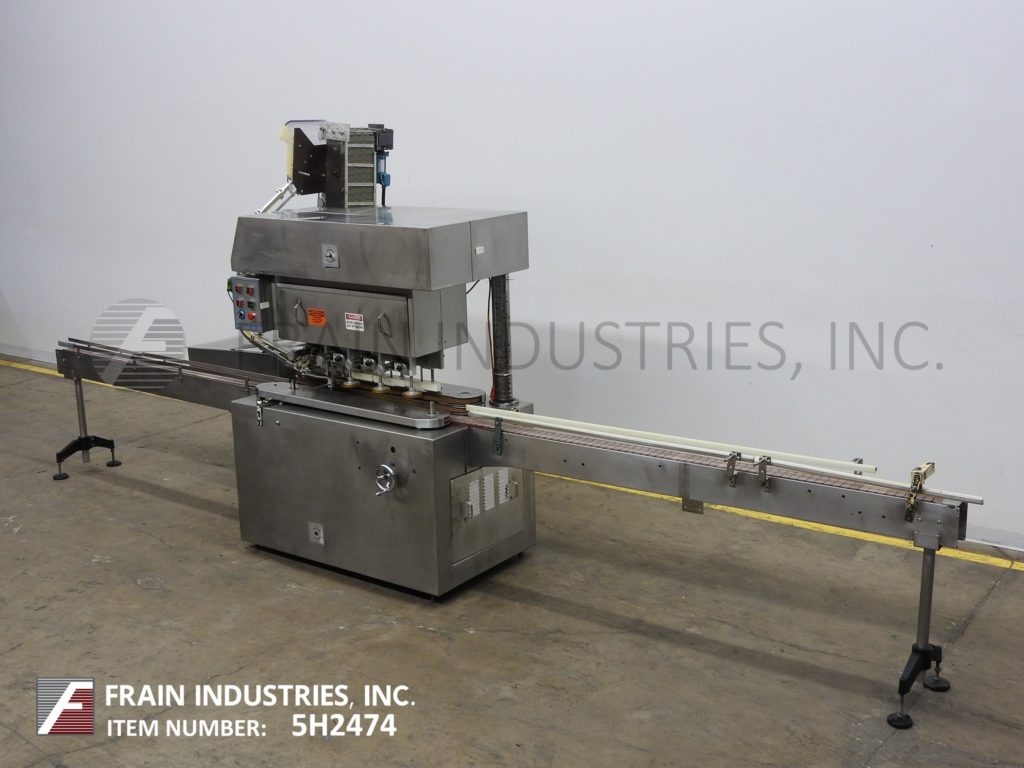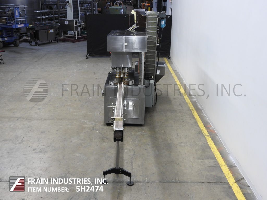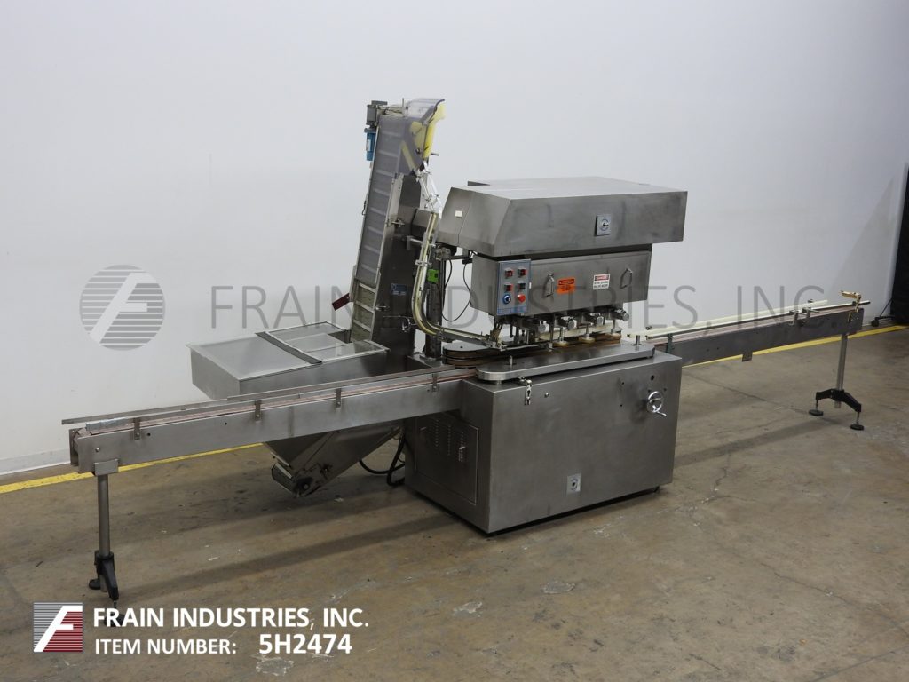 返回所有设备卡尔克莱门特,U4型,自动,内联,不锈钢,4站(8主轴)给料机,压盖机和输送机。额定每分钟10到90个容器-取决于材料,应用和机器配置。瓶盖尺寸范围:直径25毫米至110毫米。配有瀑布风格帽分选机35”长x 30“宽x 24“深料斗和9“宽x 70“长皮带上设置5½”中心,可调帽斜槽,4½“宽x 240”长缩醛树脂带,52“长双容器爪腰带,(4)可调轴站和弹簧瓶压低。控制面板有按钮启动/停止控制和变速控制。