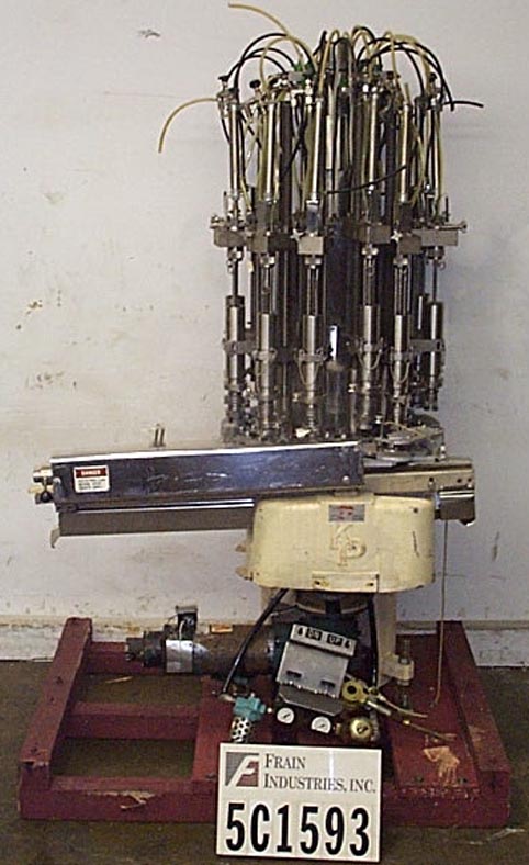 Back to All EquipmentKartridgPak Model 124-42-12 a fully automatic 12 head rotary open can product filler capable of speeds of 25 cpm per head or 300 cans per minute. Has a fill range of: 4 – 550cc with Changeparts, Currently set up with 250cc fill heads. Container size range of (with proper change parts): HEIGHT 2.38" – 12.25" (61mm – 311mm) x DIAMETER 1.375" x 3.00" (35mm – 76mm). No can no fill. (OAD: 60"L x 54"W x 84"H).