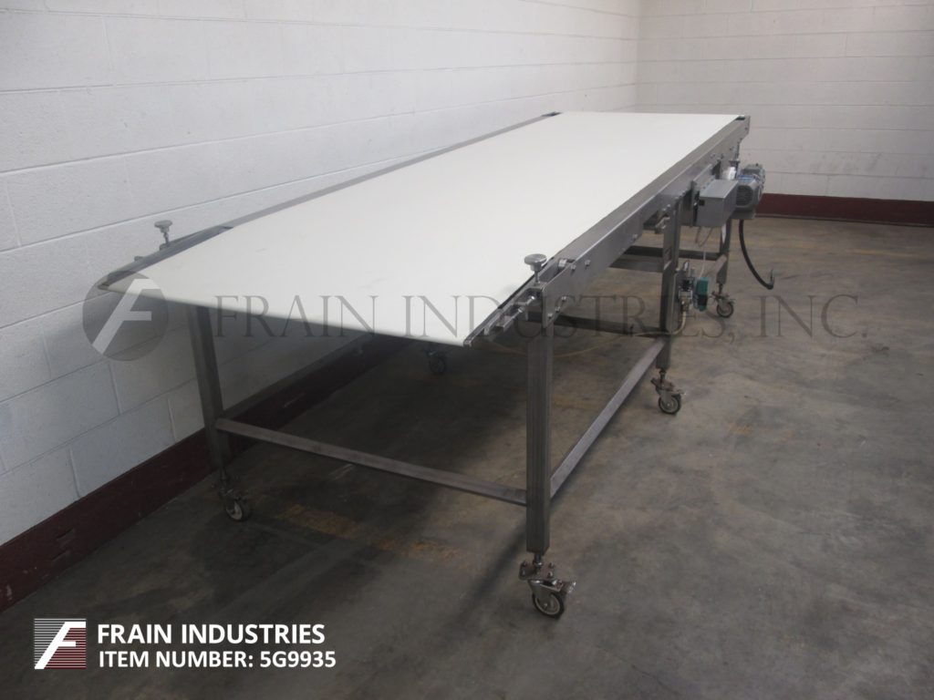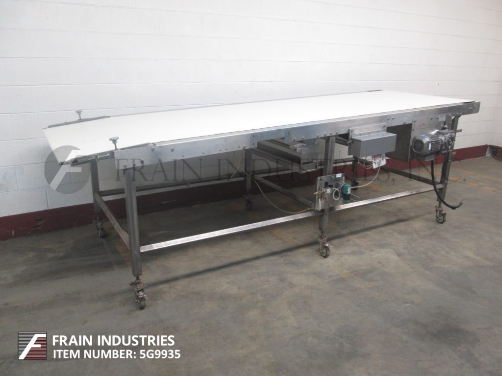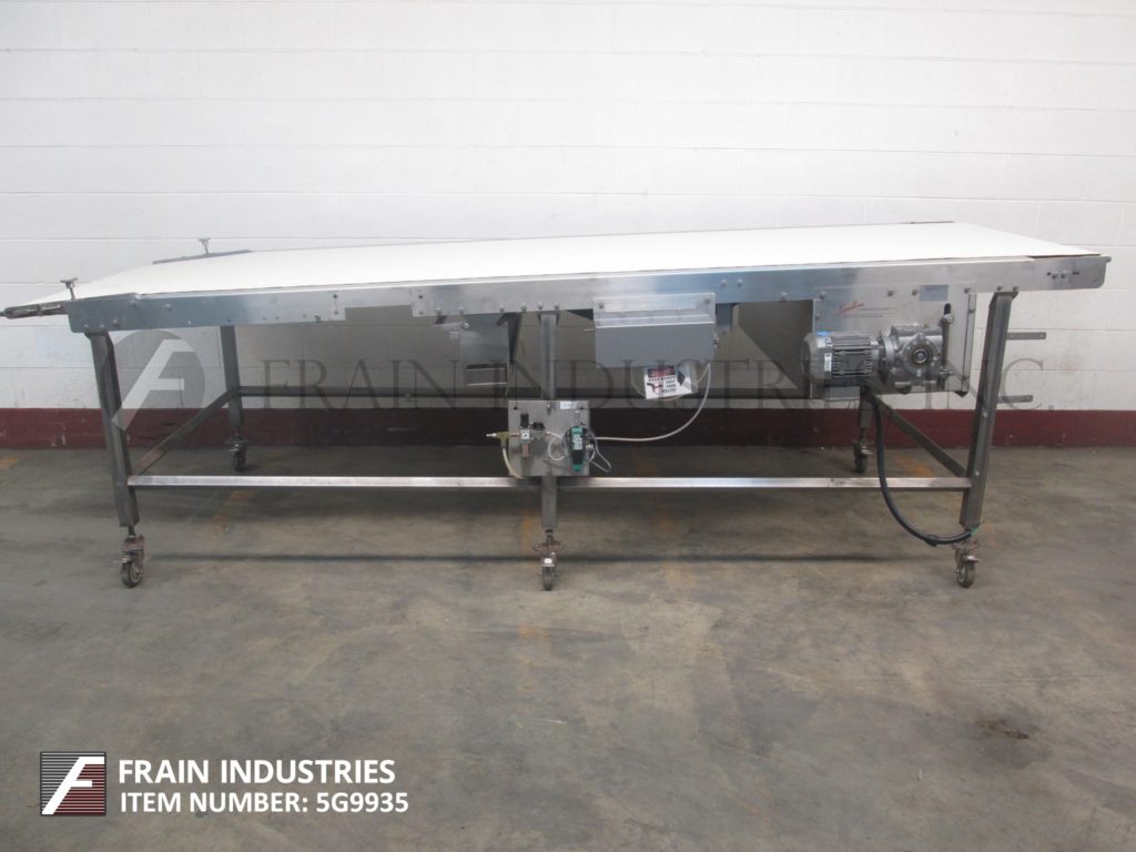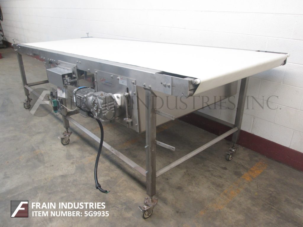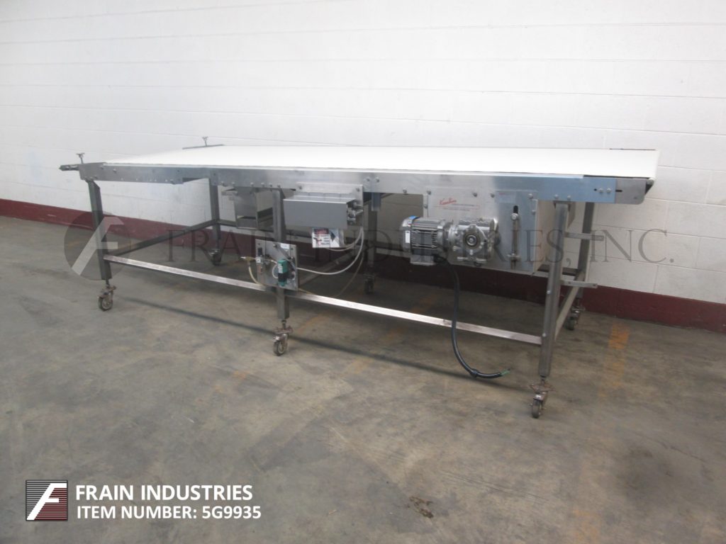 基恩线,42“宽x 141”长,氯丁橡胶带式输送机。配备42英寸宽x 141英寸长的皮带,由3 / 4马力驱动,35英寸到40英寸的进料范围,43英寸到48英寸的排放范围,气动皮带张紧器,安装在(6)腿不锈钢框架与脚轮。