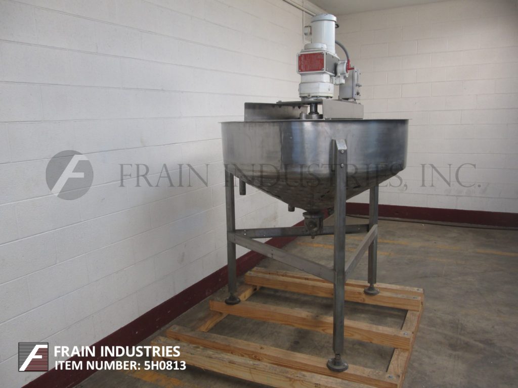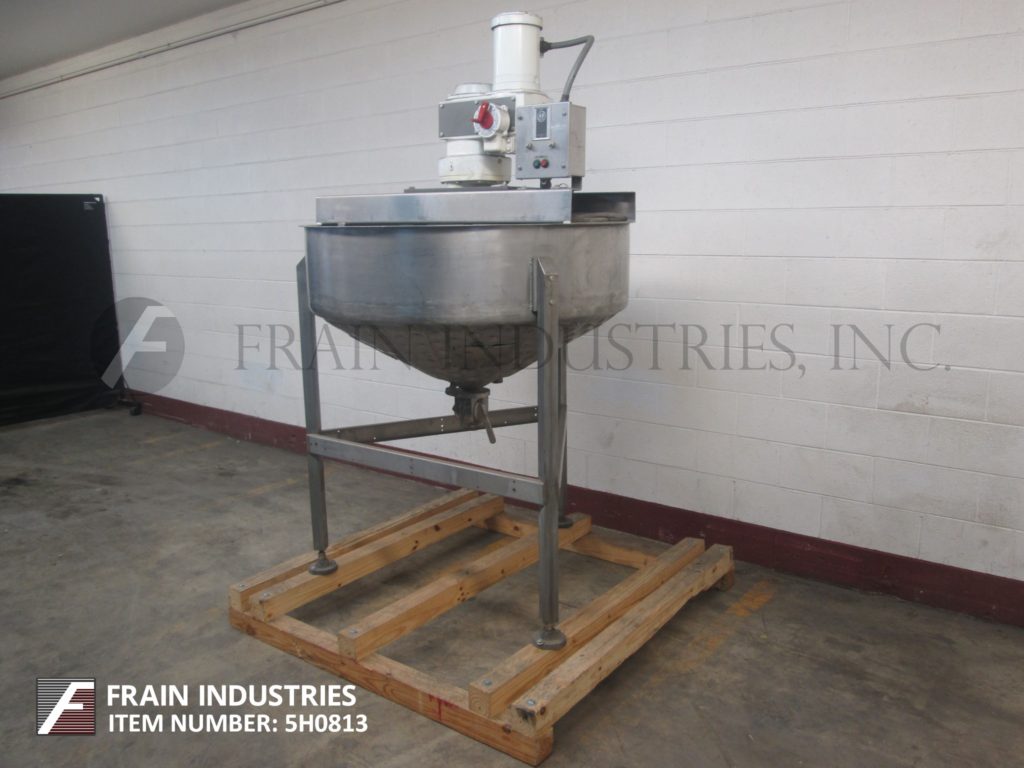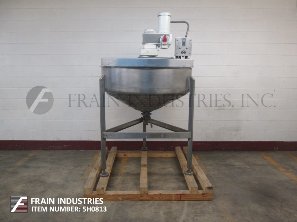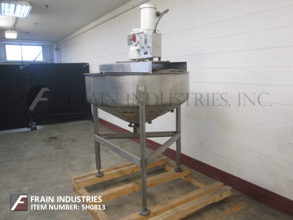 返回所有设备120加仑容量,304不锈钢,低压夹套锅冷却器。容器尺寸:48"直径x 24"深,12"直壁和锥形底部。配备3 / 4马力桥式刮板搅拌器和2½”外径/ 1¾”内径阀座斜面式底部排放,带有流量阀和24”地面间隙。控制箱带有按钮启动/停止。安装在(3)腿上。